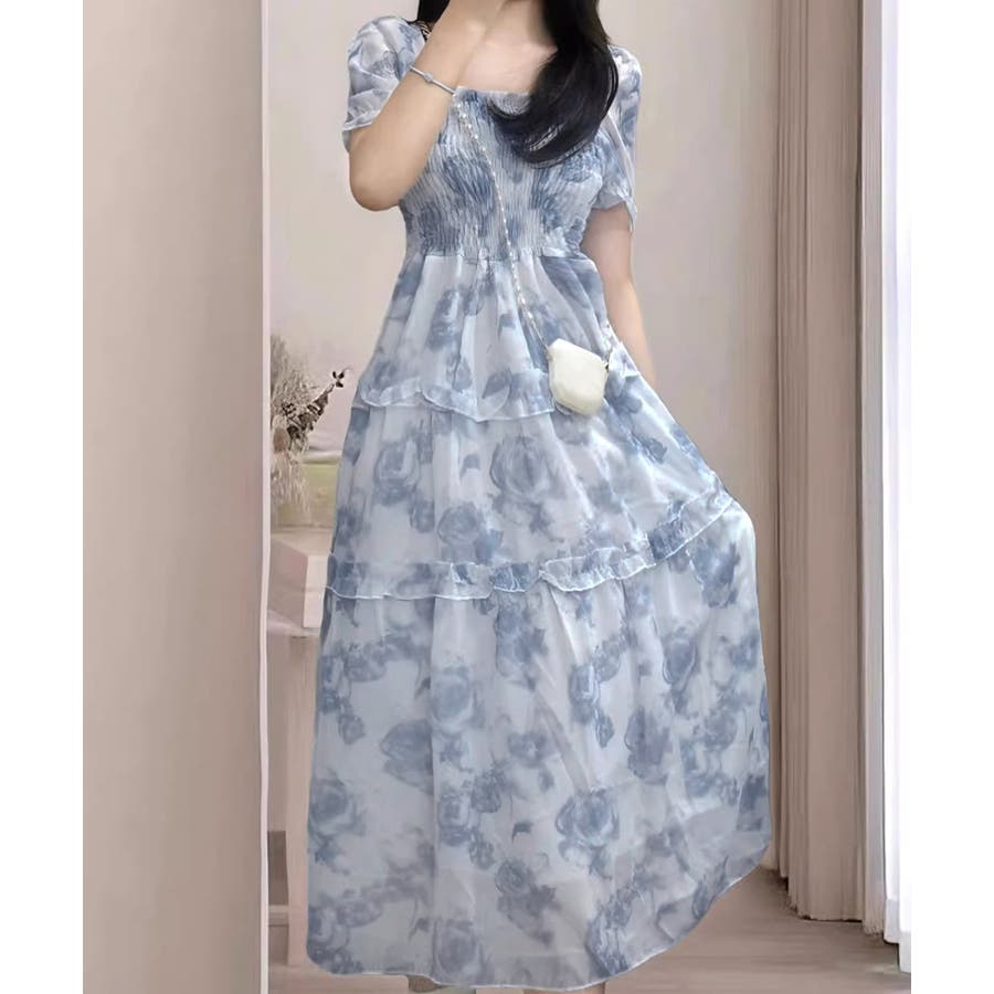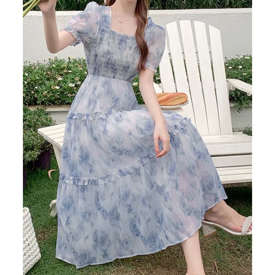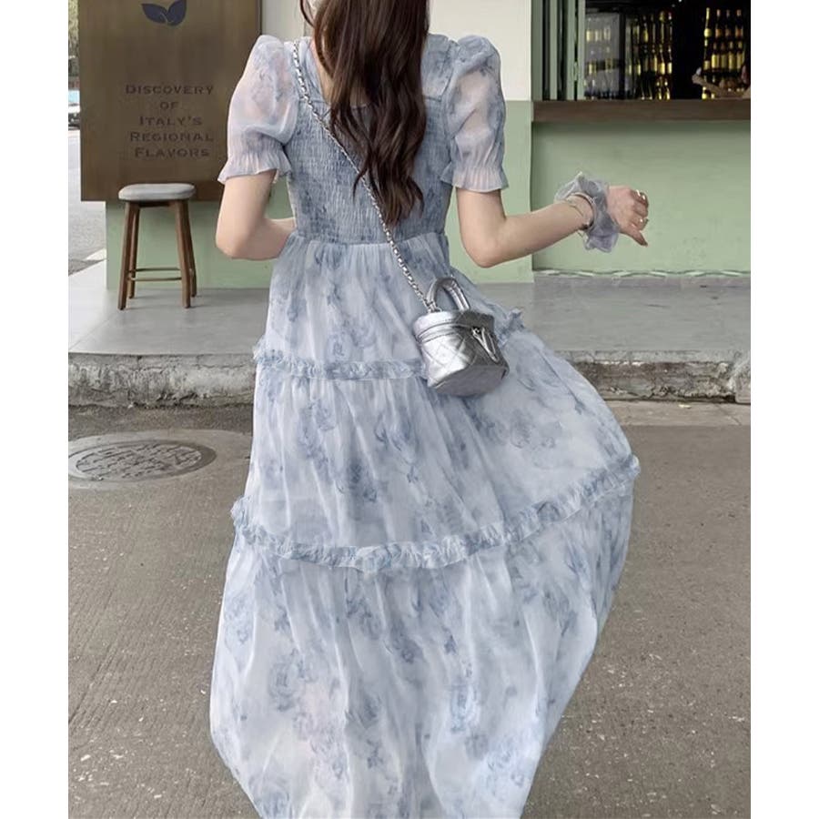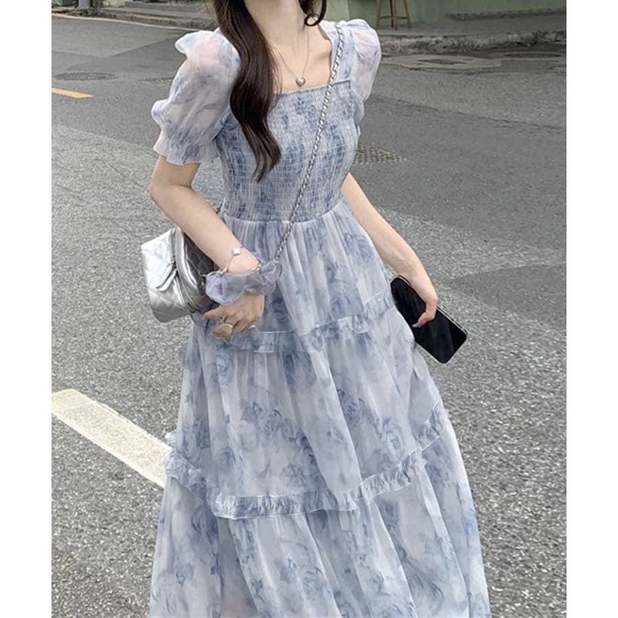 夏ワンピース細見え フレアワンピ韓国風 パフスリーブワンピ