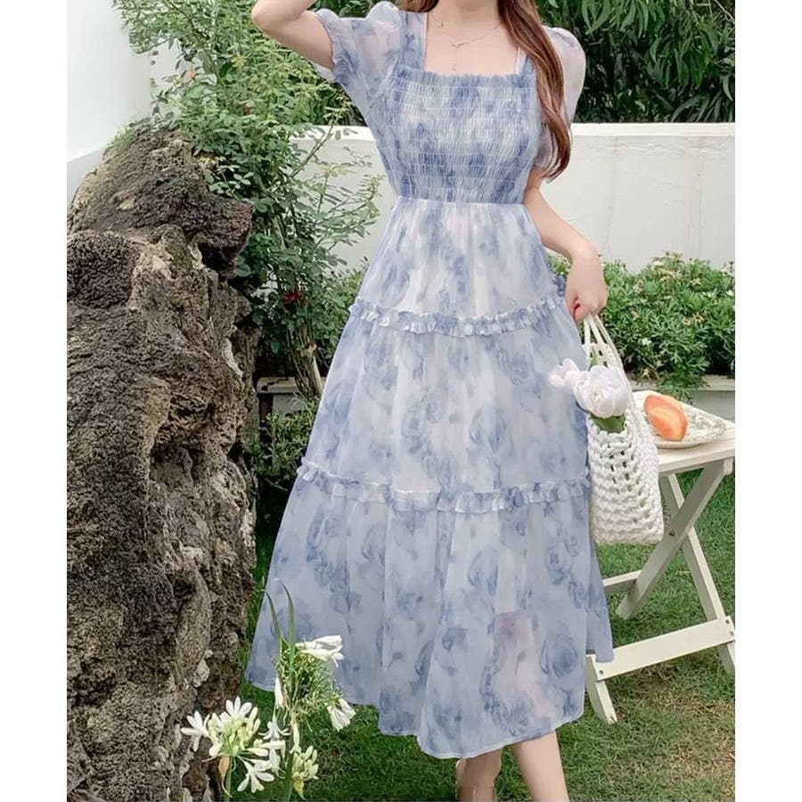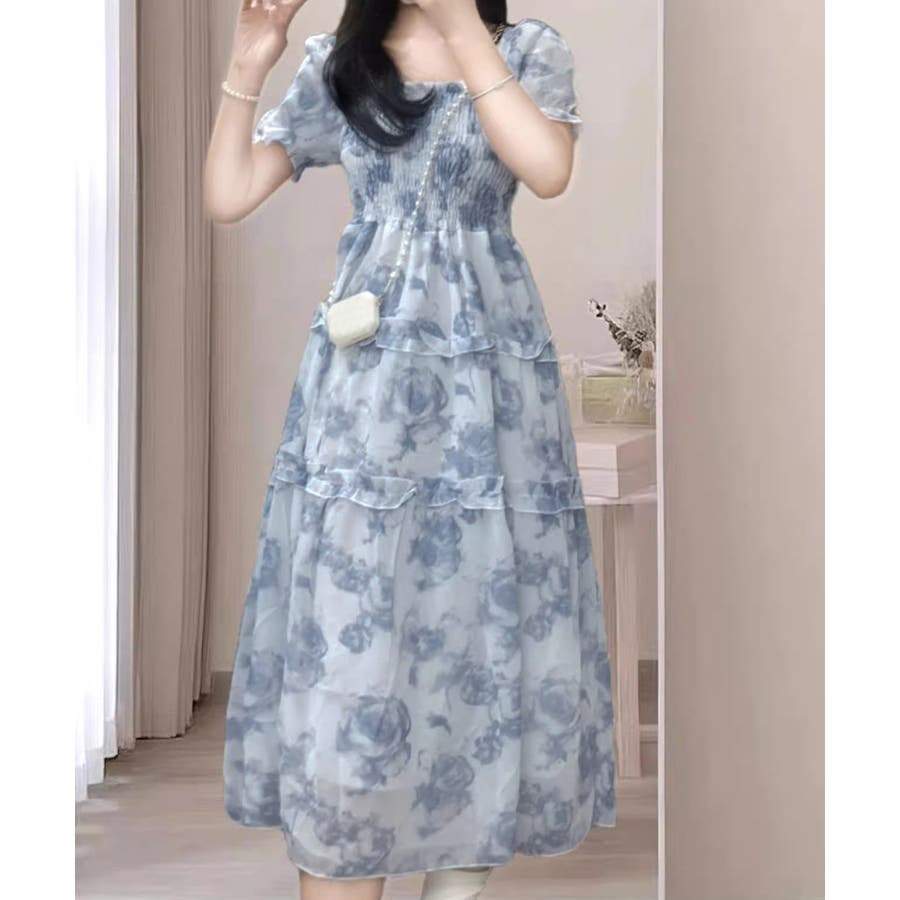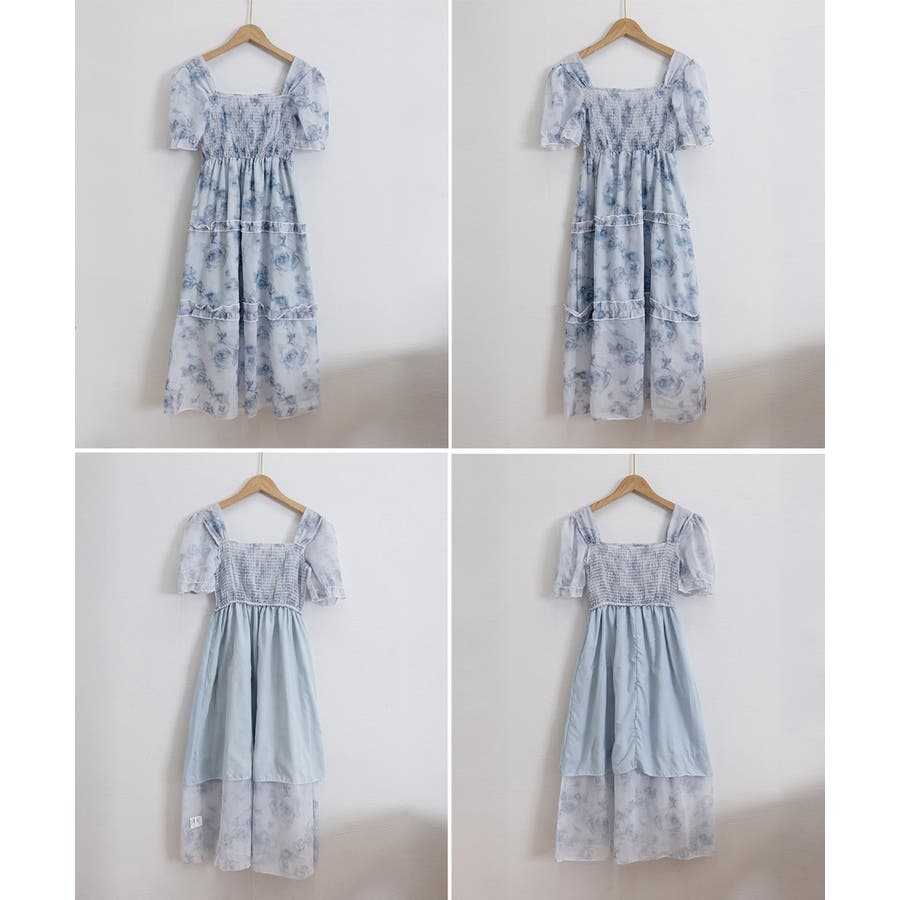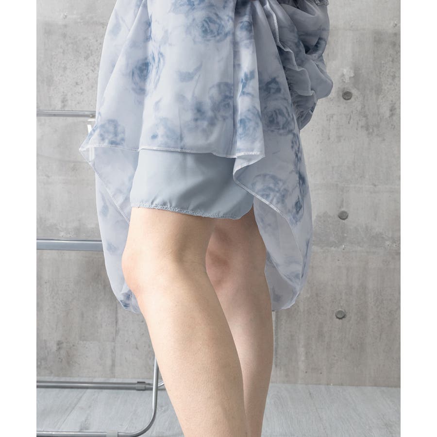 動くたびに軽やかに揺れるシフォンが可愛い花柄ミディアム丈ワンピース。
