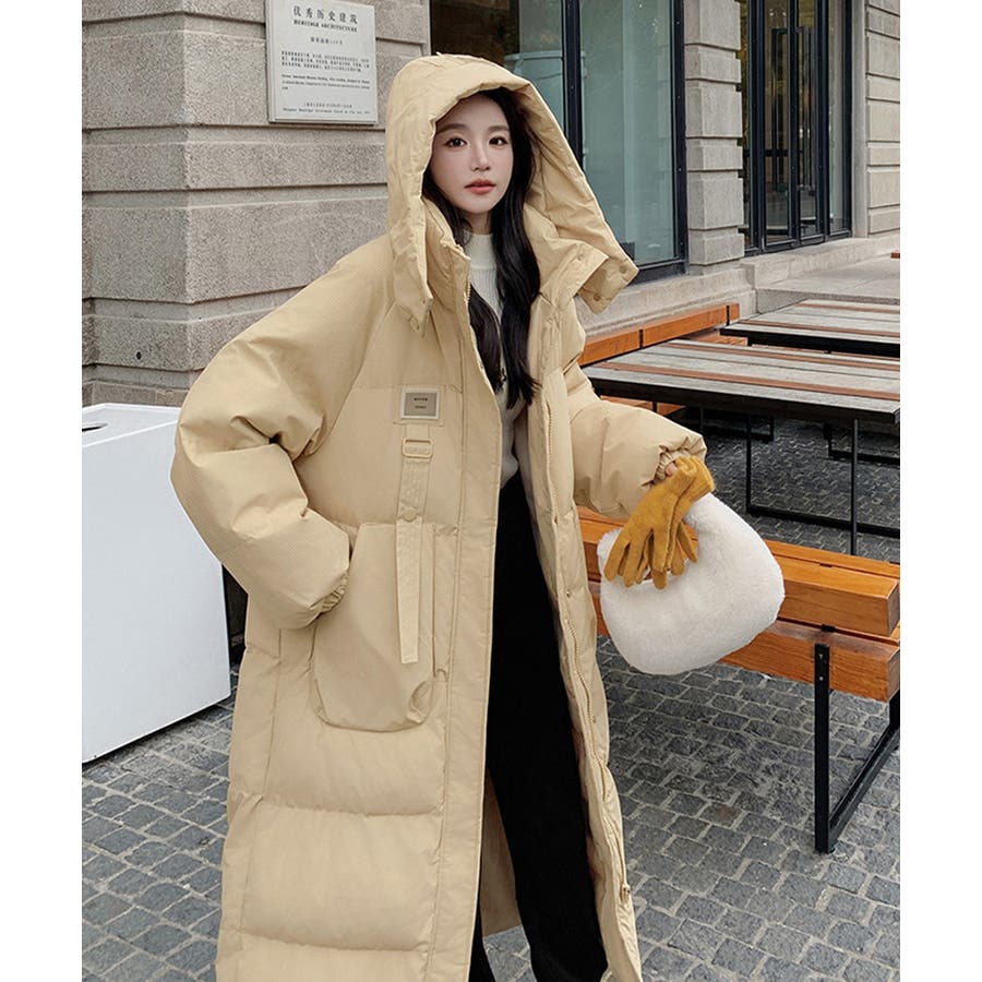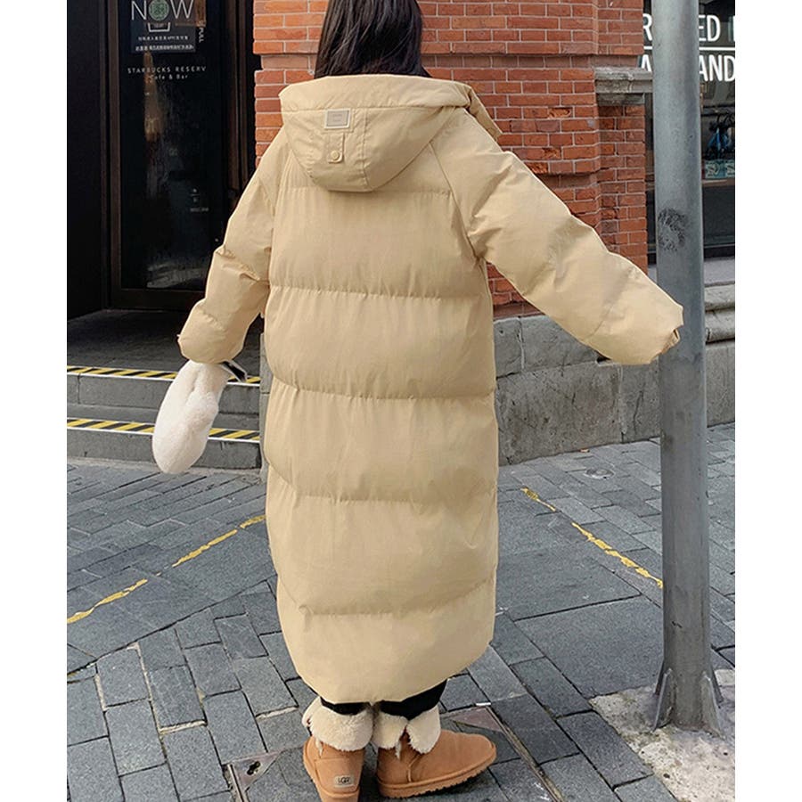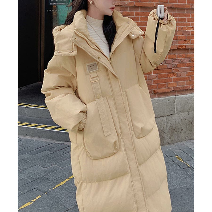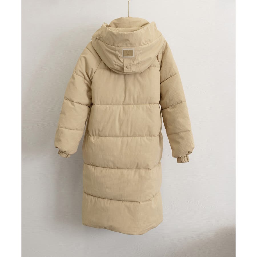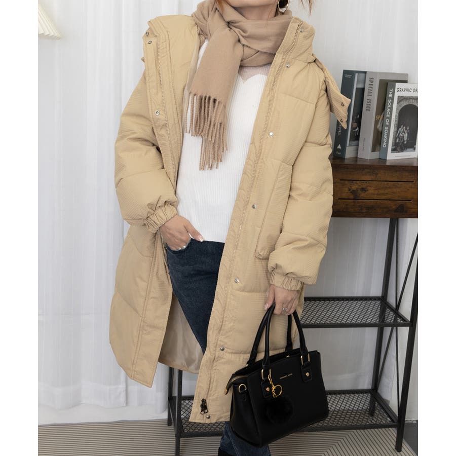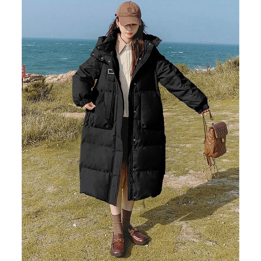 すっぽりハイネックとフード付きで暖かく、ゆったりめのエコダウンロングコート