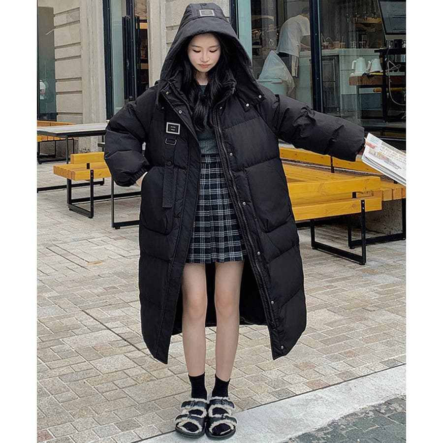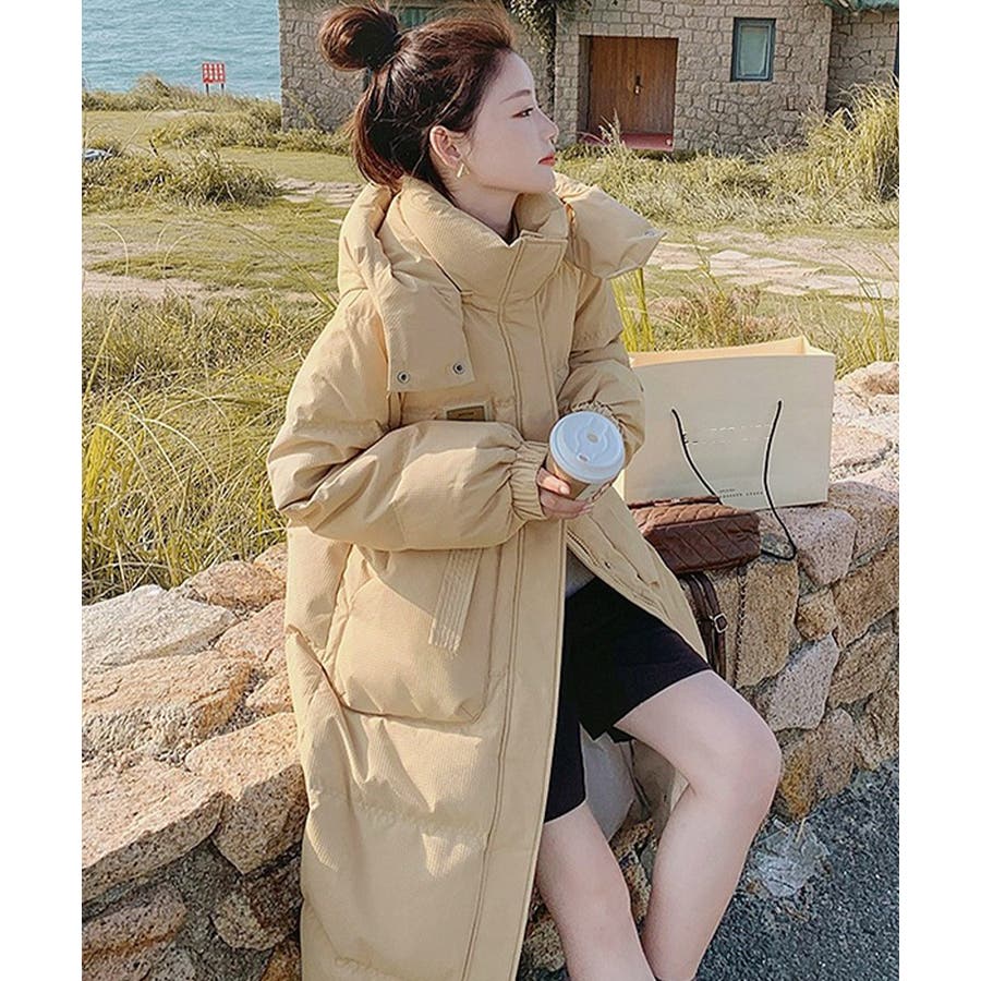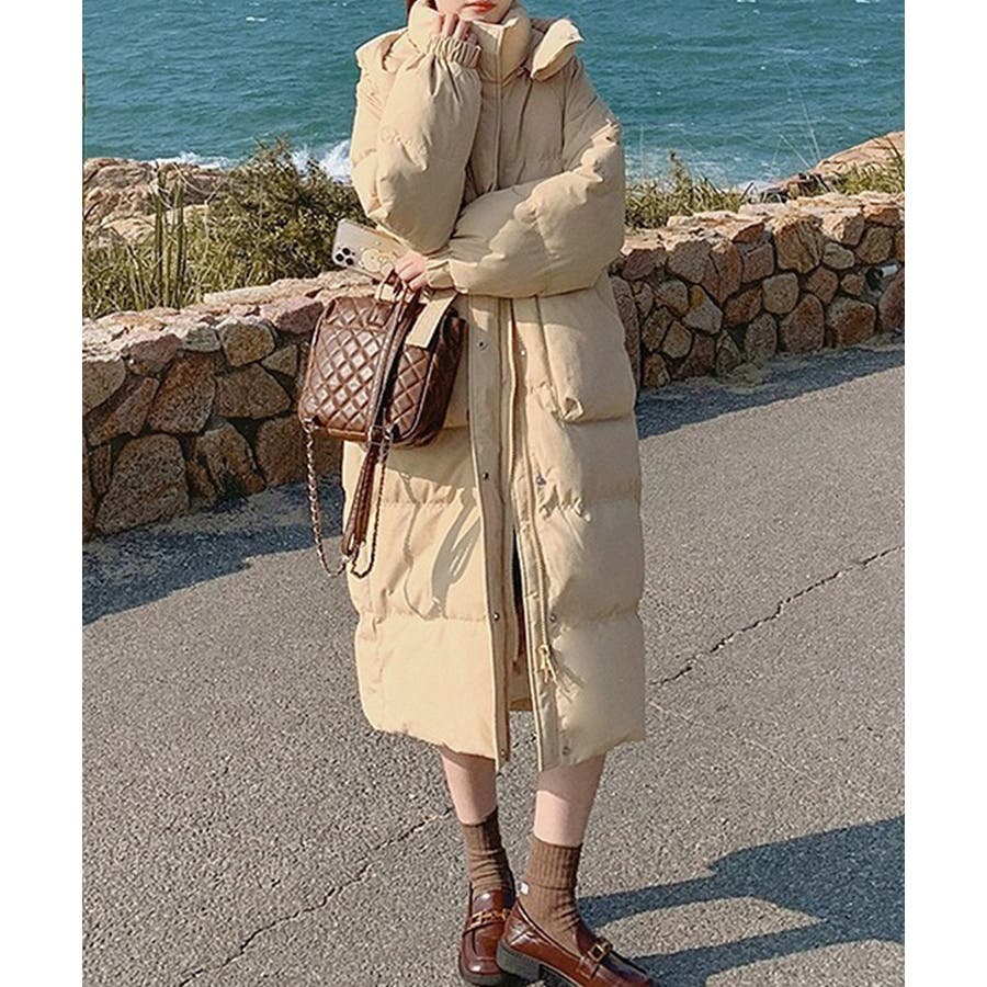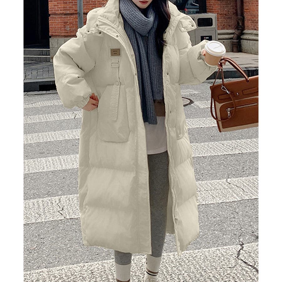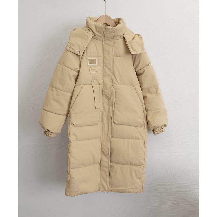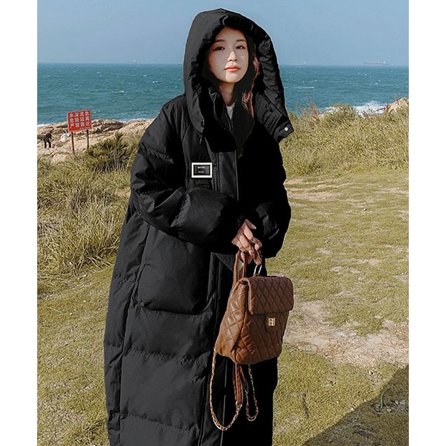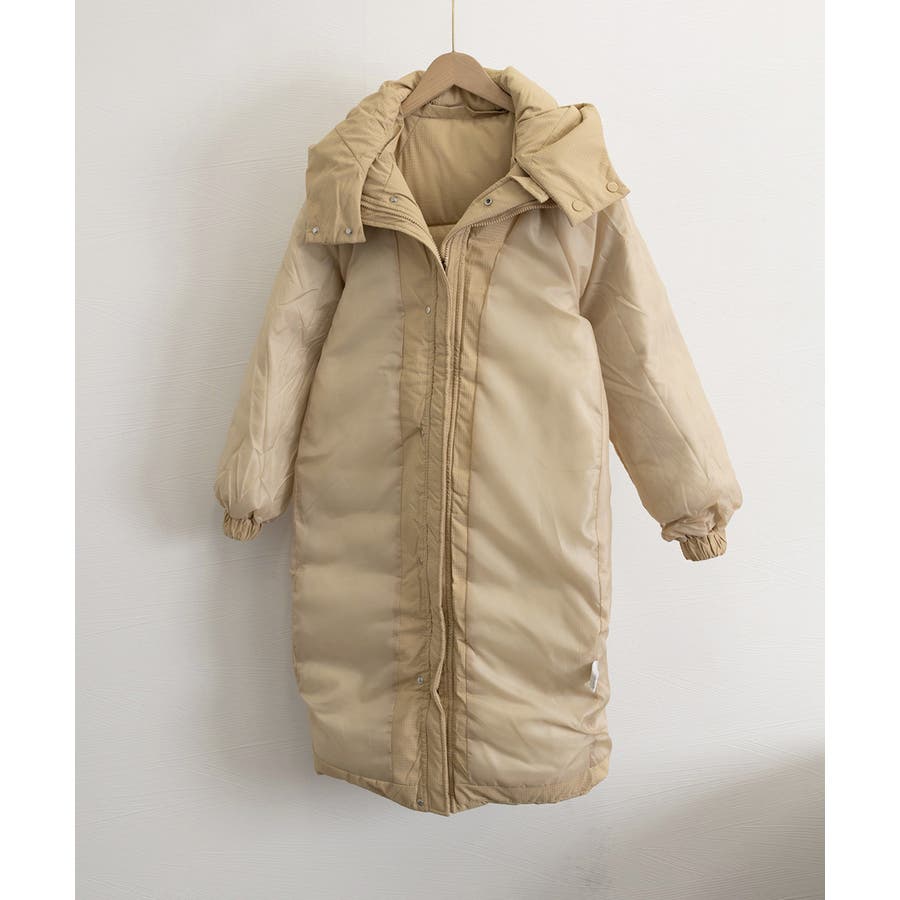 すっぽりハイネックとフード付きで暖かく、ゆったりめのエコダウンロングコート