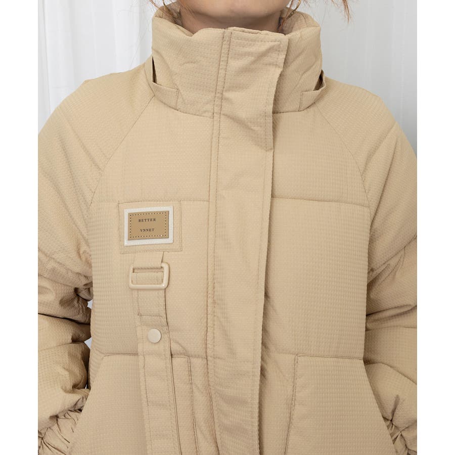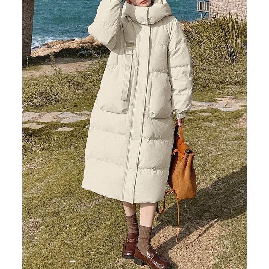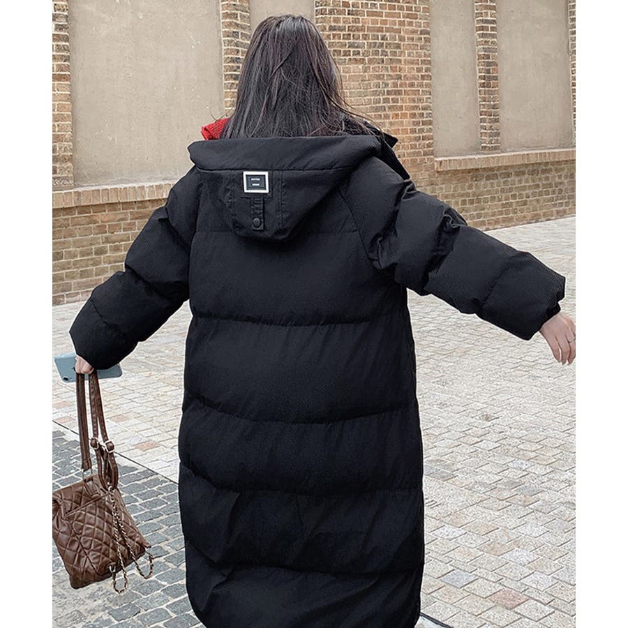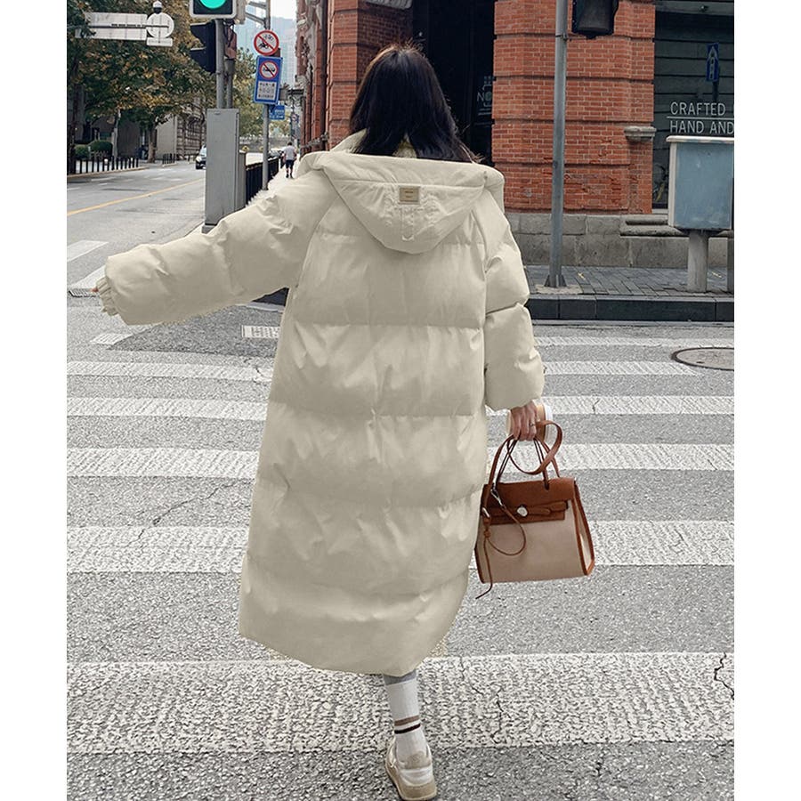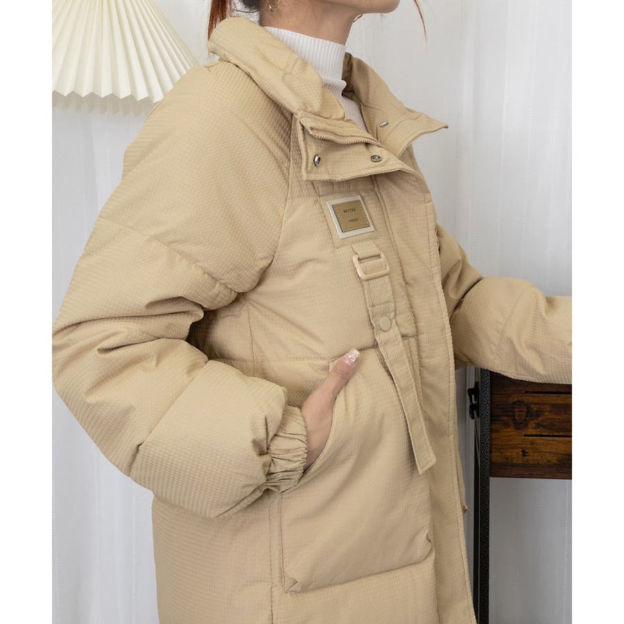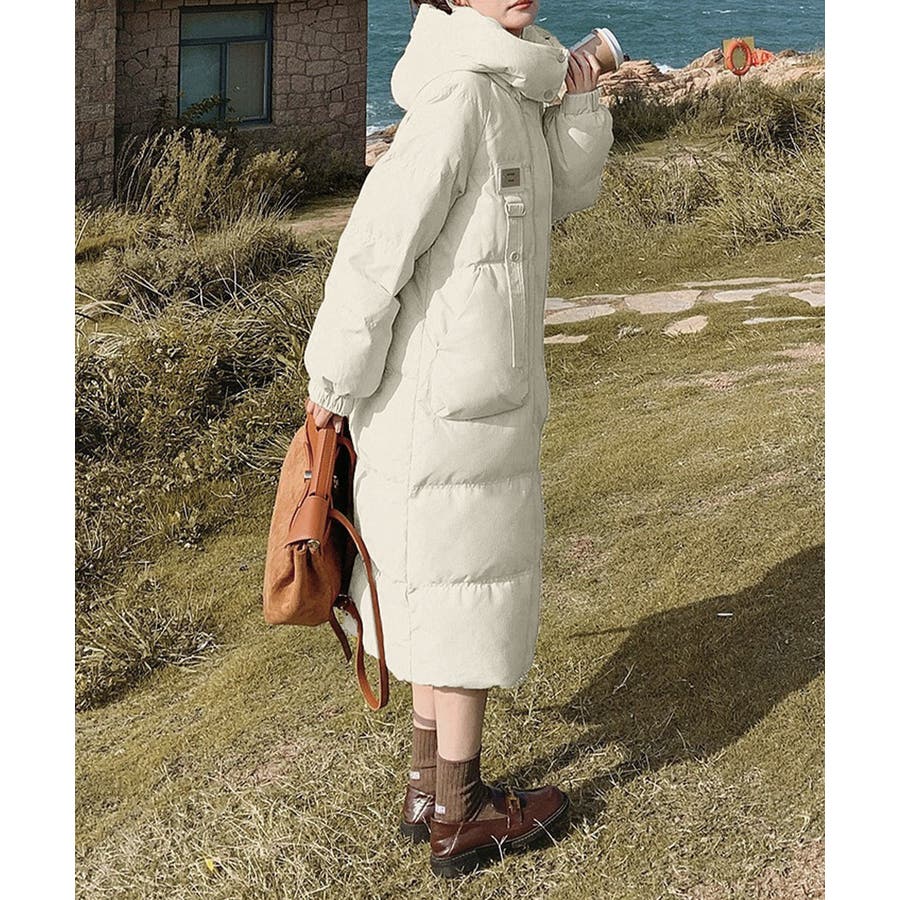 すっぽりハイネックとフード付きで暖かく、ゆったりめのエコダウンロングコート