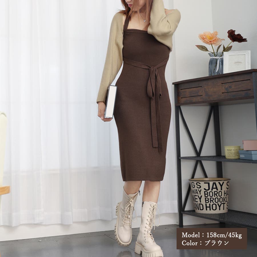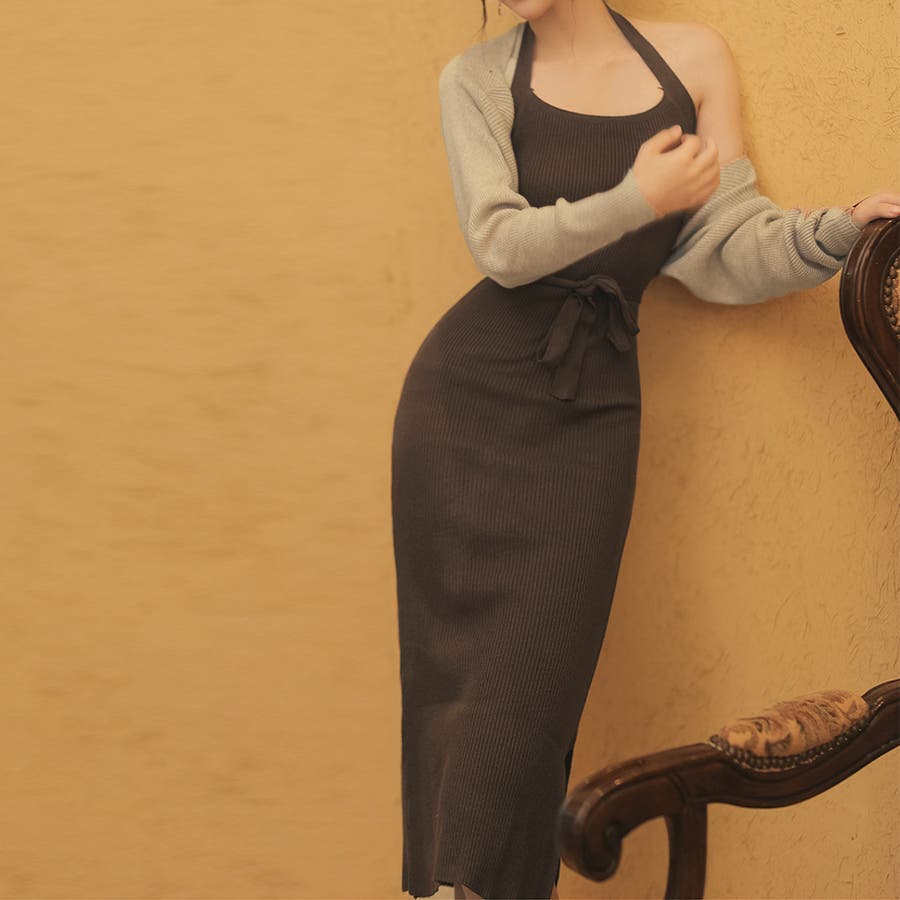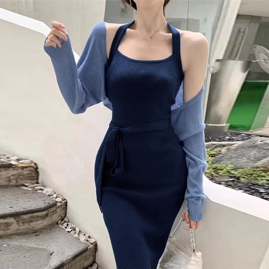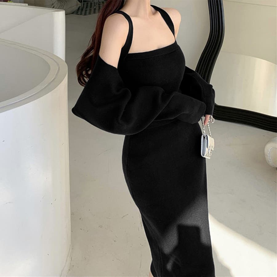 ボレロ風ショートカーデにタイトめキャミワンピがフェミニンな印象を与える韓国DESIGNのリブニット2点セット