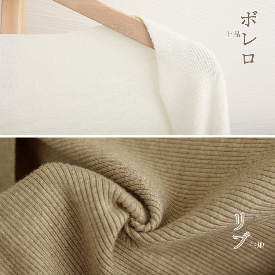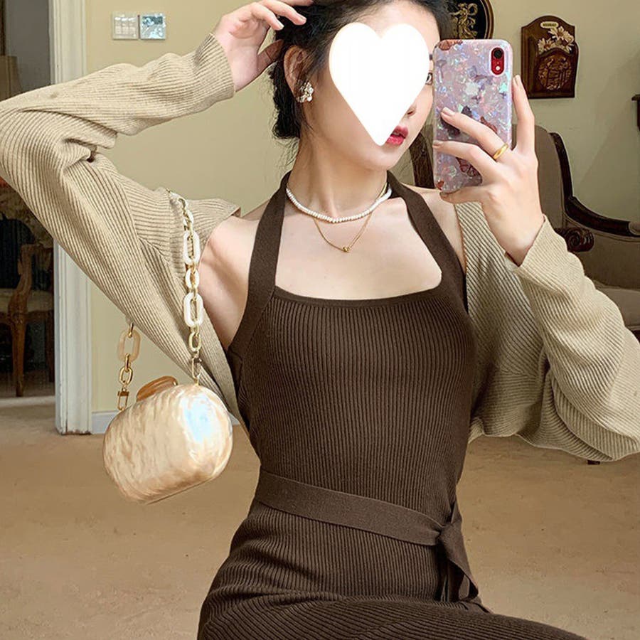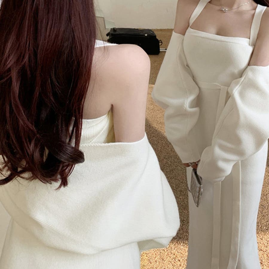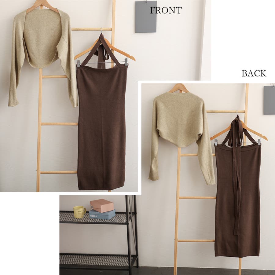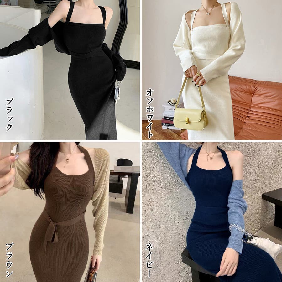 ボレロ風ショートカーデにタイトめキャミワンピがフェミニンな印象を与える韓国DESIGNのリブニット2点セット