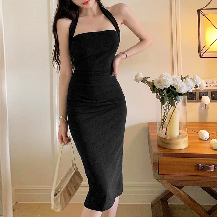 ホルターネック秋冬 ボディコンワンピ黒 大人セクシーお洒落