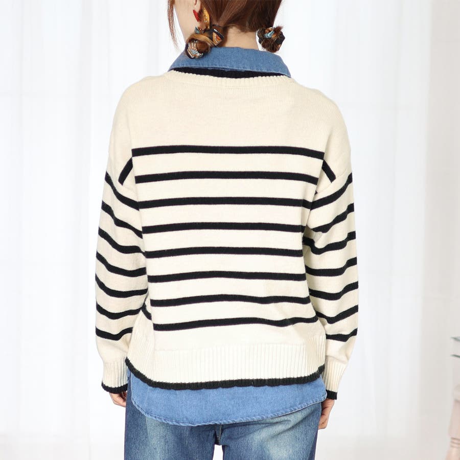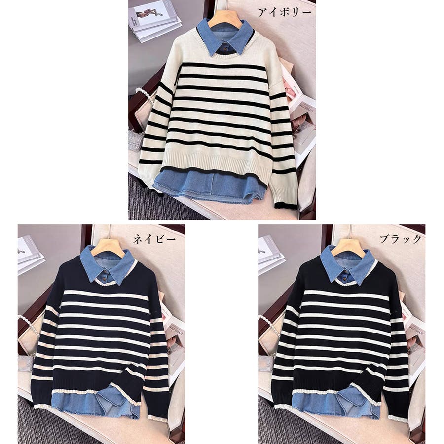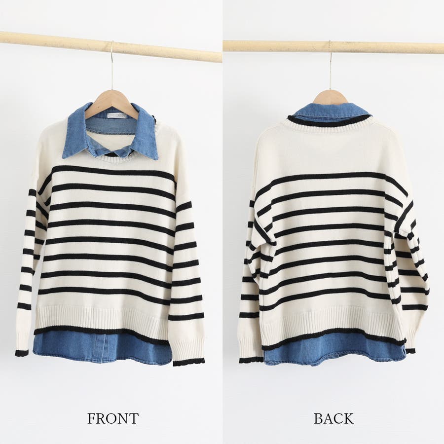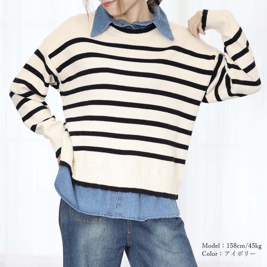ボーダー柄ニット素材に重ね着風にドッキングした襟元と裾デザインがトレンド感満載のドロップショルダー切り替えトップス