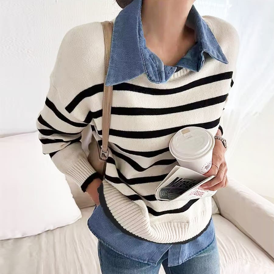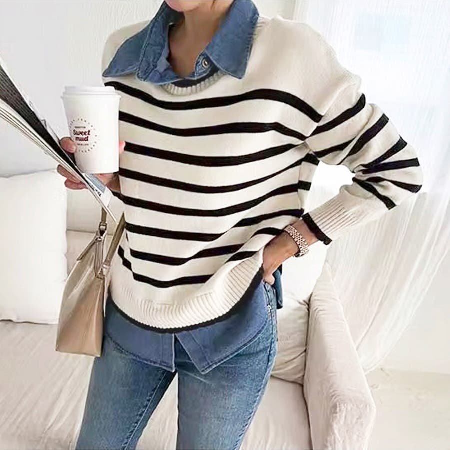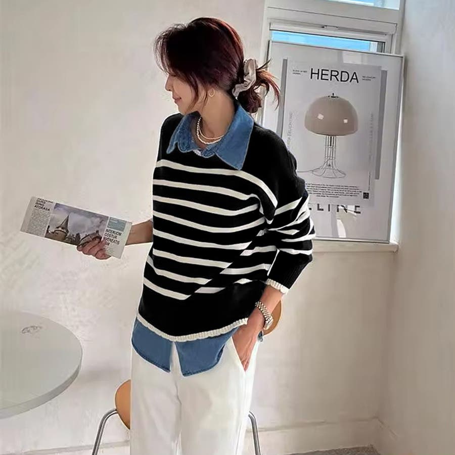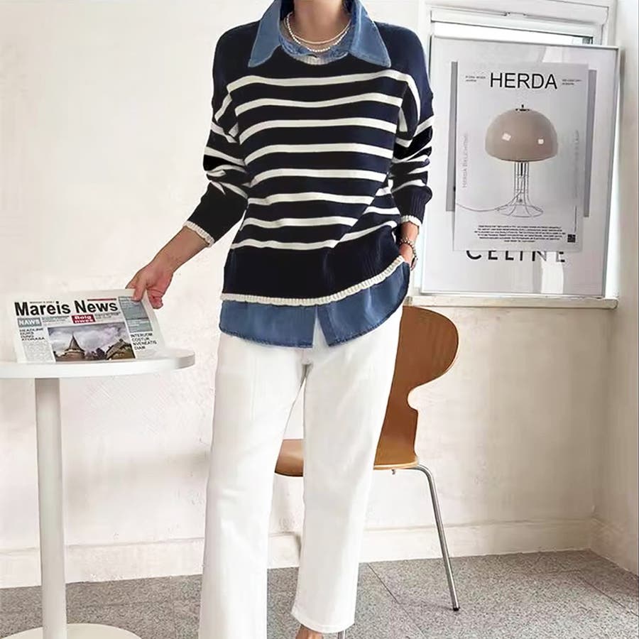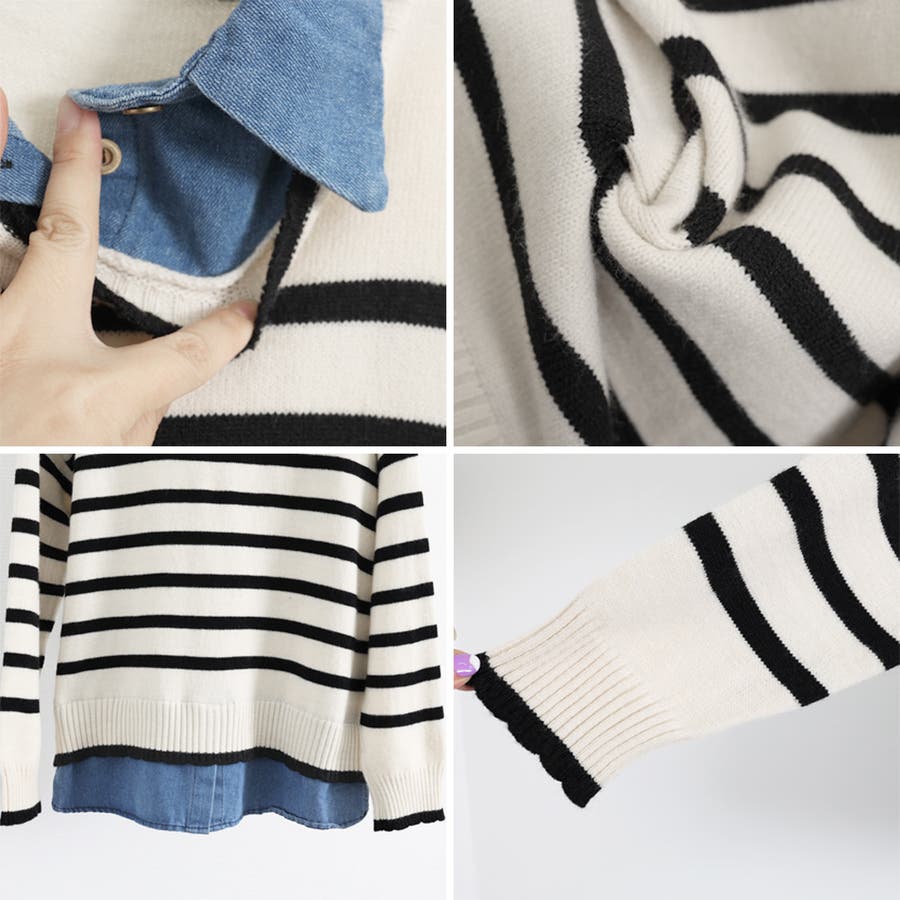 ボーダー柄ニット素材に重ね着風にドッキングした襟元と裾デザインがトレンド感満載のドロップショルダー切り替えトップス