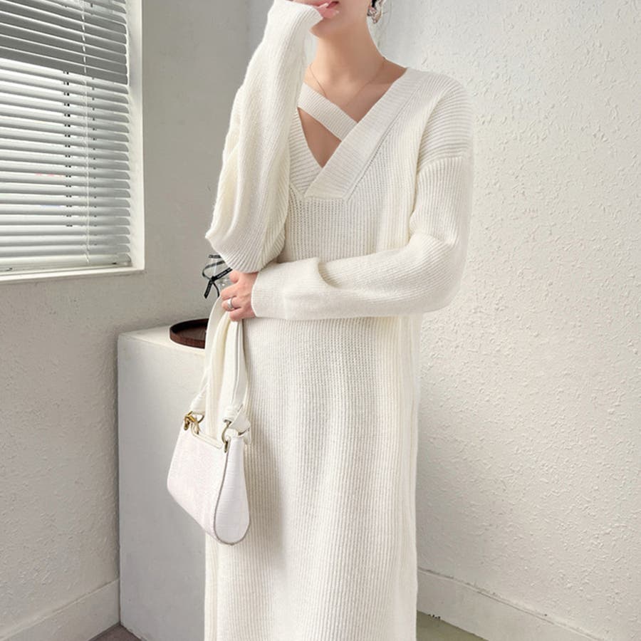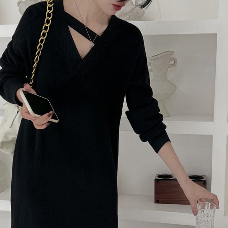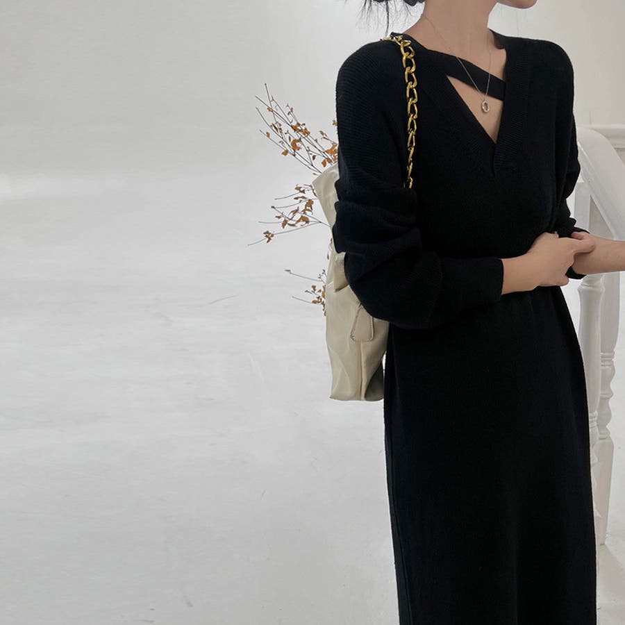首元のストラップデザインは露出度を控えて、シンプルさにも遊び心をプラスしてベーシックなのにおしゃれなロング丈ニットワンピース