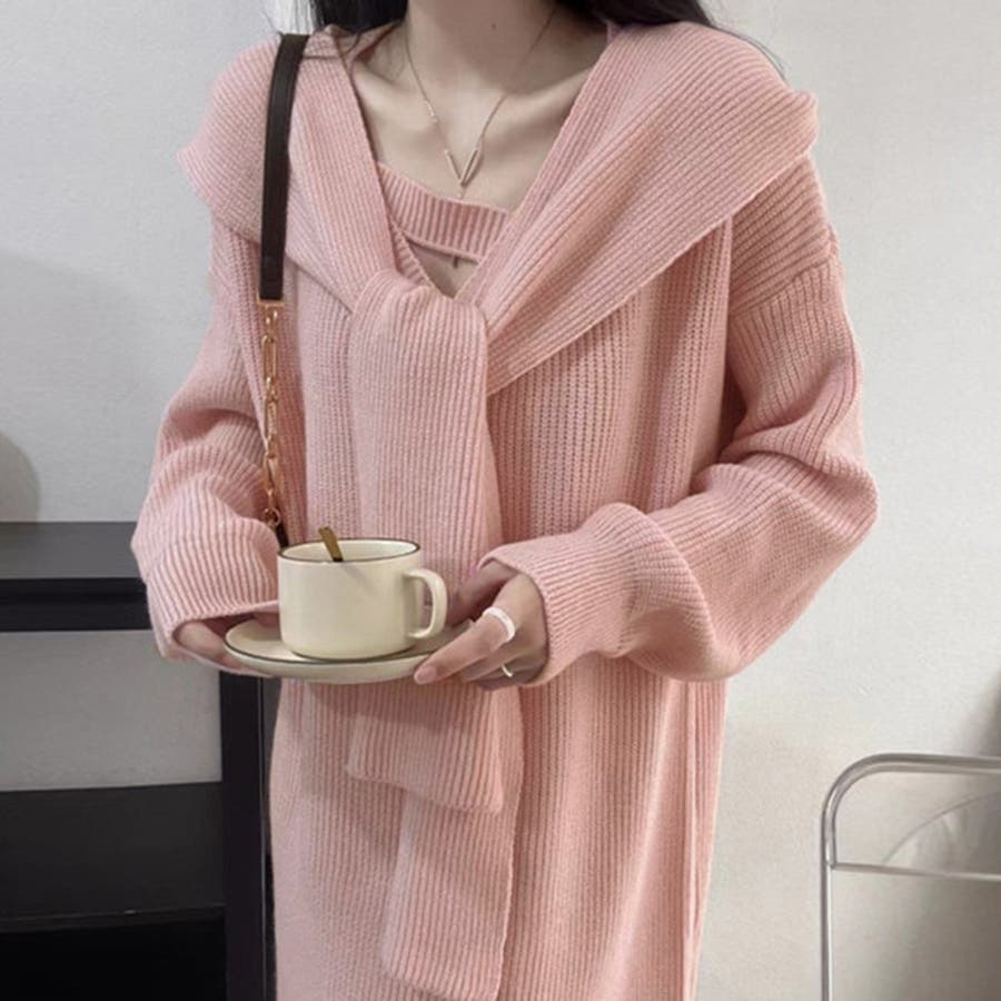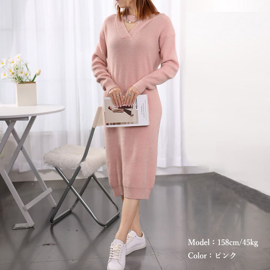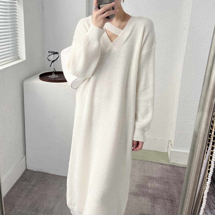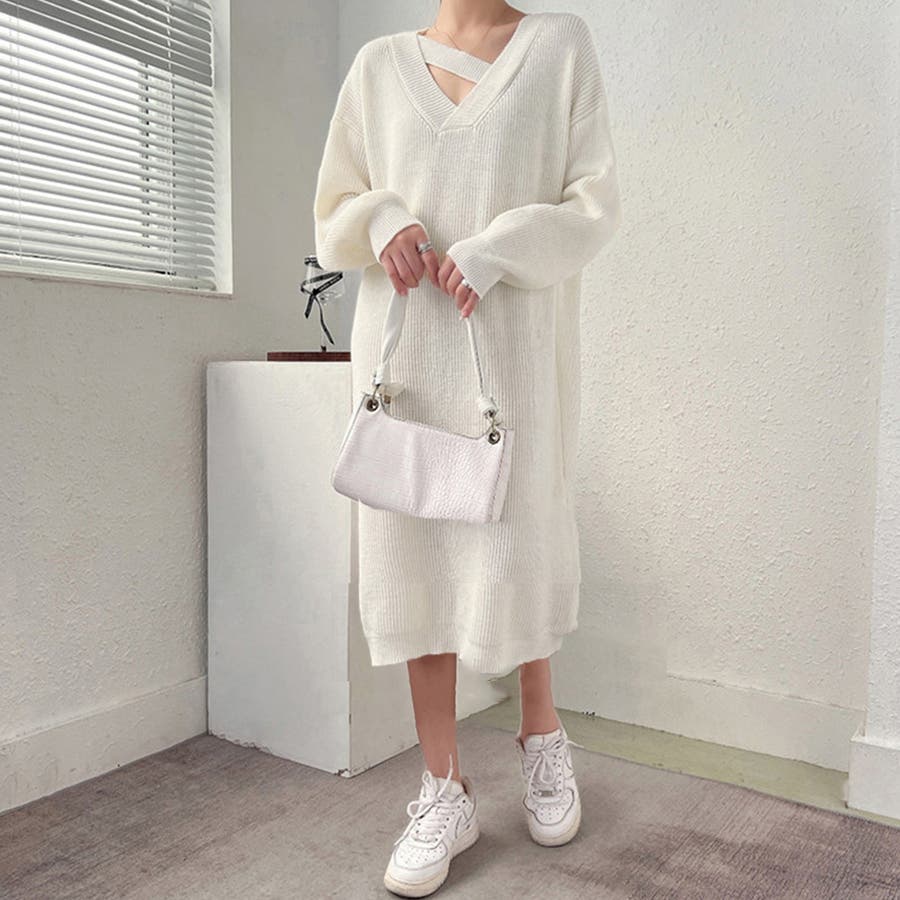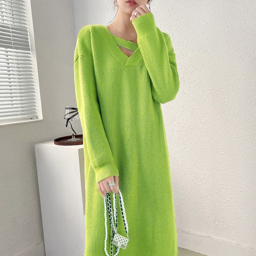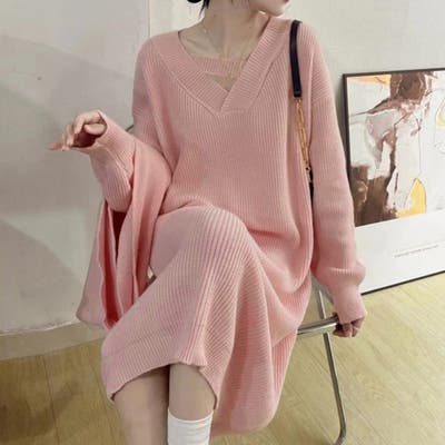 ネックストラップワンピース ドロップショルダーニット vネックワンピース 上品 ゆったりワンピース おしゃれ 体型カバー