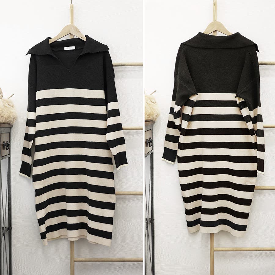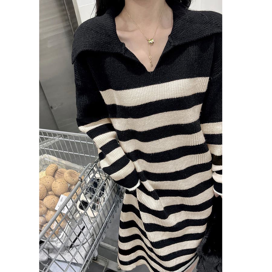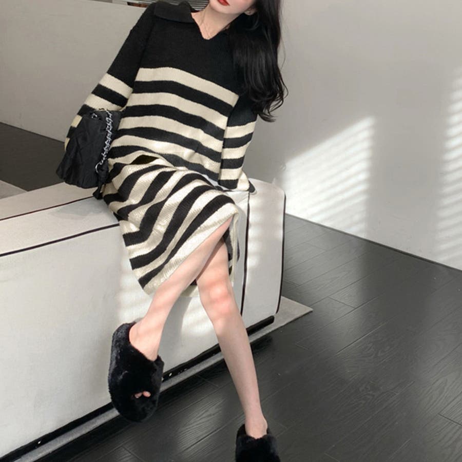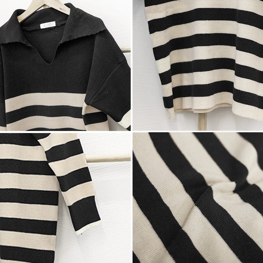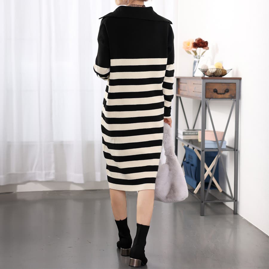 大きな折り襟にVネックデザインでお顔周りをすっきり見せ、モノトーンで柄物でもスタイリッシュなボーダー柄ニットワンピース