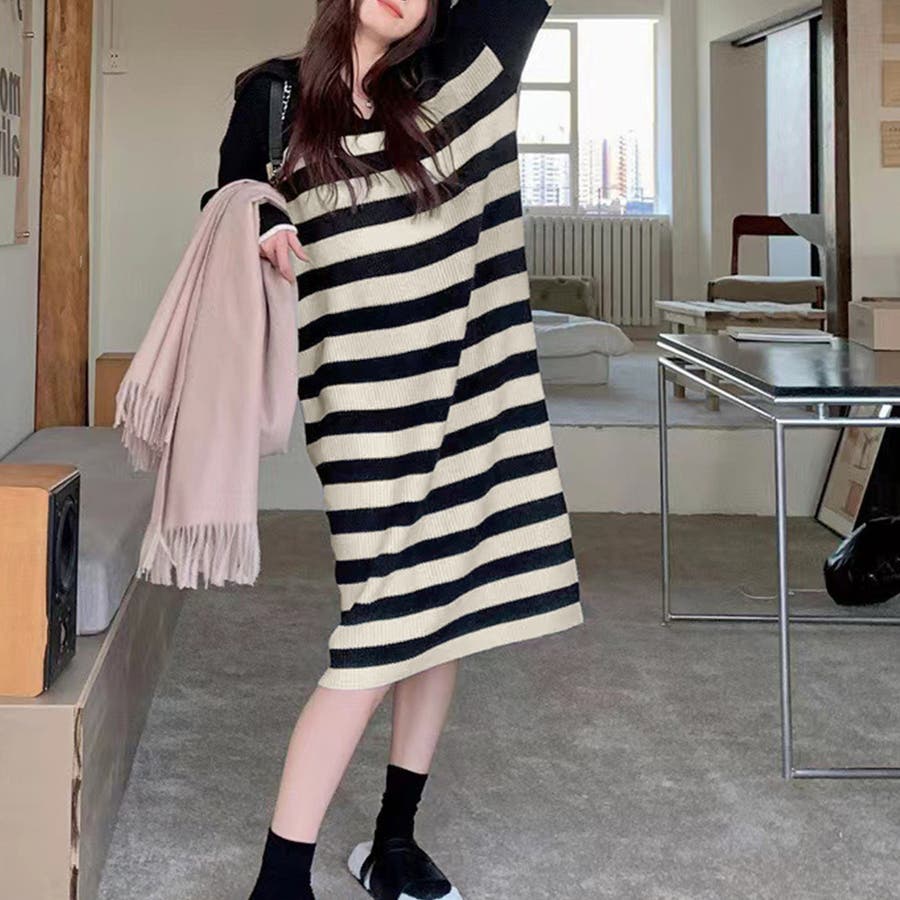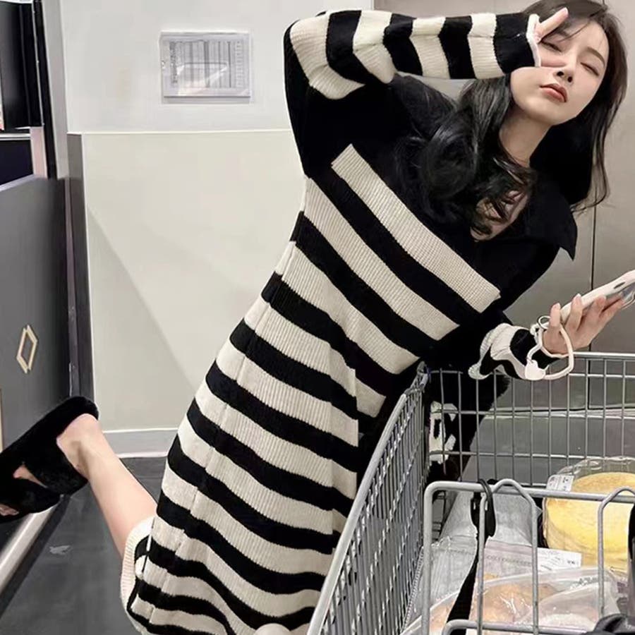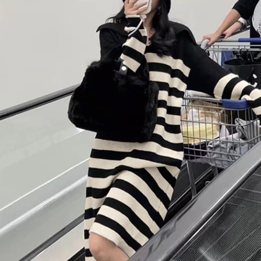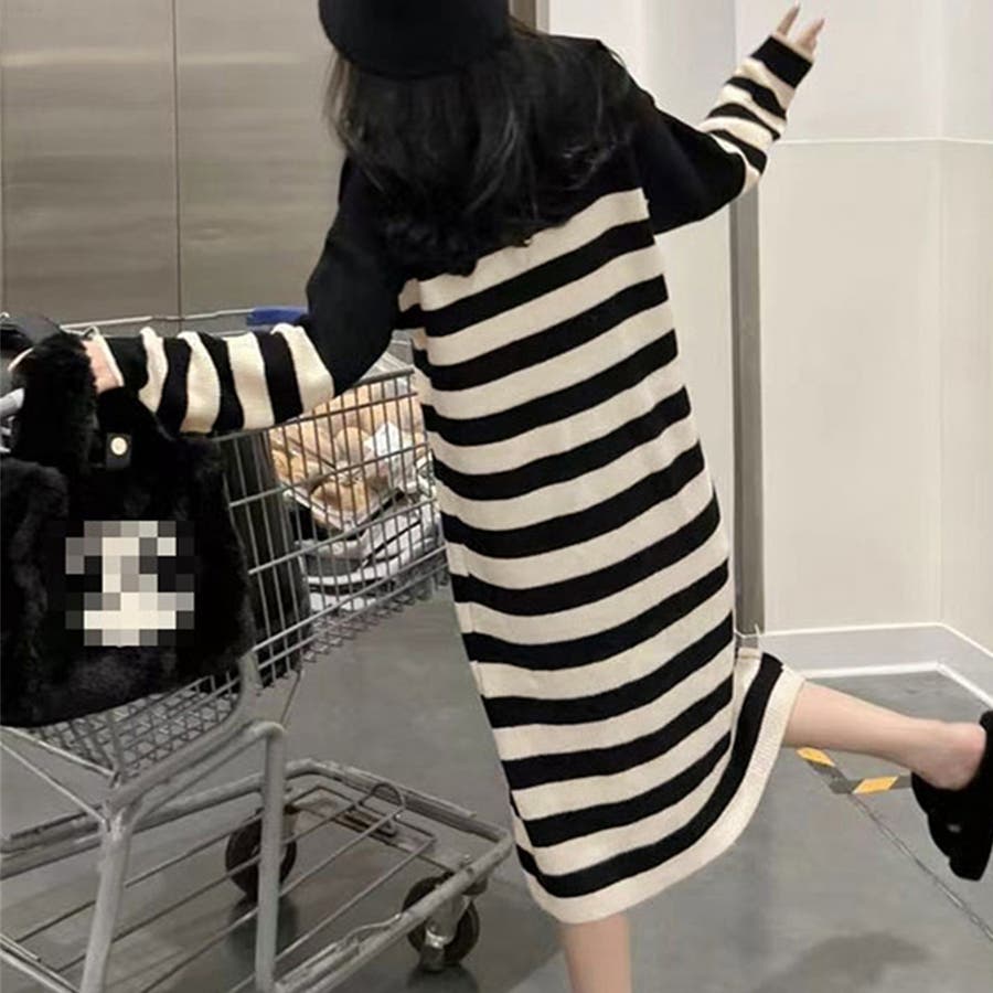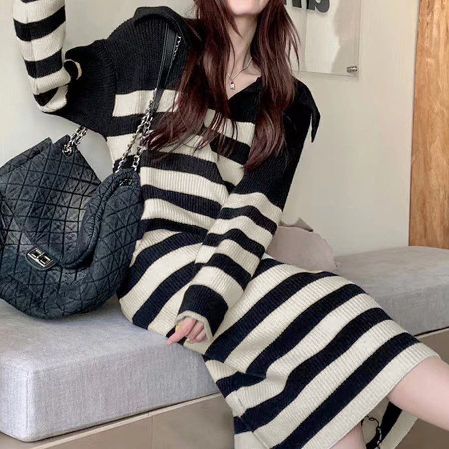 大きな折り襟にVネックデザインでお顔周りをすっきり見せ、モノトーンで柄物でもスタイリッシュなボーダー柄ニットワンピース