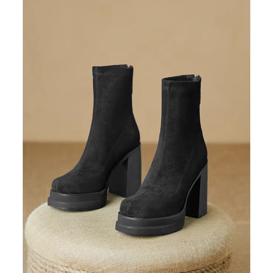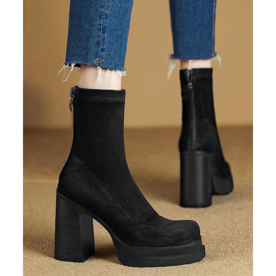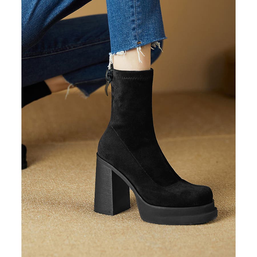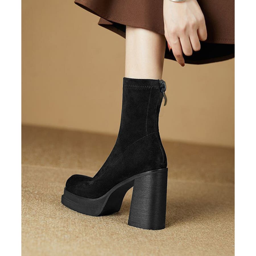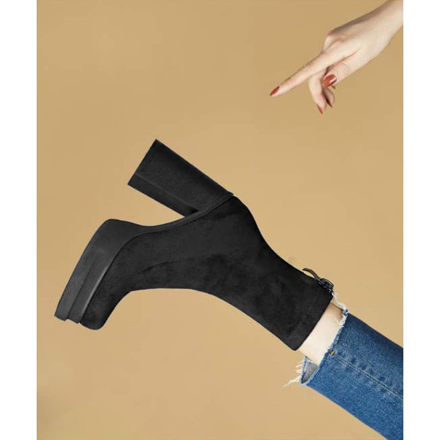シーズンライクなスエード調素材にエコレザーチャンキーヒールの異素材mix仕様、お洒落だけでなく安定感も抜群の韓国っぽショートブーティ