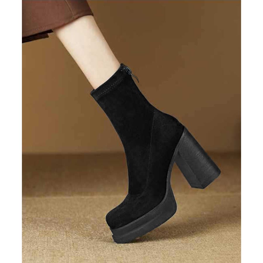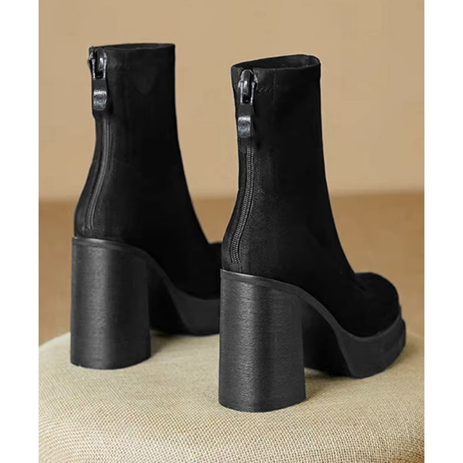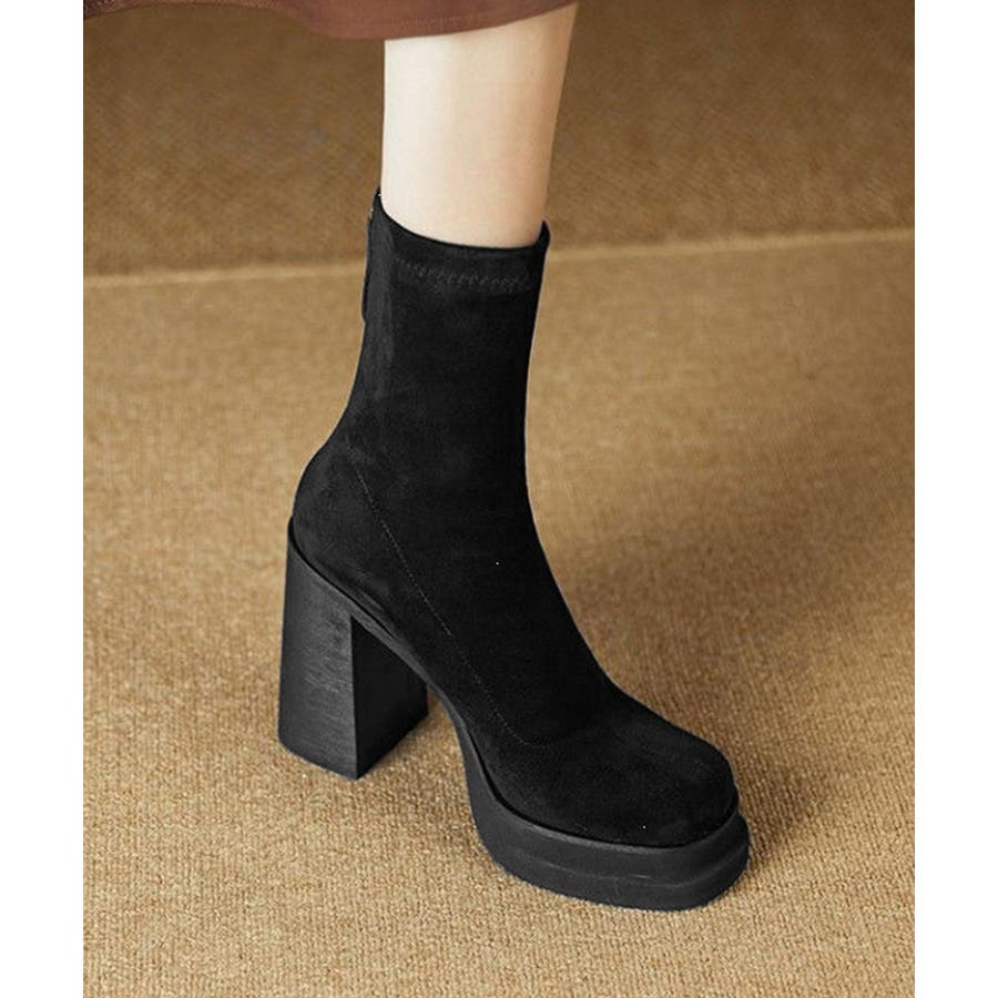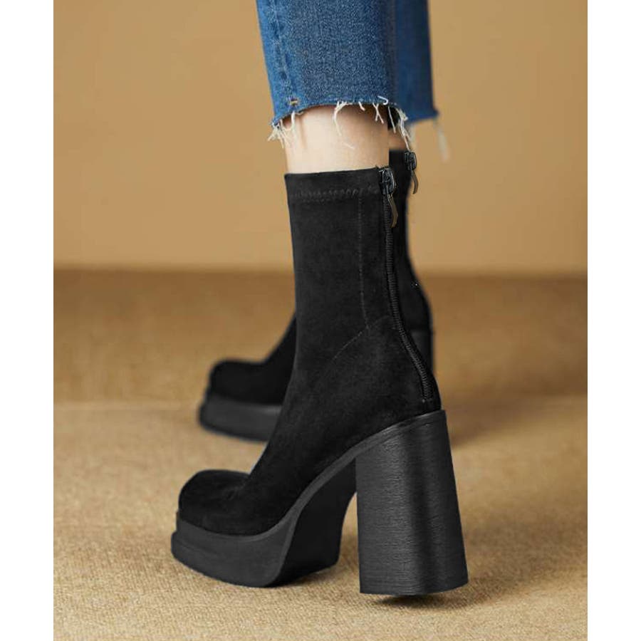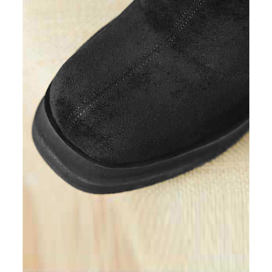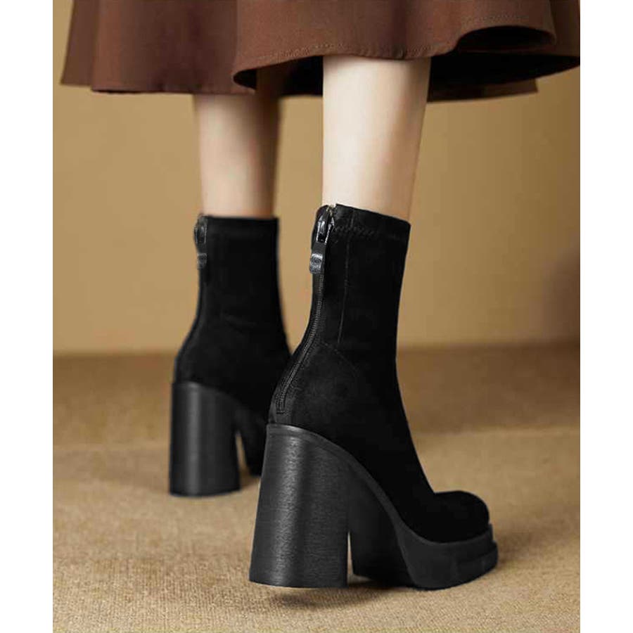 シーズンライクなスエード調素材にエコレザーチャンキーヒールの異素材mix仕様、お洒落だけでなく安定感も抜群の韓国っぽショートブーティ