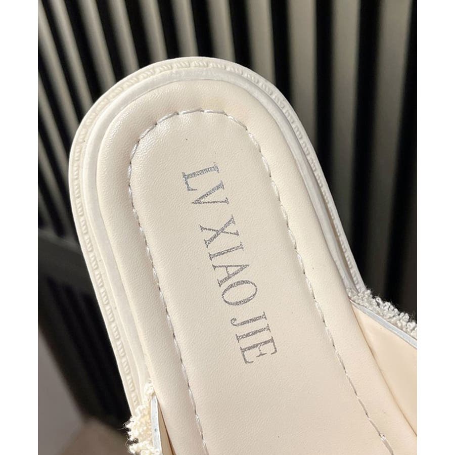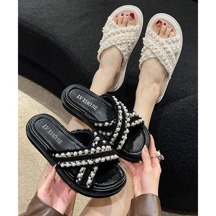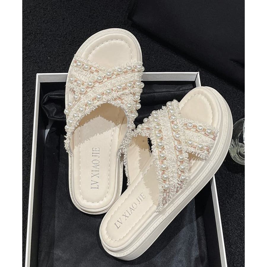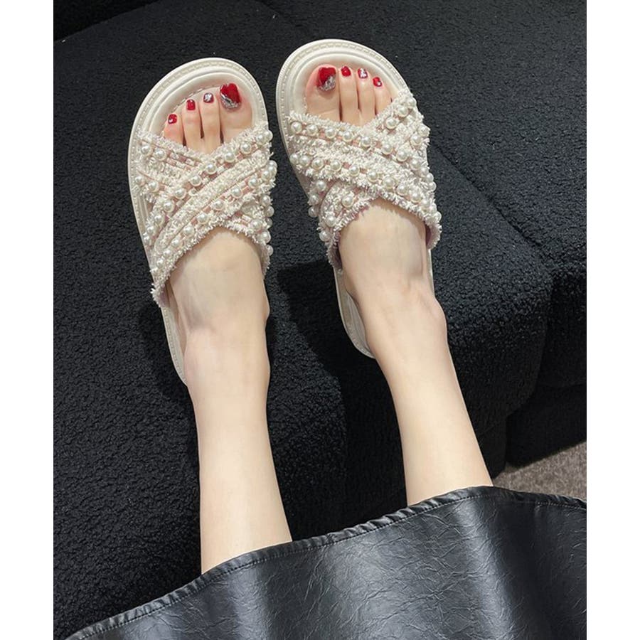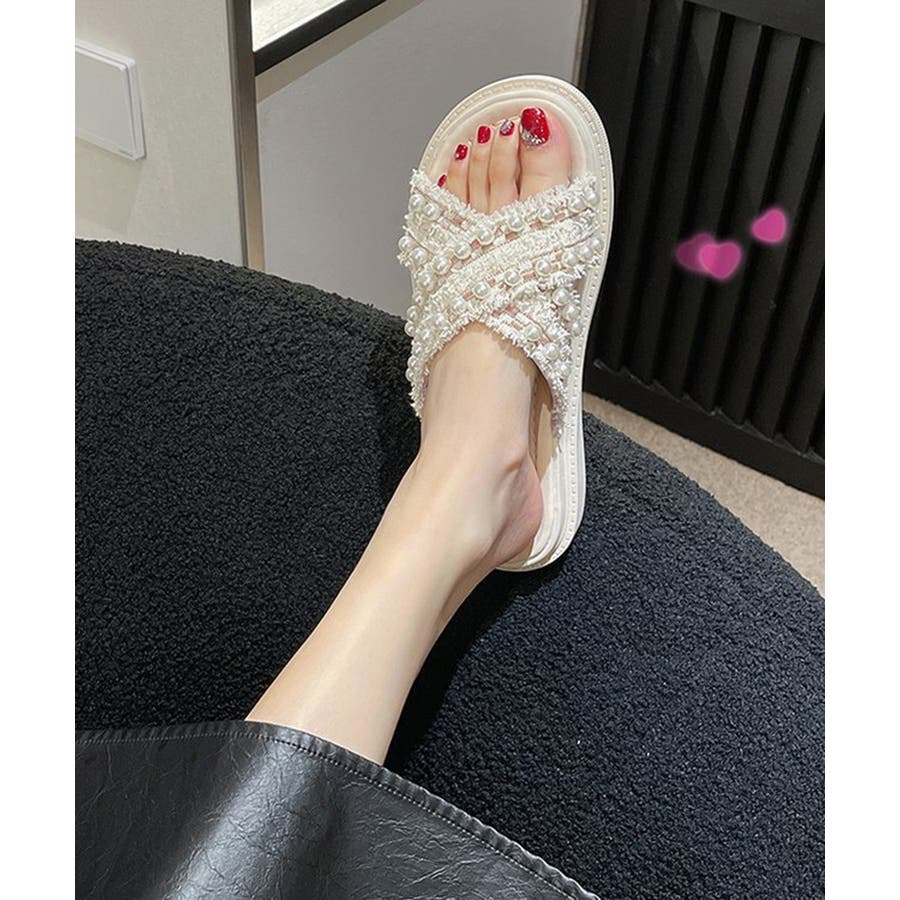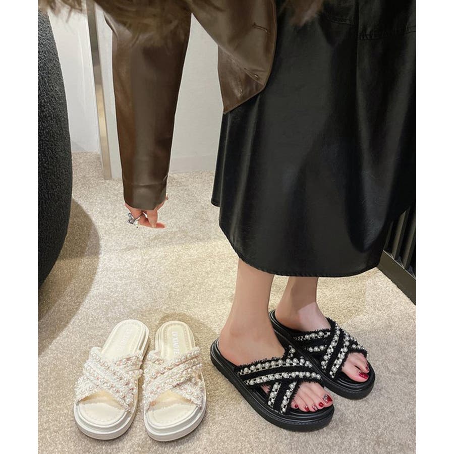 フリンジシャギー生地にフェイクパールをあしらい仕上げた華やかなサマーサンダル