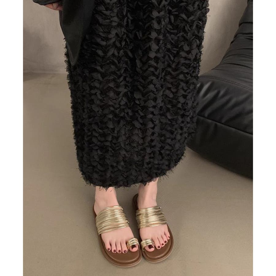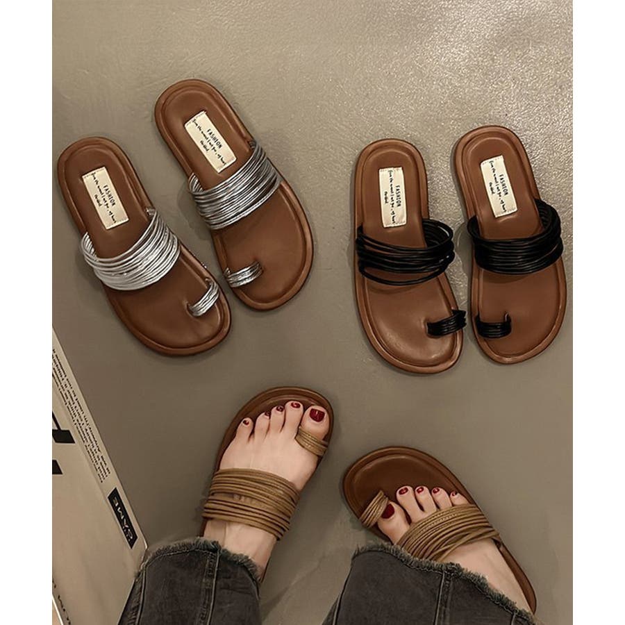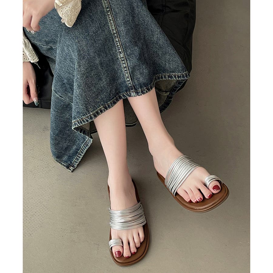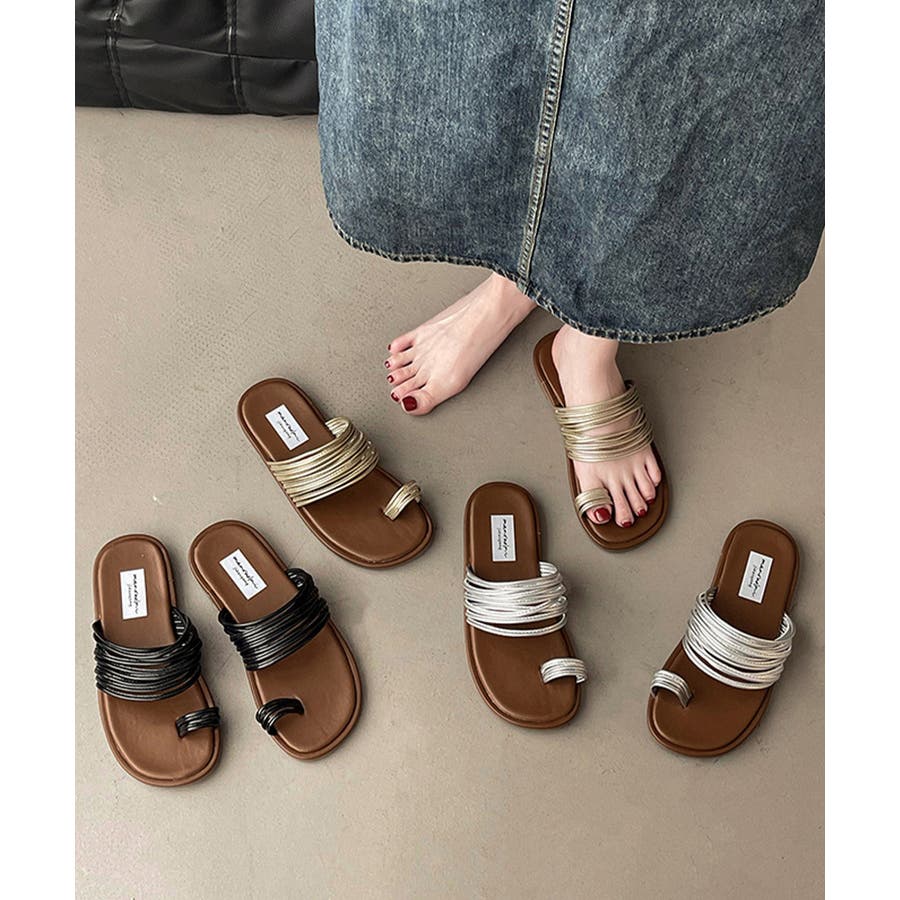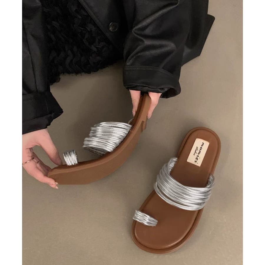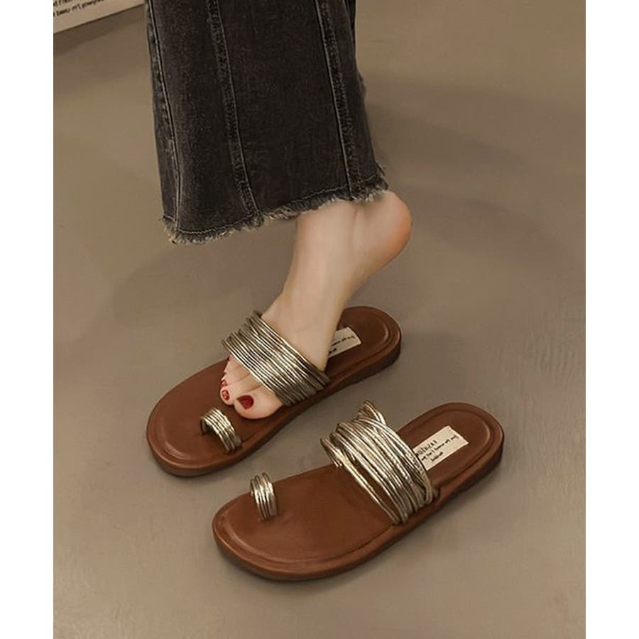 モードな雰囲気漂うメタリックストラップのトングサンダル。