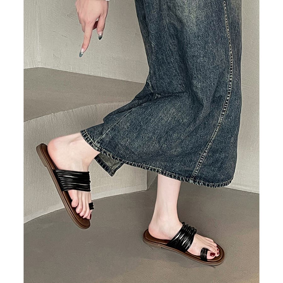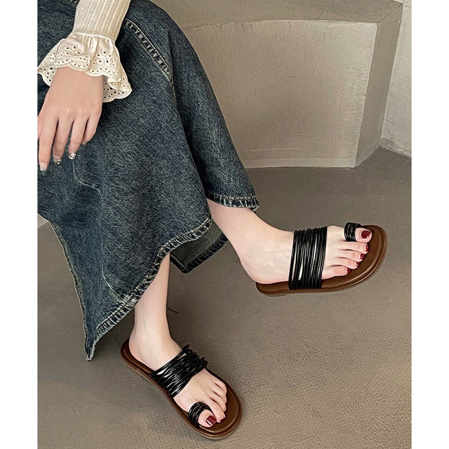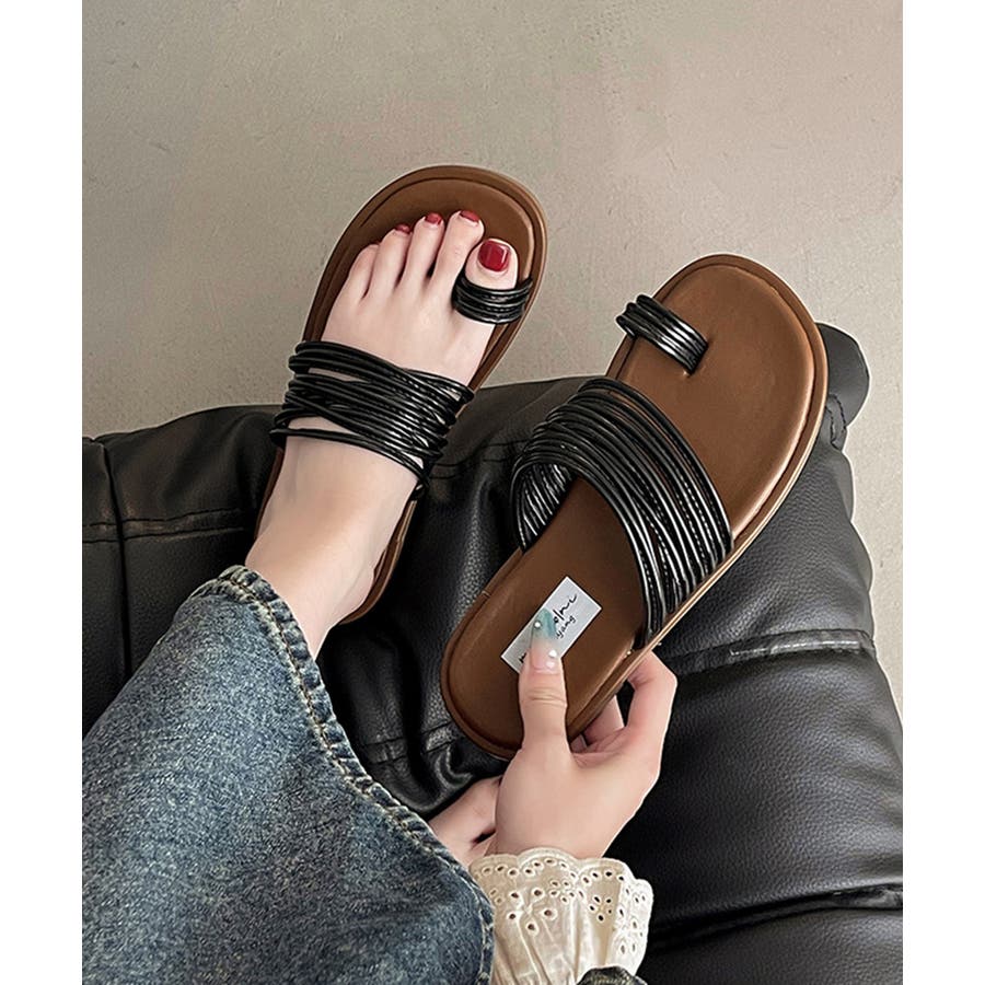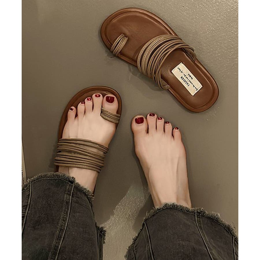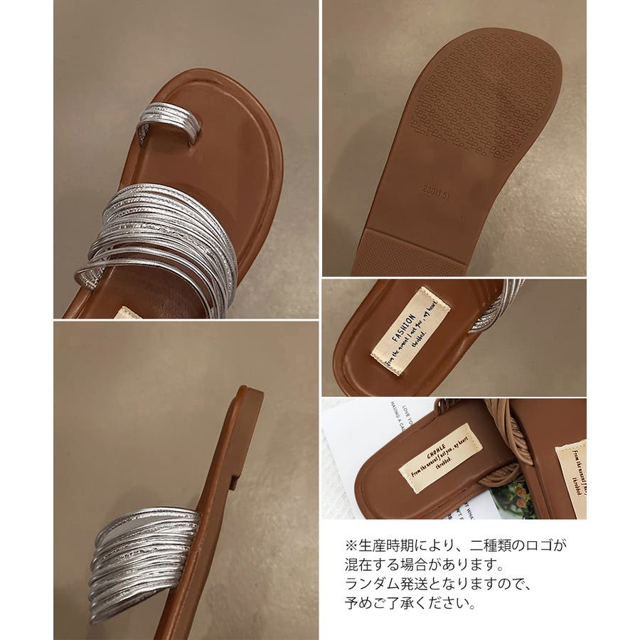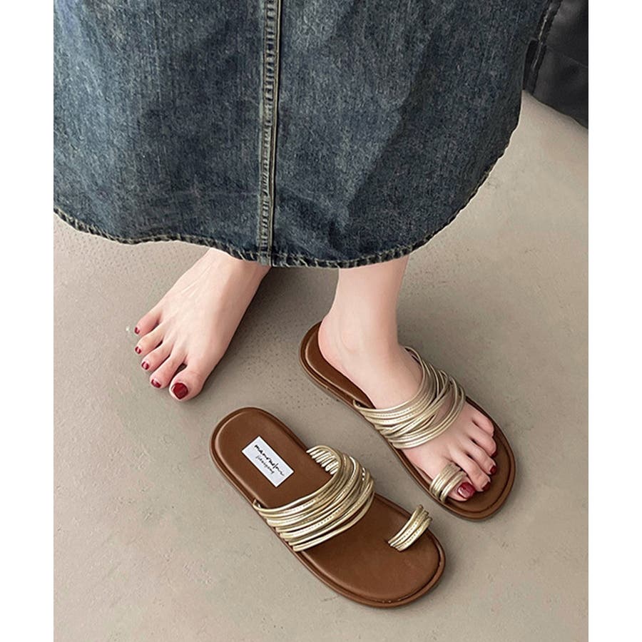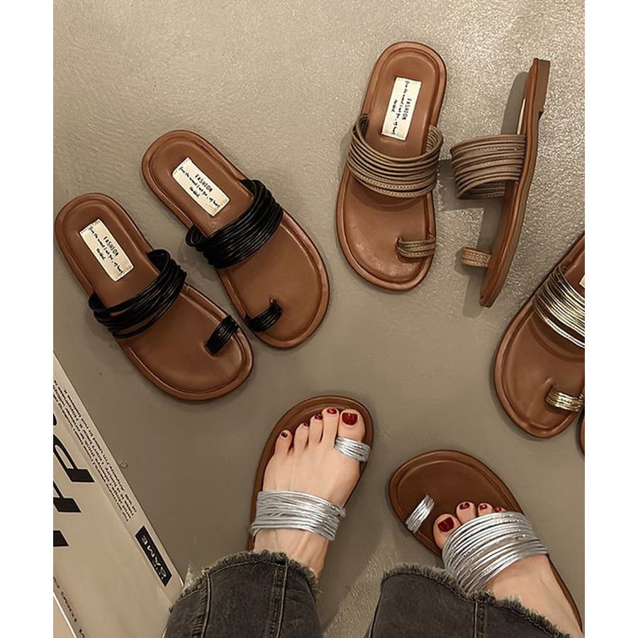 モードな雰囲気漂うメタリックストラップのトングサンダル。