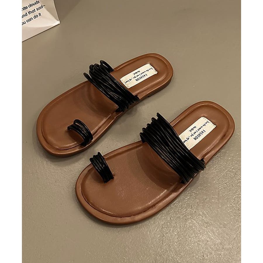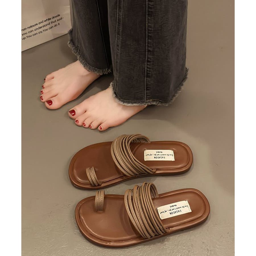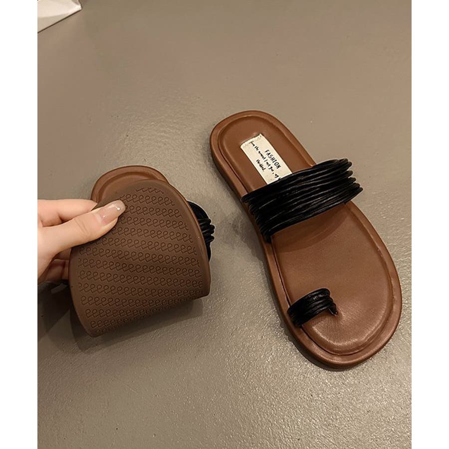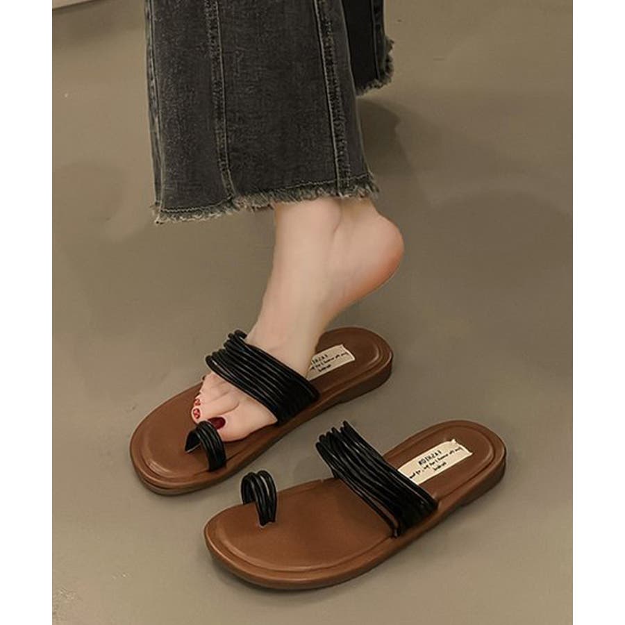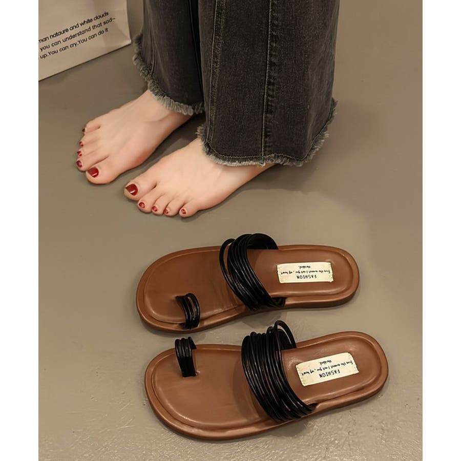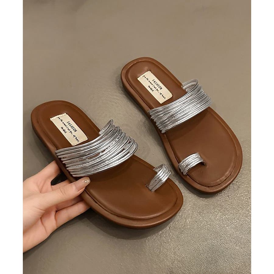 モードな雰囲気漂うメタリックストラップのトングサンダル。