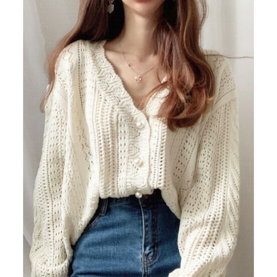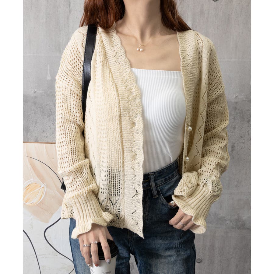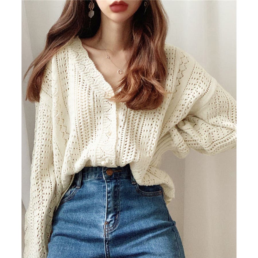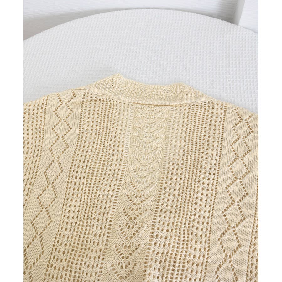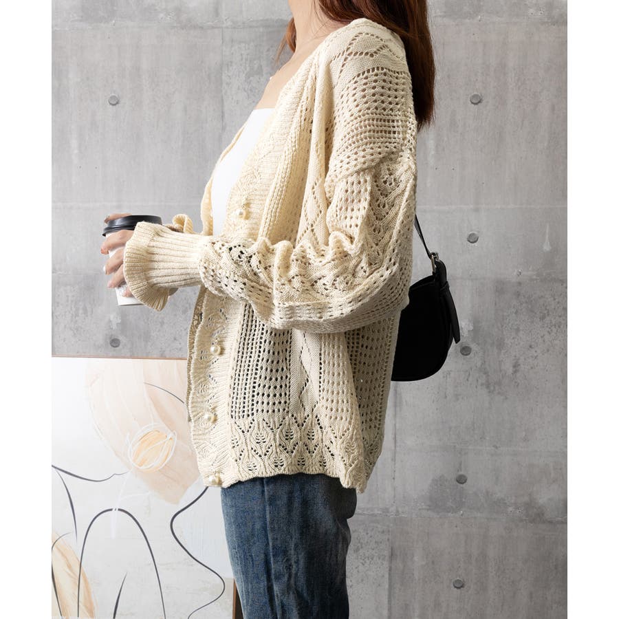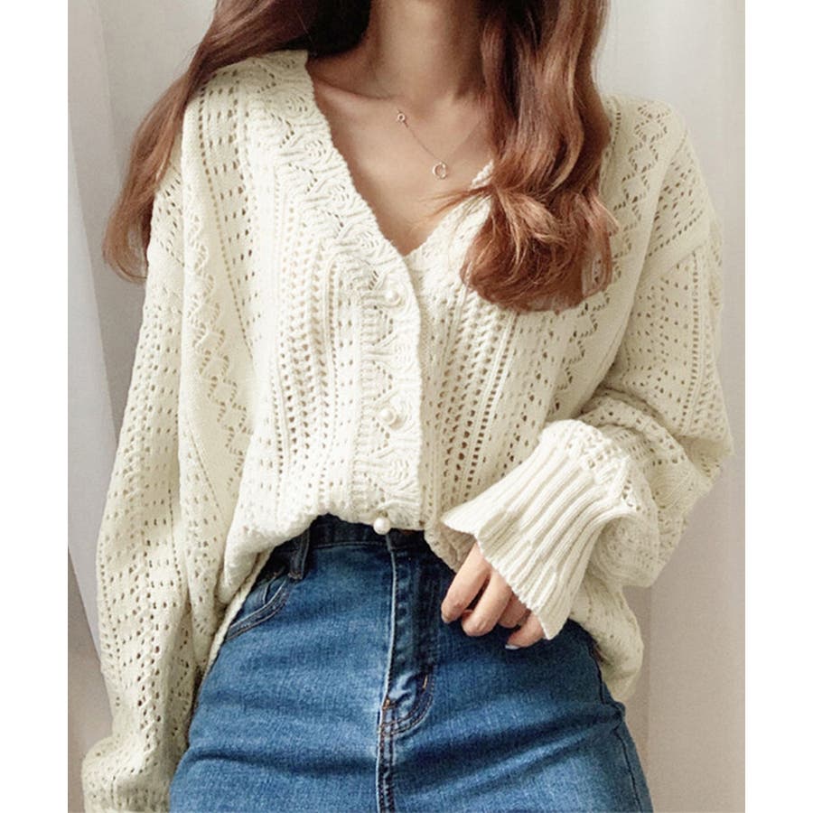 春夏はもちろん、秋にも活躍するゆったりシルエットの透かし編みニットカーディガン。