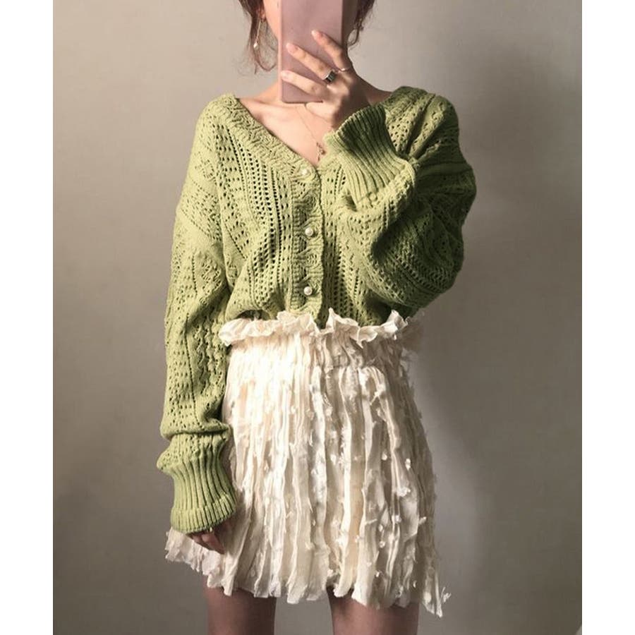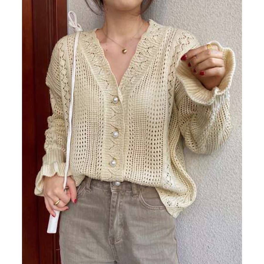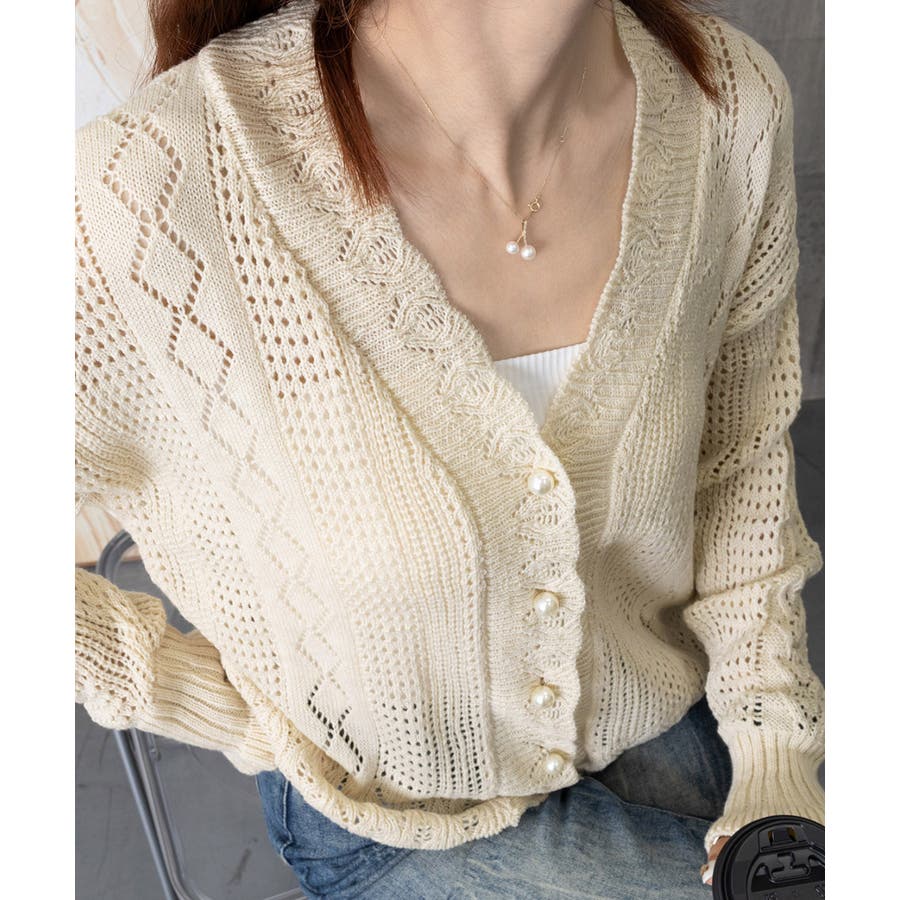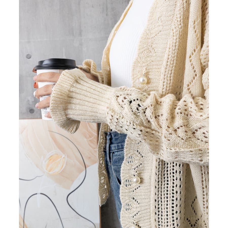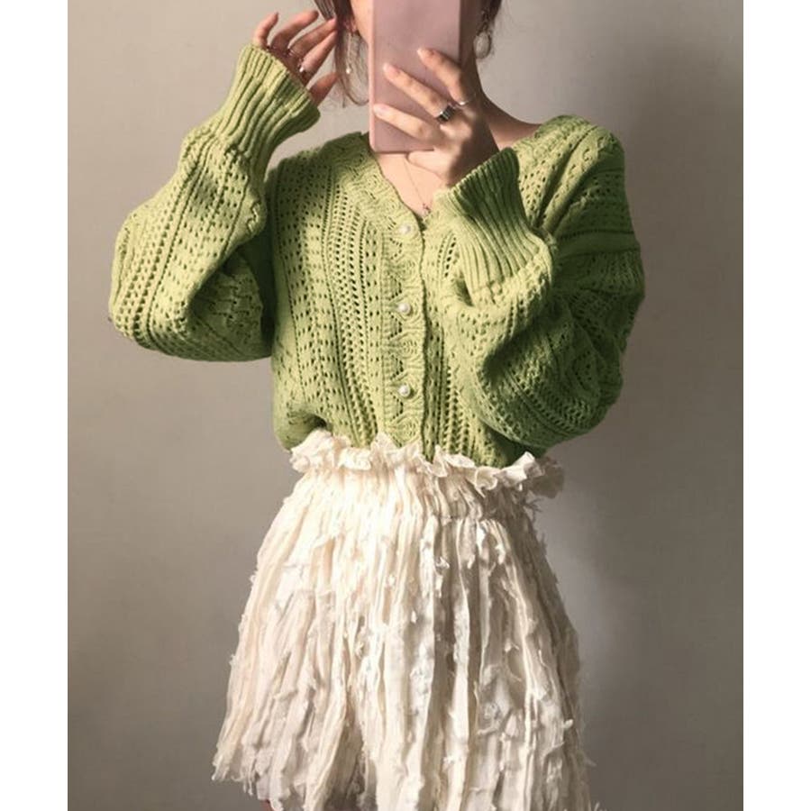 春夏はもちろん、秋にも活躍するゆったりシルエットの透かし編みニットカーディガン。