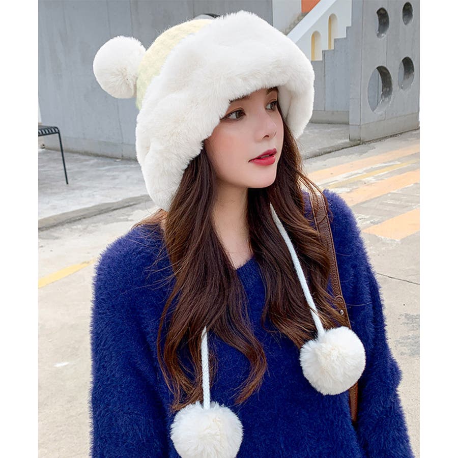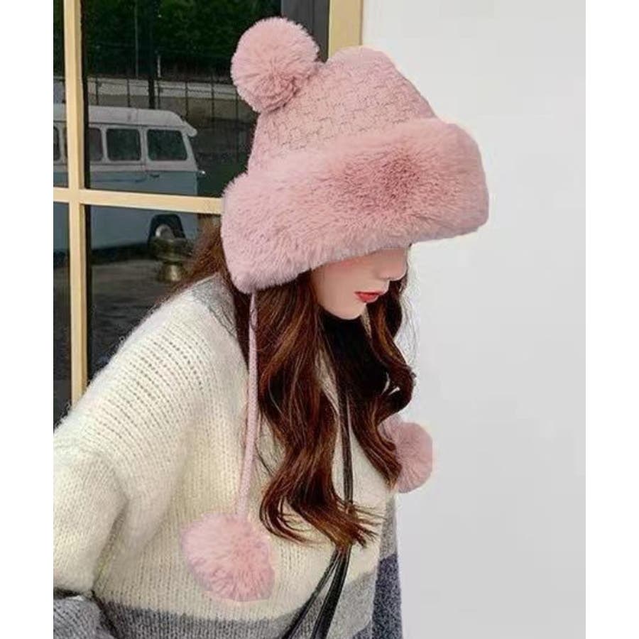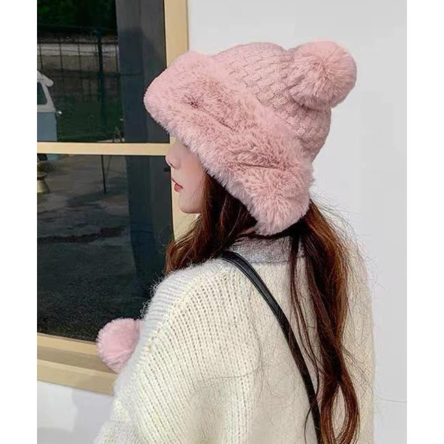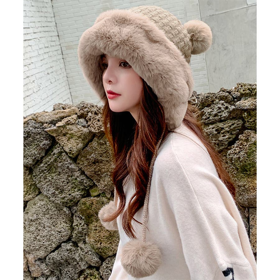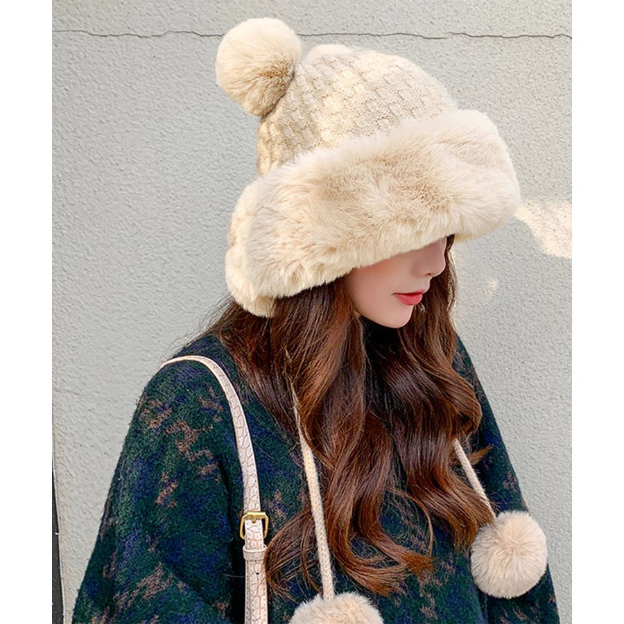 ニット生地にふわふわエコファー、可愛いポンポンが付いたレディース帽子