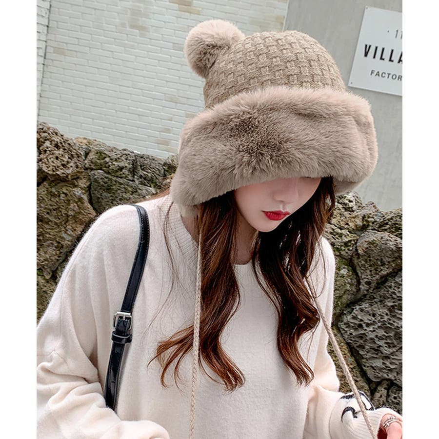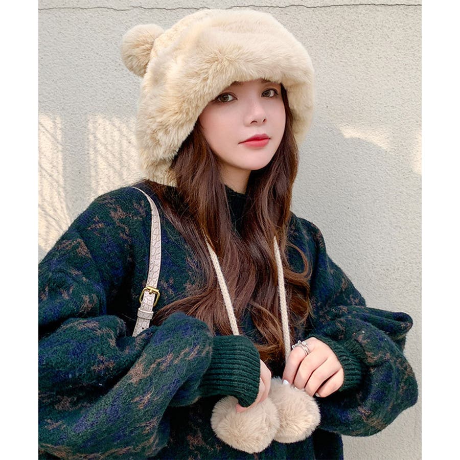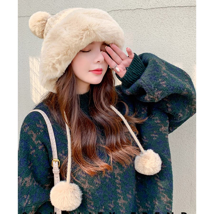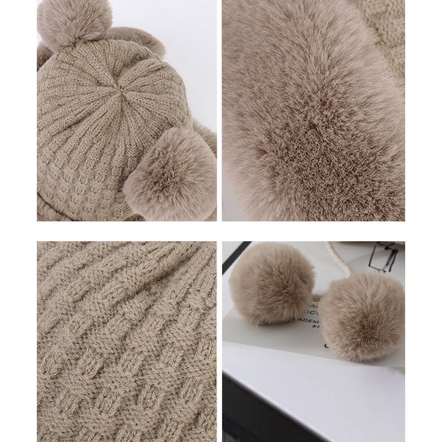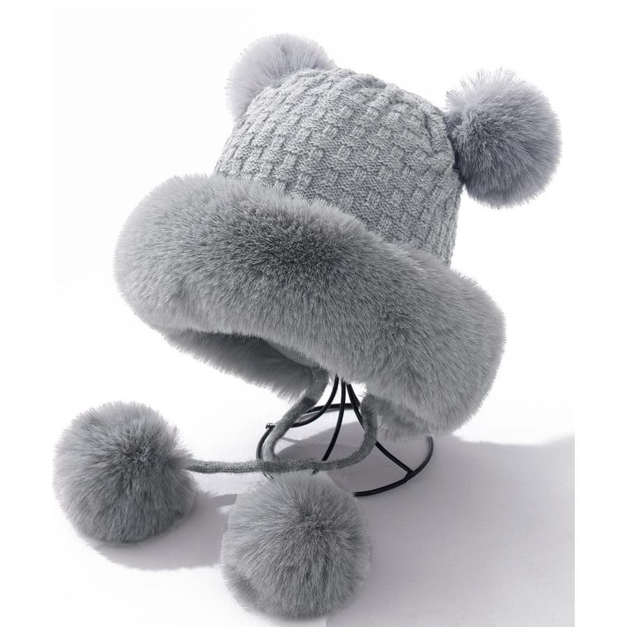 ニット生地にふわふわエコファー、可愛いポンポンが付いたレディース帽子