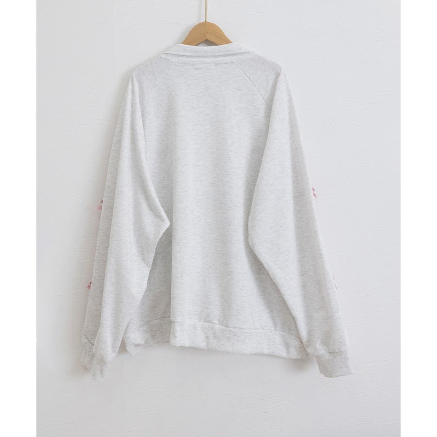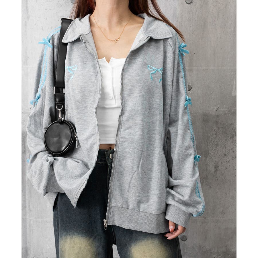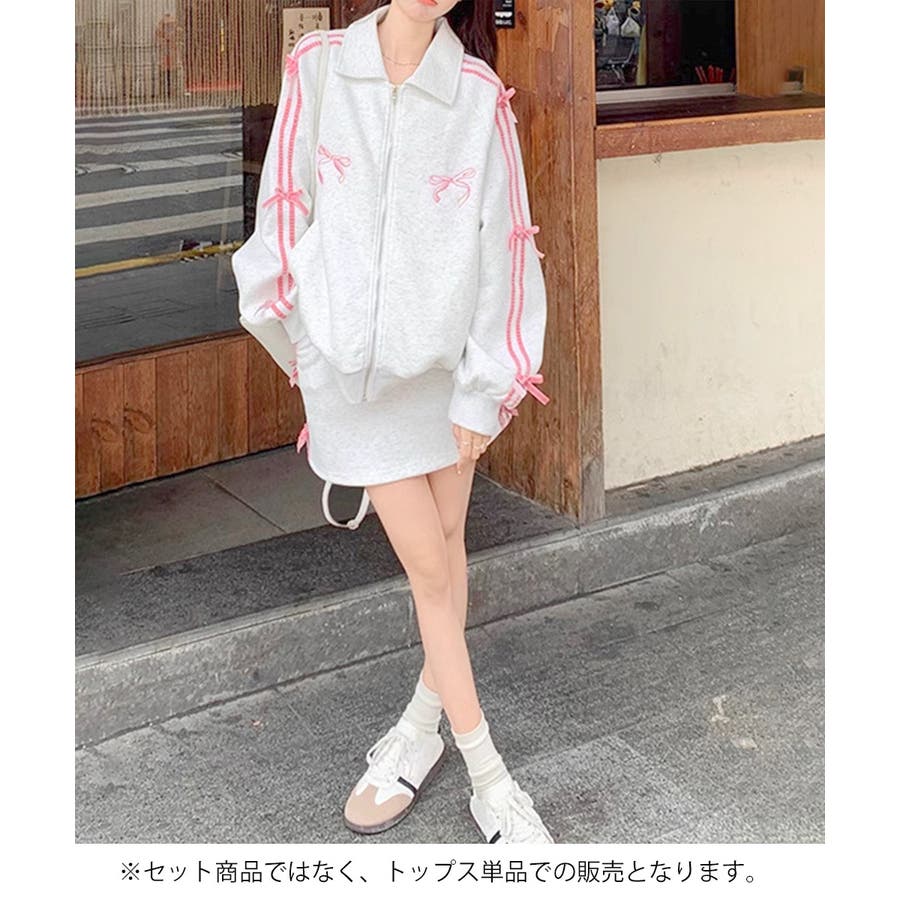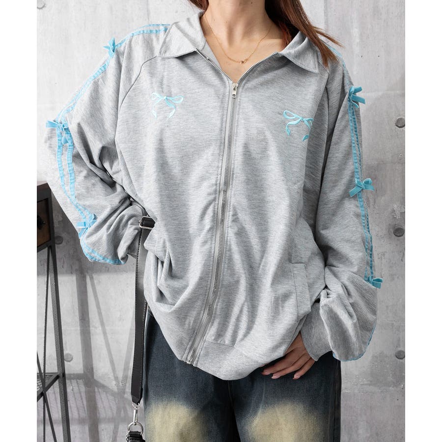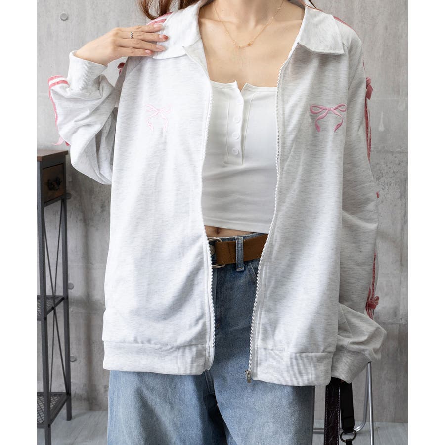 リボンと刺しゅうがアクセントになった、春秋新作のトレンド感あふれる長袖スウェットアウター。