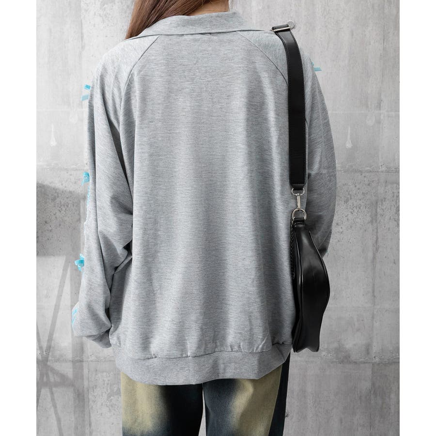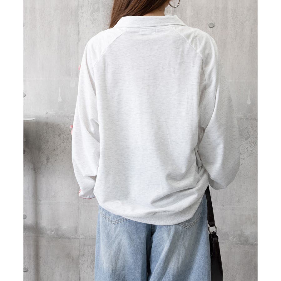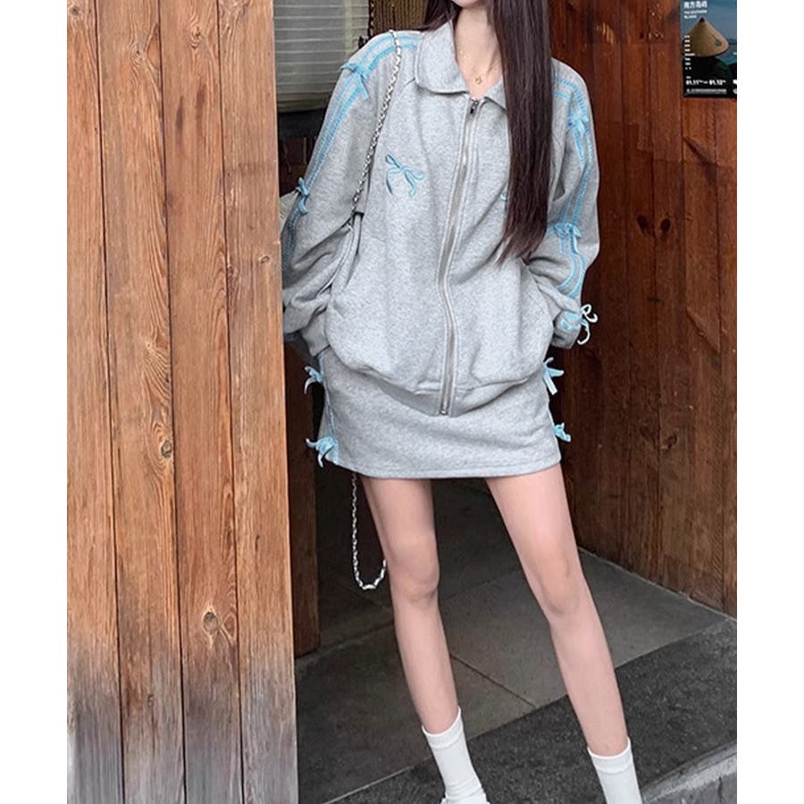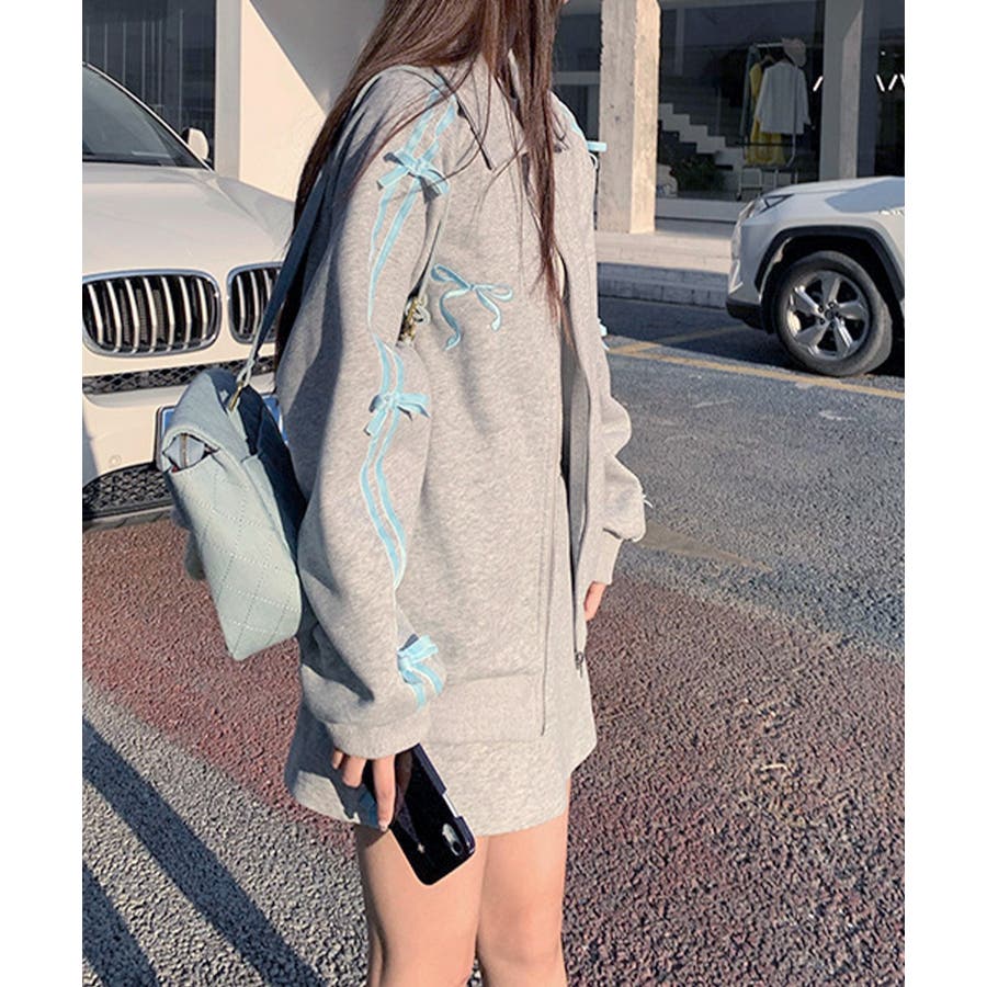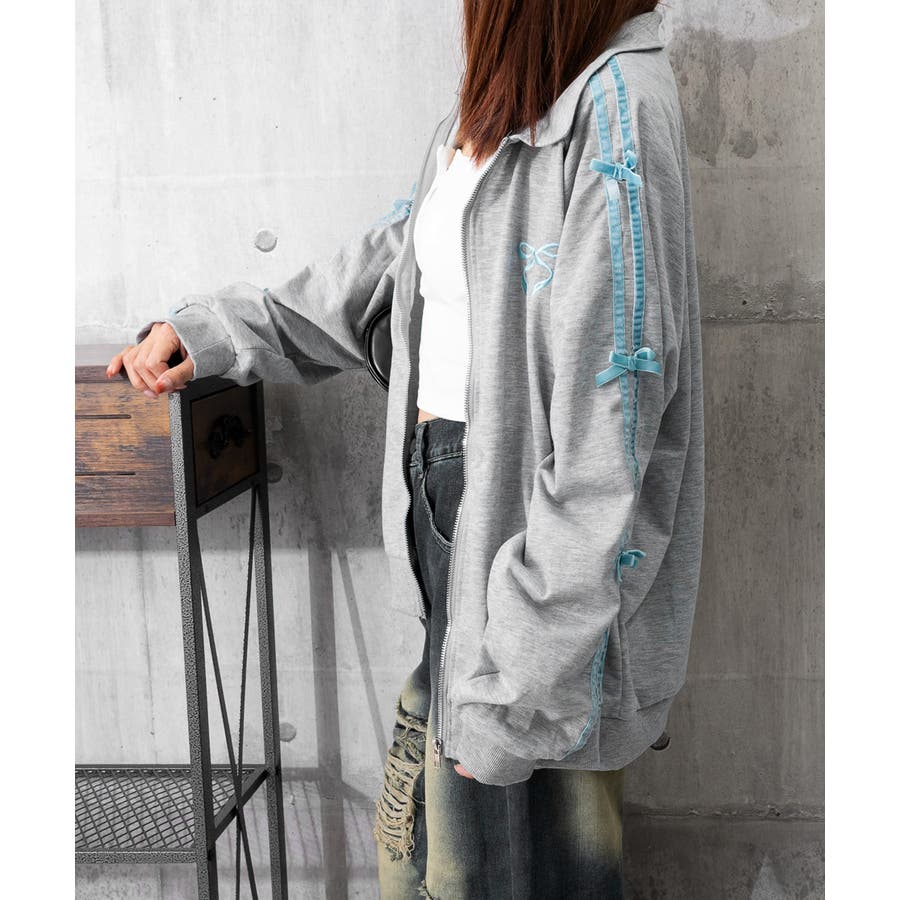 リボンと刺しゅうがアクセントになった、春秋新作のトレンド感あふれる長袖スウェットアウター。