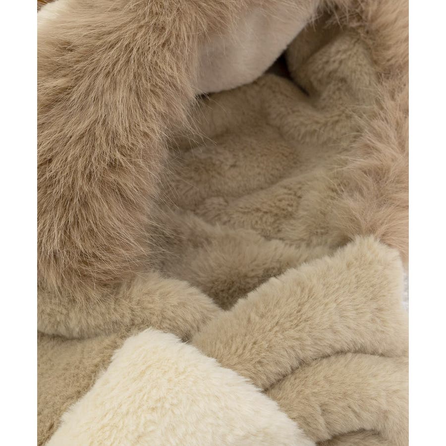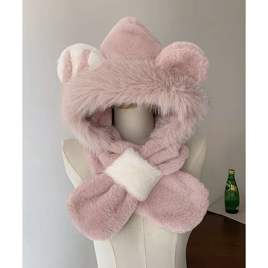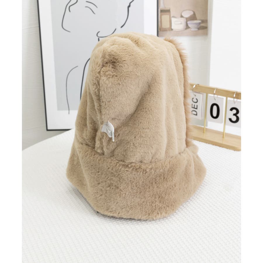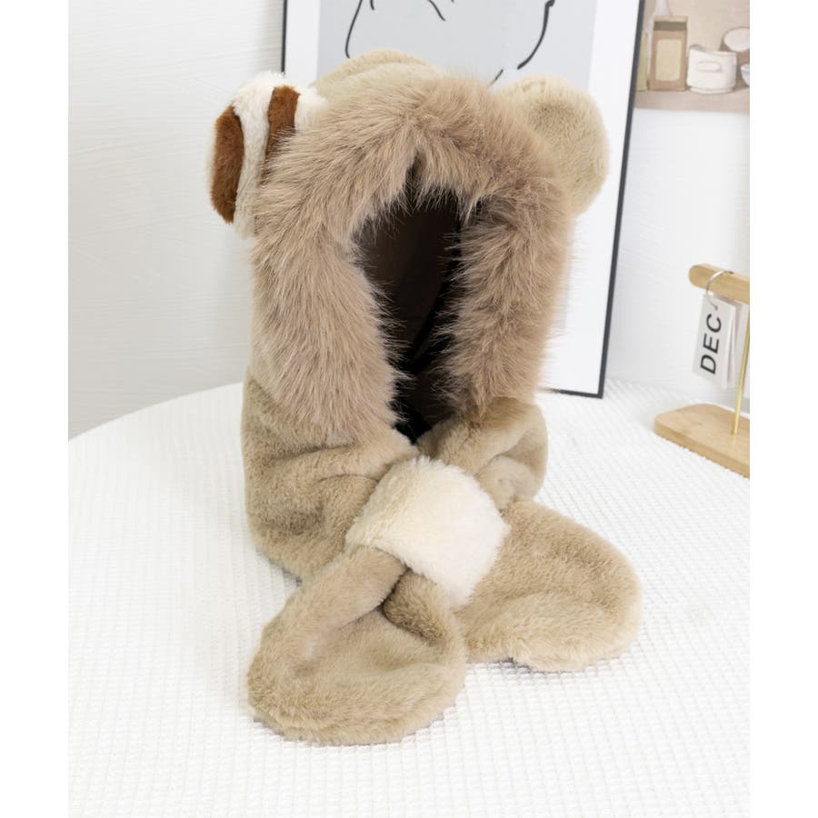 帽子とマフラーが一体化した、首元まで暖かく包み込むファー付きボア帽子。