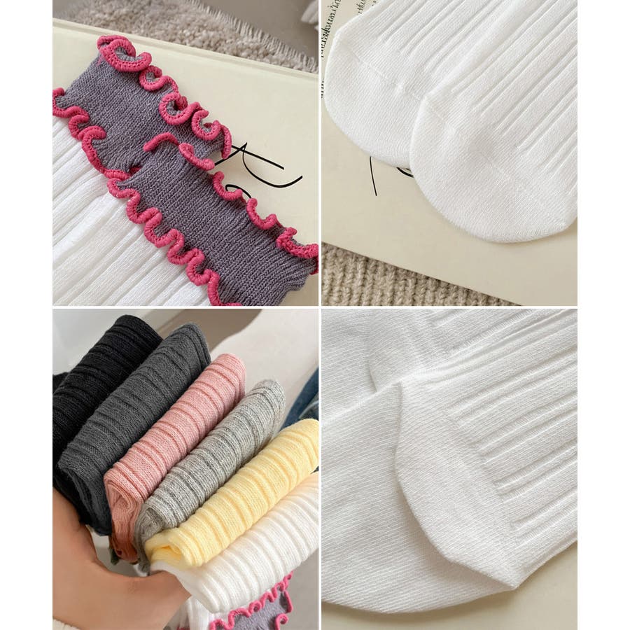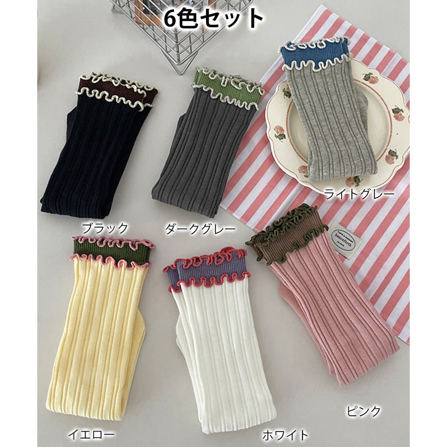レトロ感のある配色が可愛い、2重フリル仕様のレディースリブソックス6色セット。
