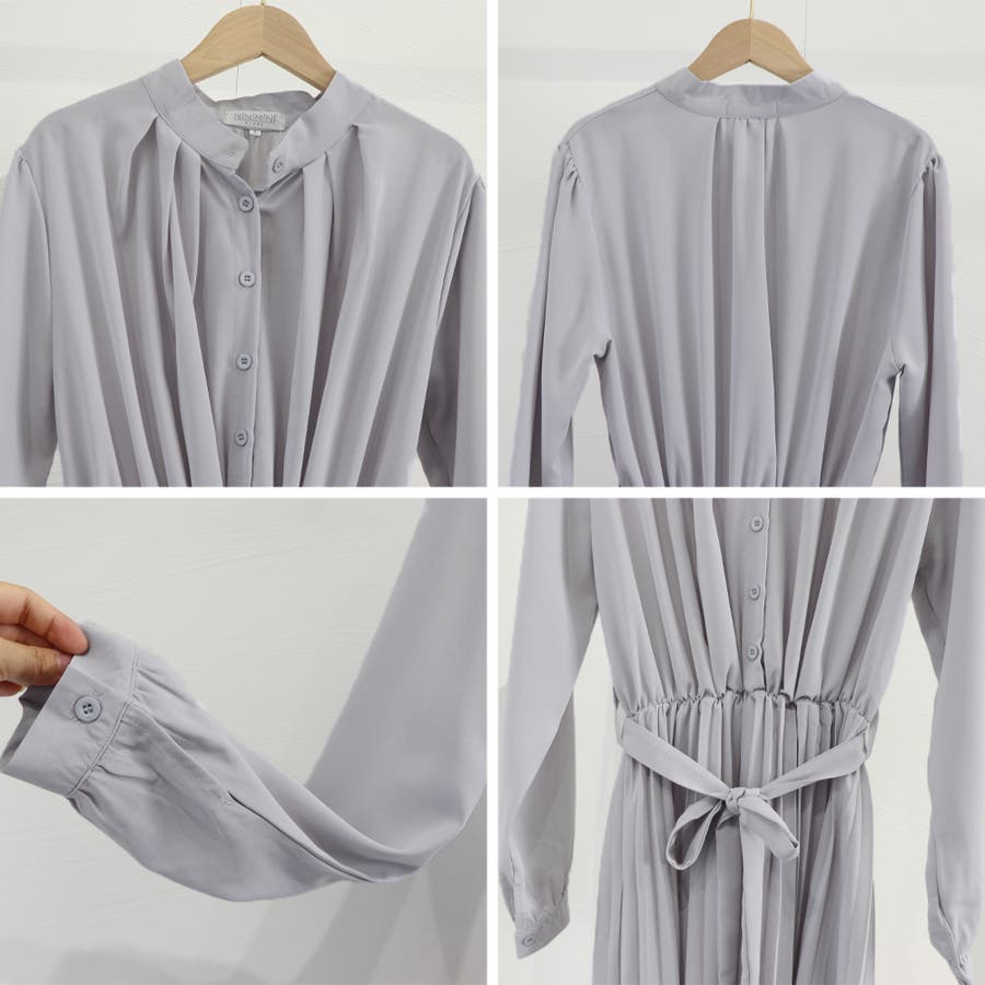 前身頃にたっぷりのタック寄せ、ウエストリボンや広がるフレア裾、Detailまでこだわって最大限に着やせとメリハリのあるボディラインを描く