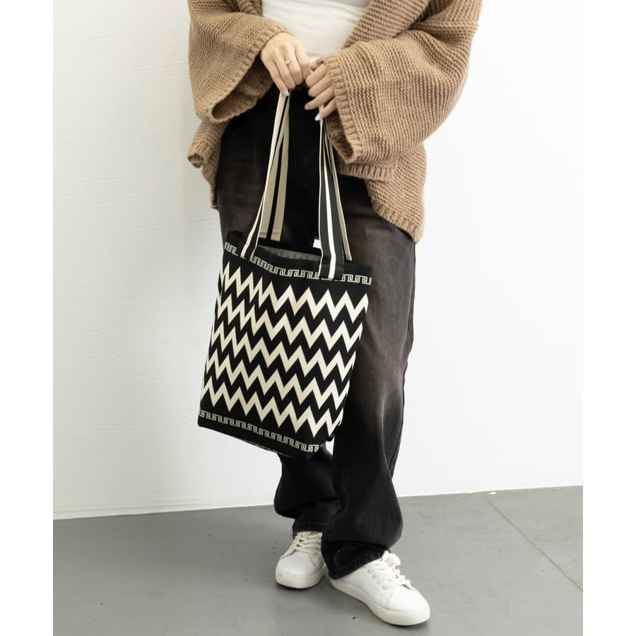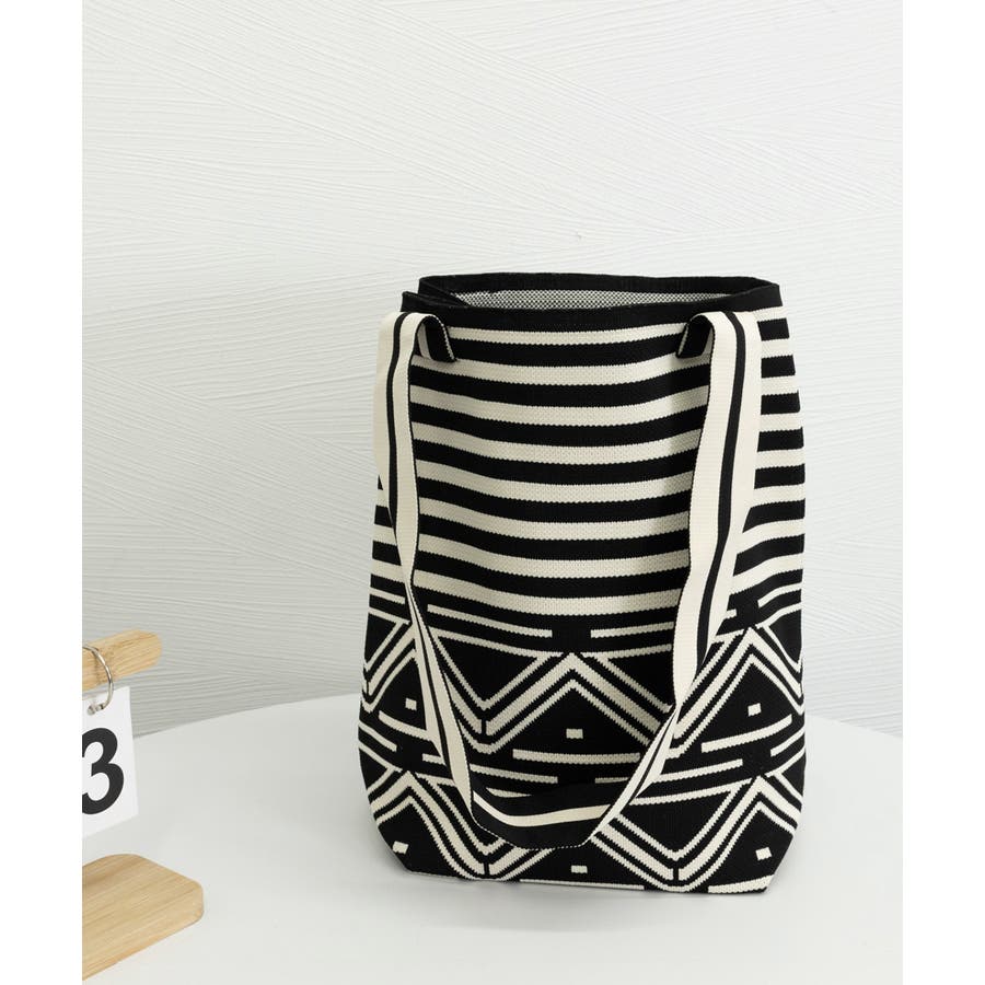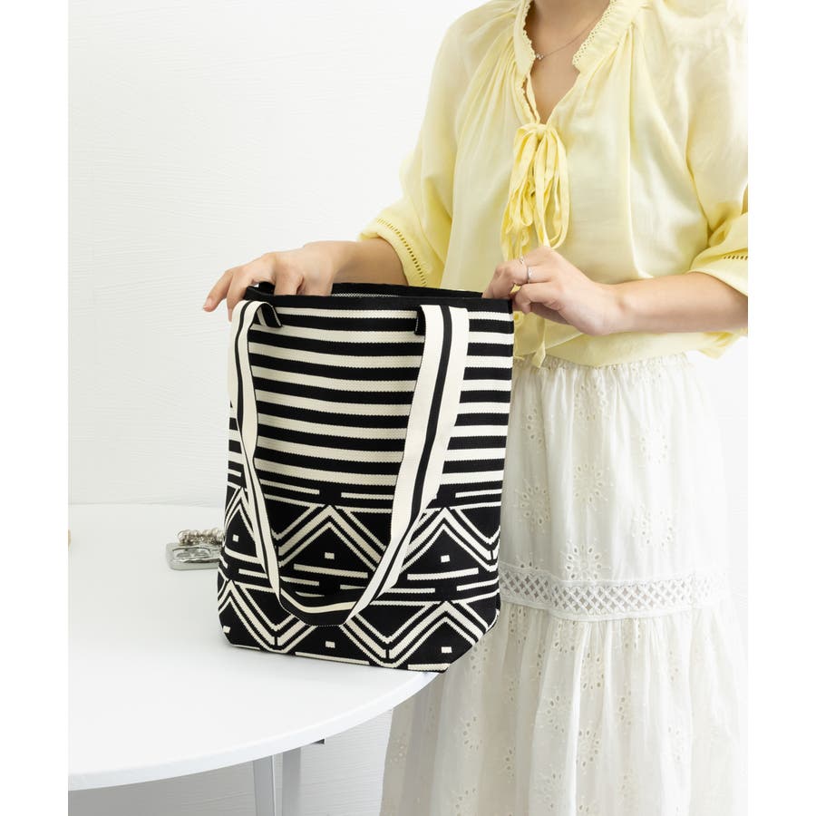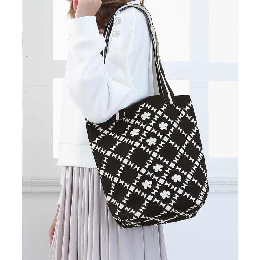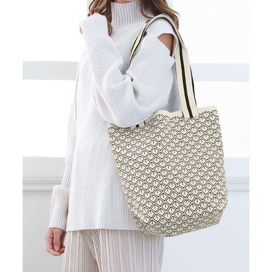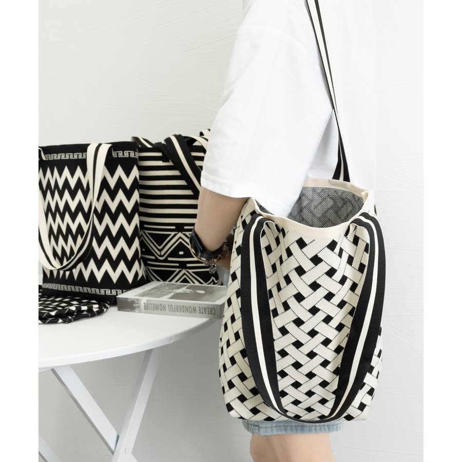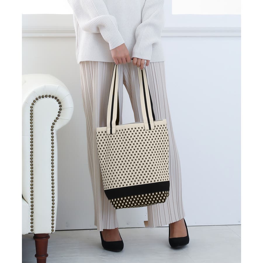 スタイリングに映えるデザインが目を引くニット素材のマルシェトートバッグ