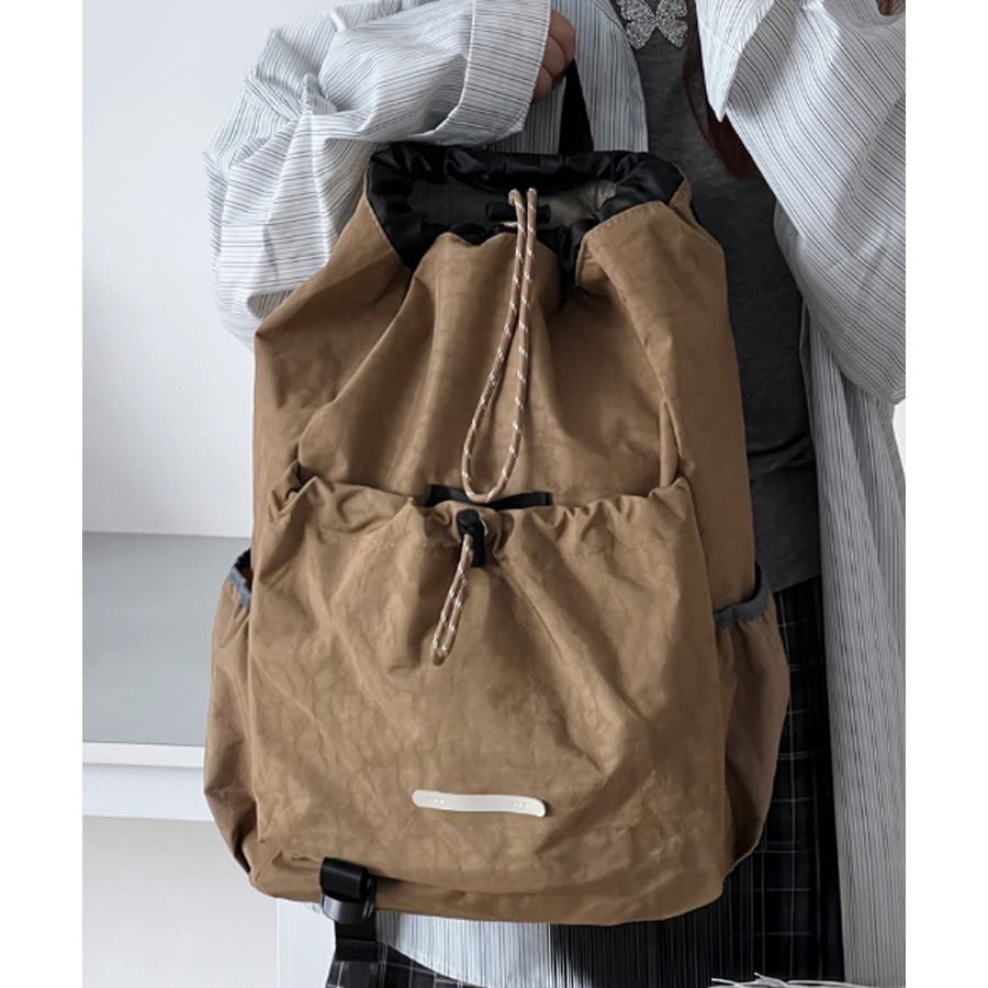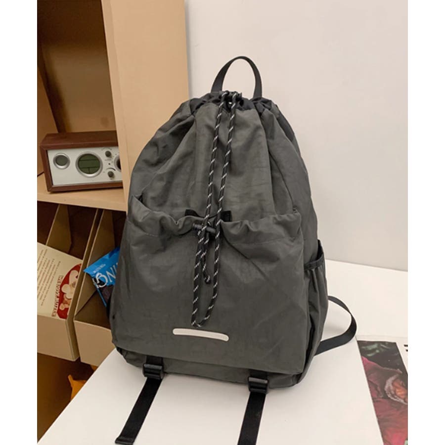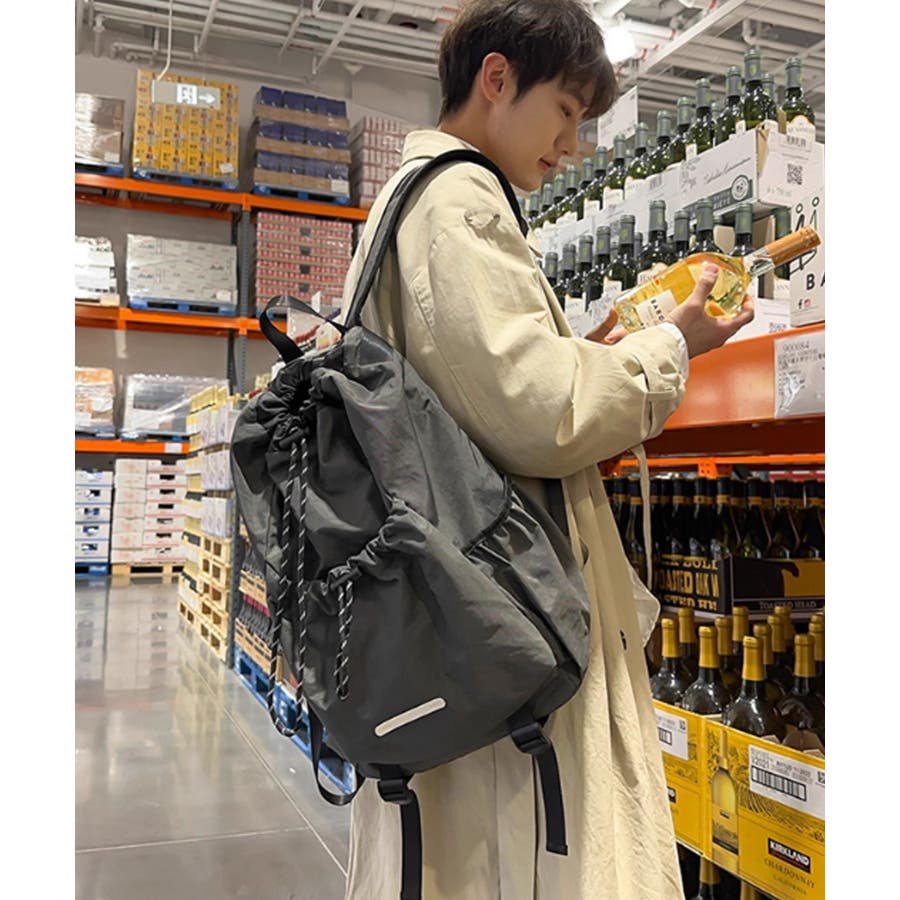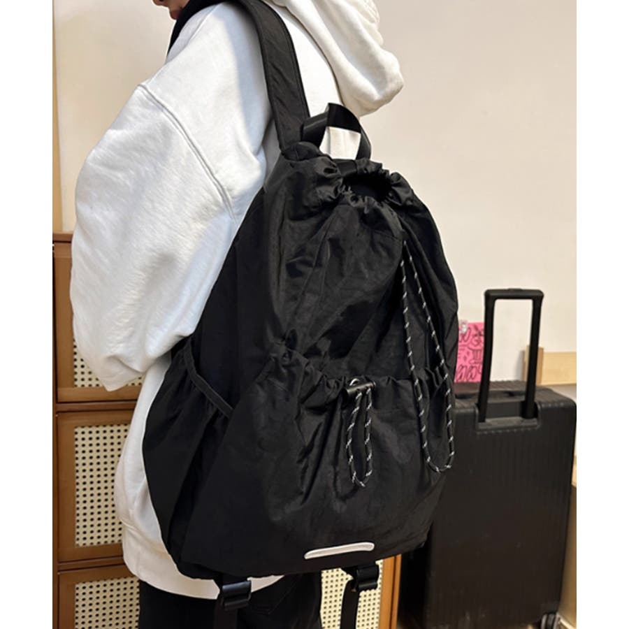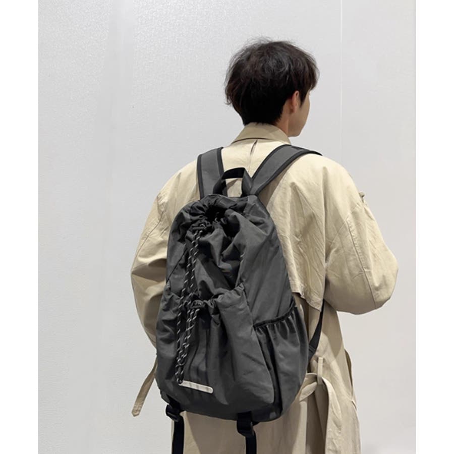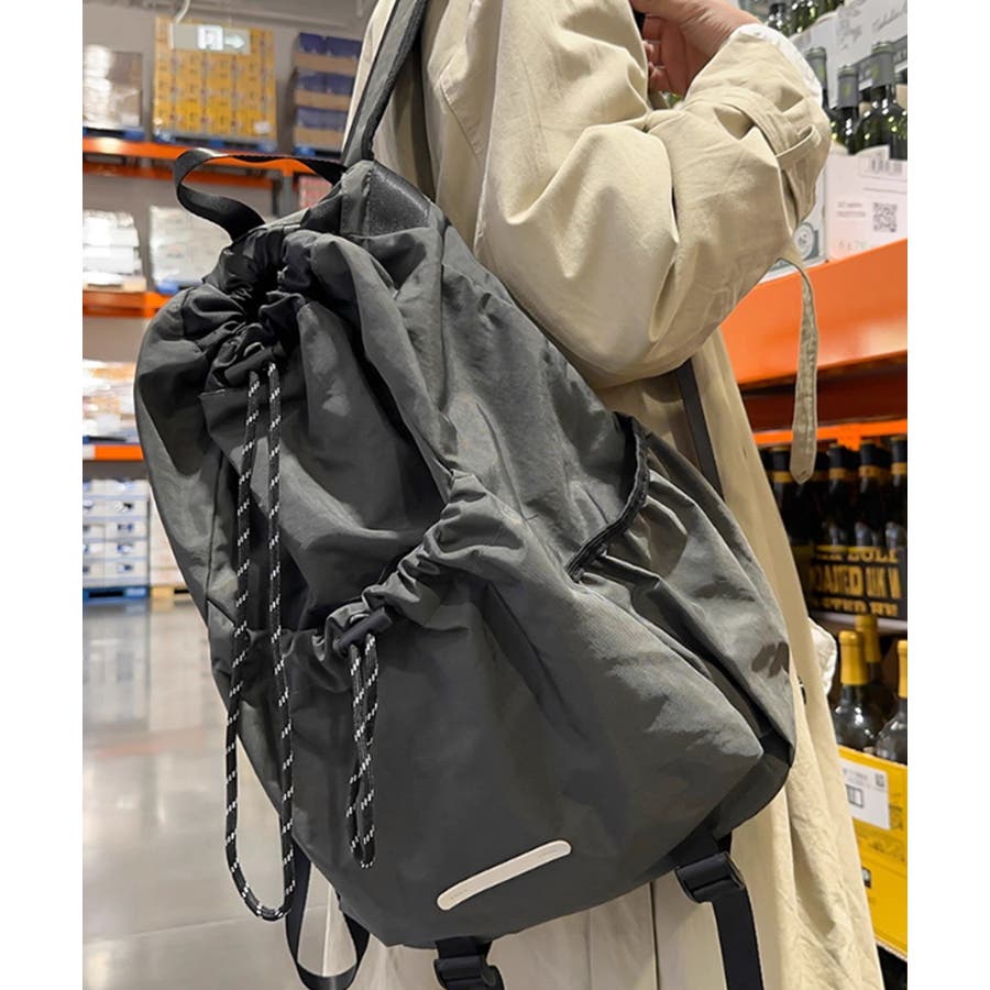 スタイリッシュなドローストリングデザインが目を引く、大容量リュックサック。