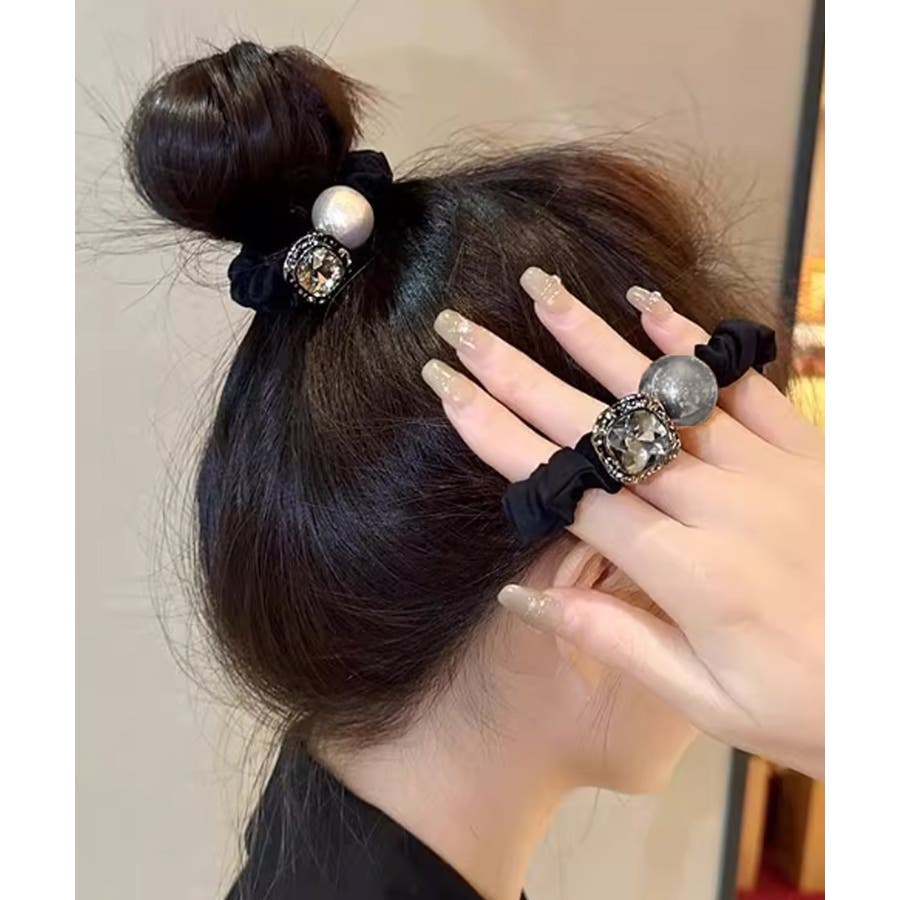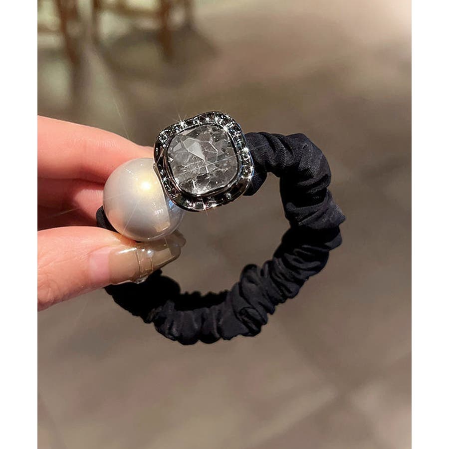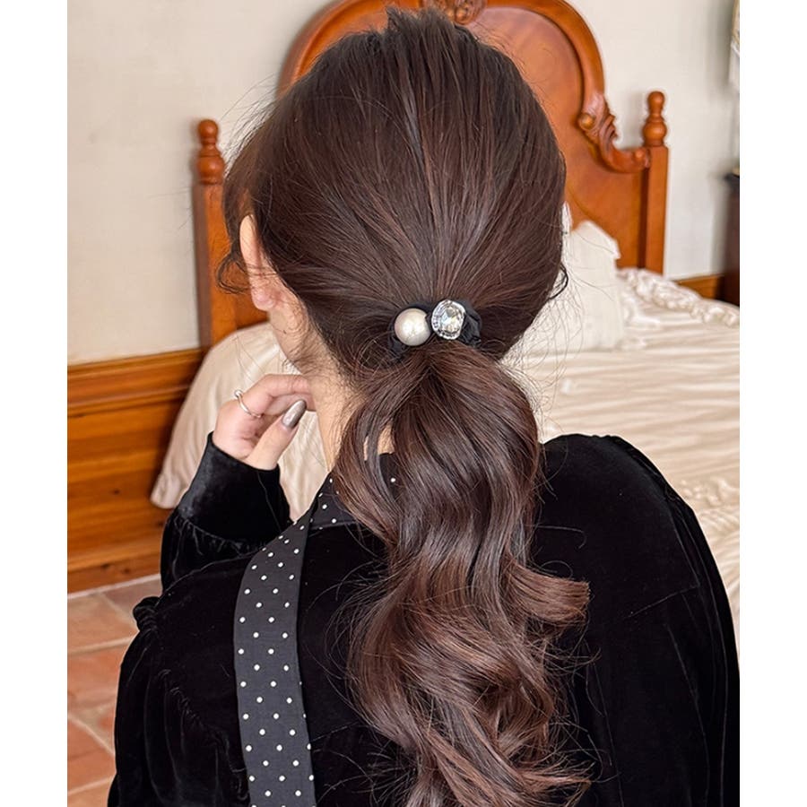 大粒のフェイクパールと輝くビジューが目を惹く華やかなヘアゴム。
