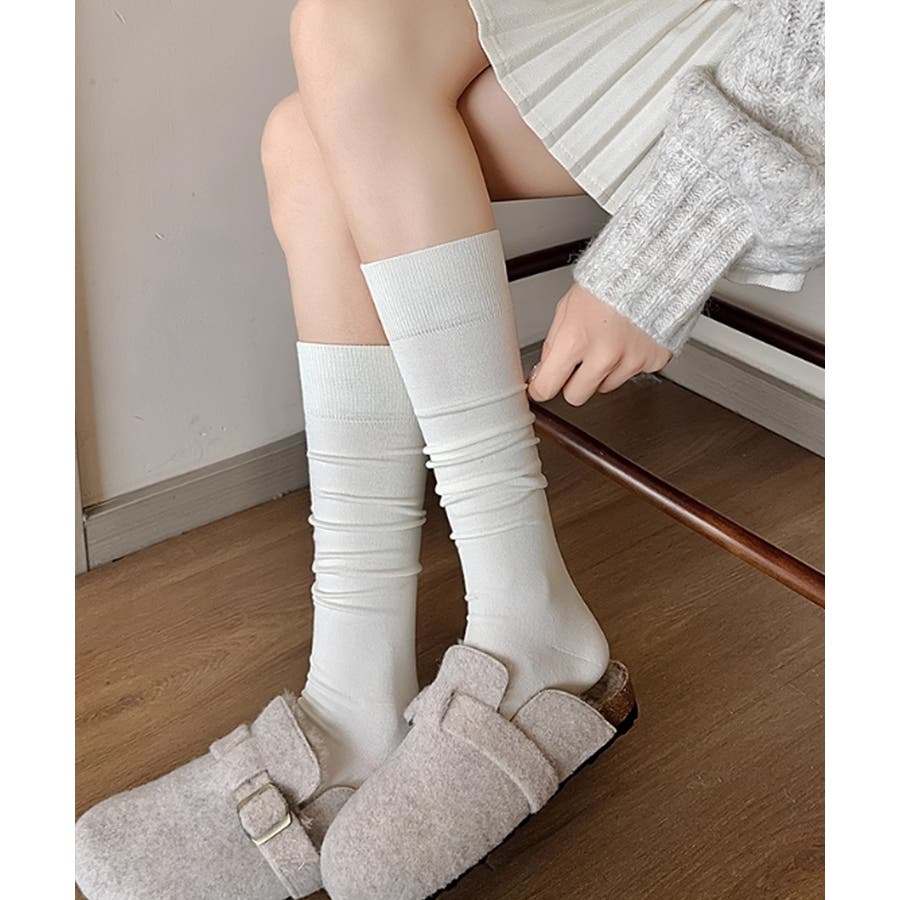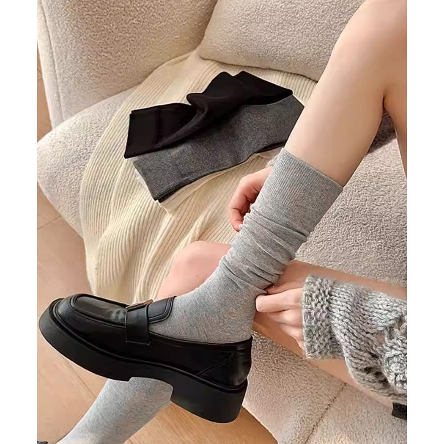 足元をすっきり見せてくれる、柔らかな素材のハイソックス。