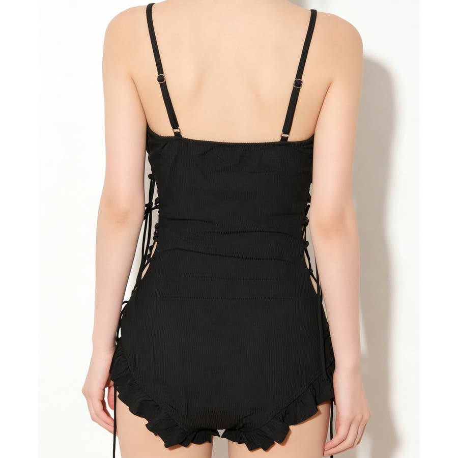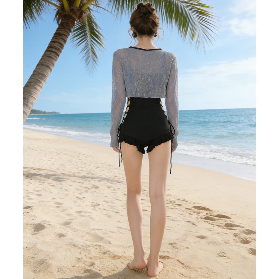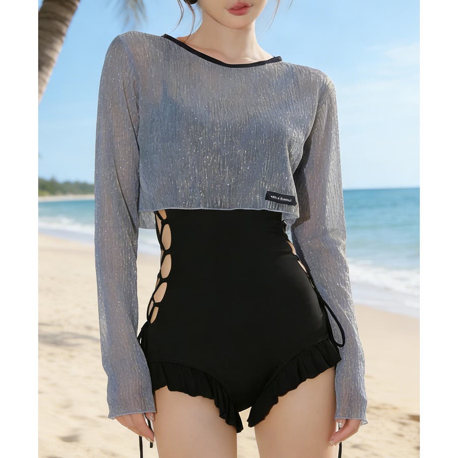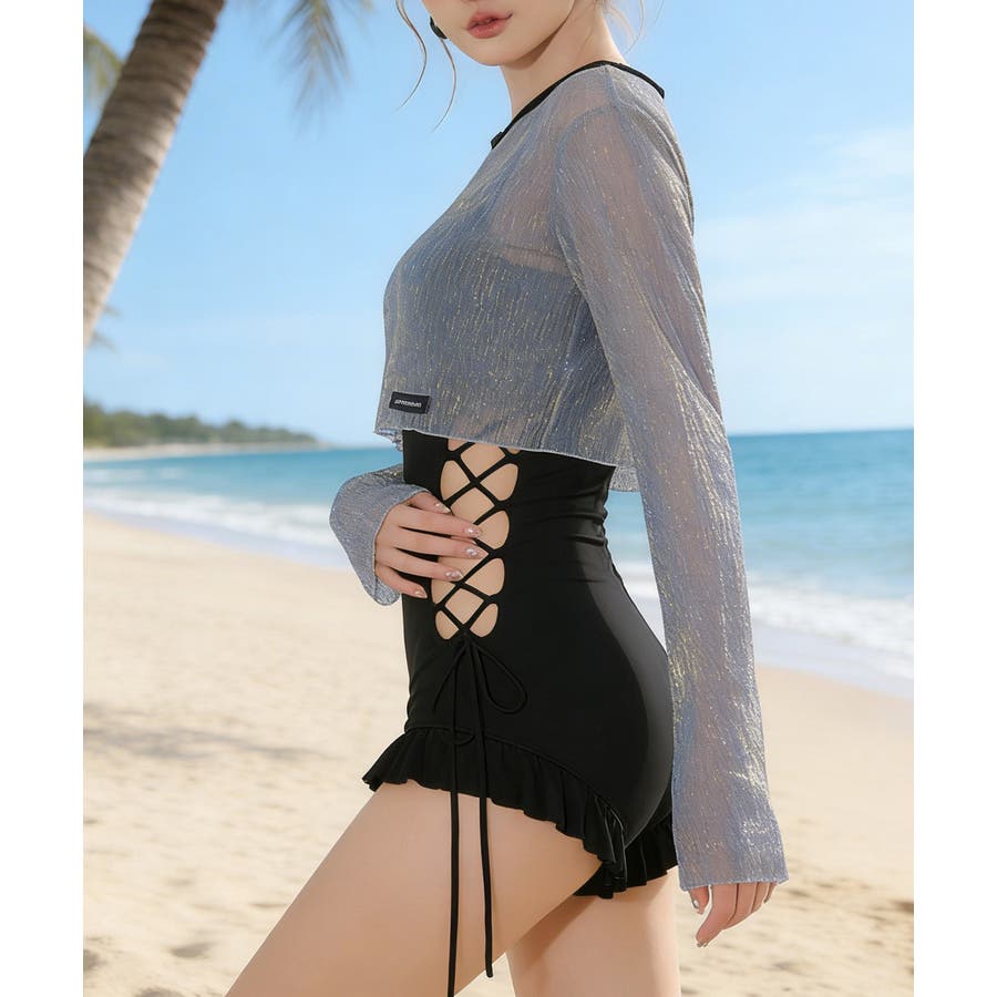 視線を惹きつける、編み上げデザインのワンピース水着2点セット。