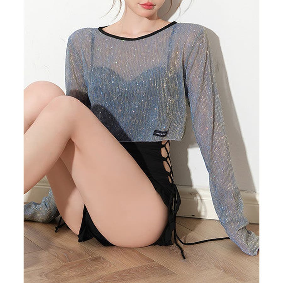 ラメ感のあるシアートップス風デザインが、程よい肌見せをかなえ、女性らしい柔らかな印象を演出。