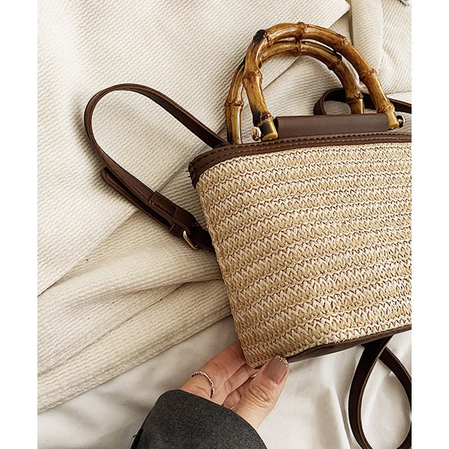夏っぽい麦わら素材とフェイクレザーがカジュアルになり過ぎず、小さめで持ち運びも楽々