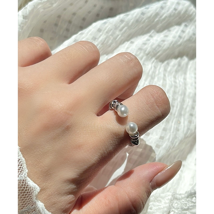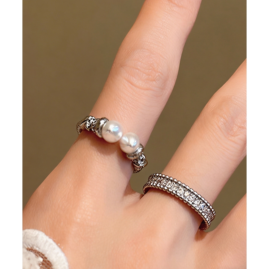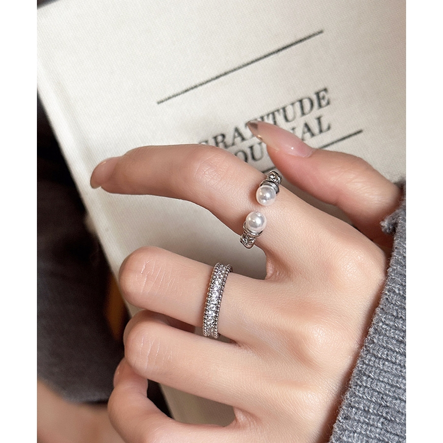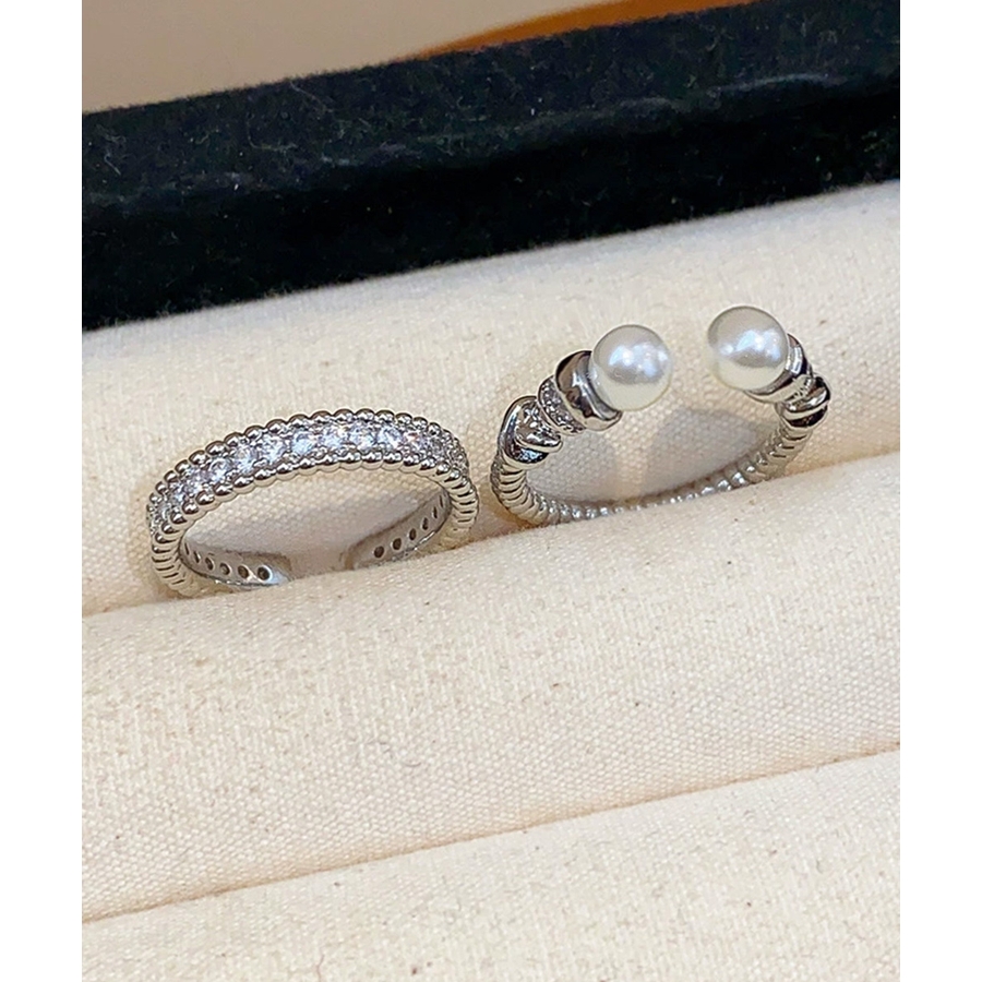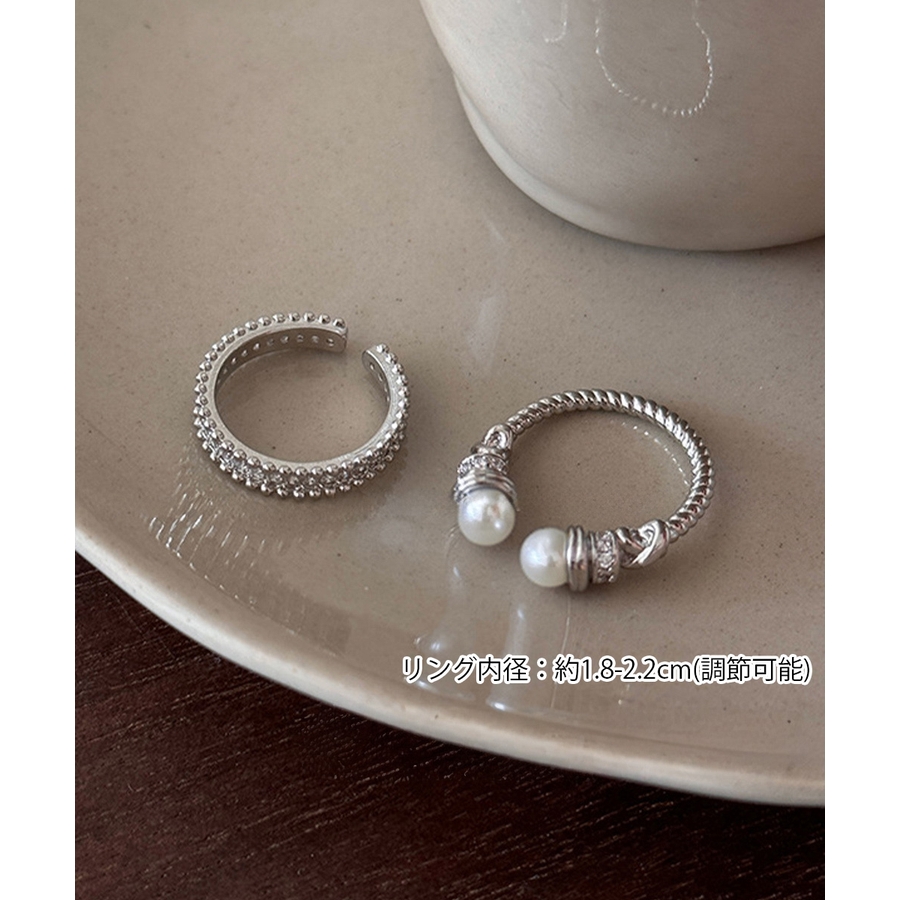 上品なパールときらめくストーンが魅力の、2点セットのオープンリング。