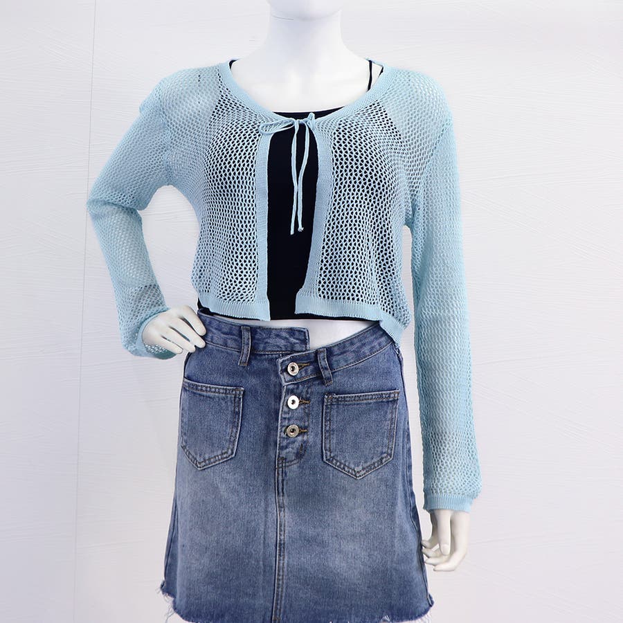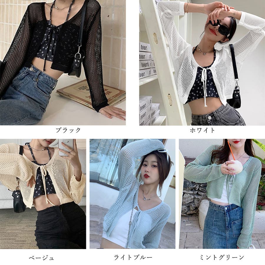 クロップド丈 ニットカーディガン 薄手 透かし編み サマーニット 夏トップス 前開き へそ出し お洒落 韓国風 リボン