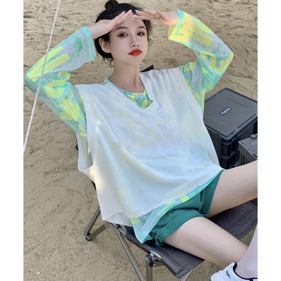 インナーにキャミやチューブトップを合わせるのはもちろん、ノースリーブTシャツの中に着て袖だけ見せるコーデもおすすめ