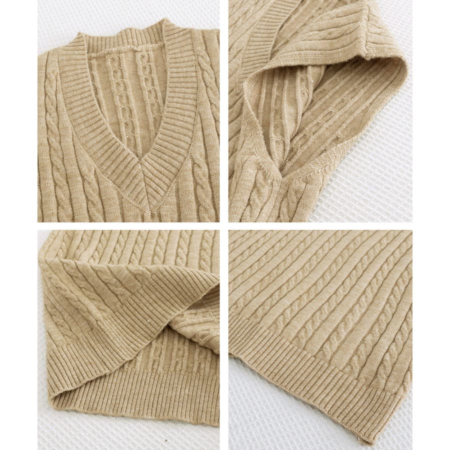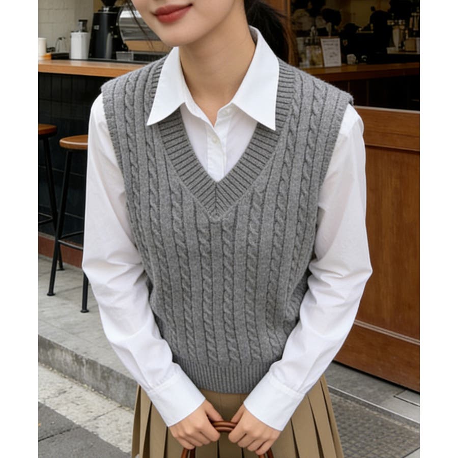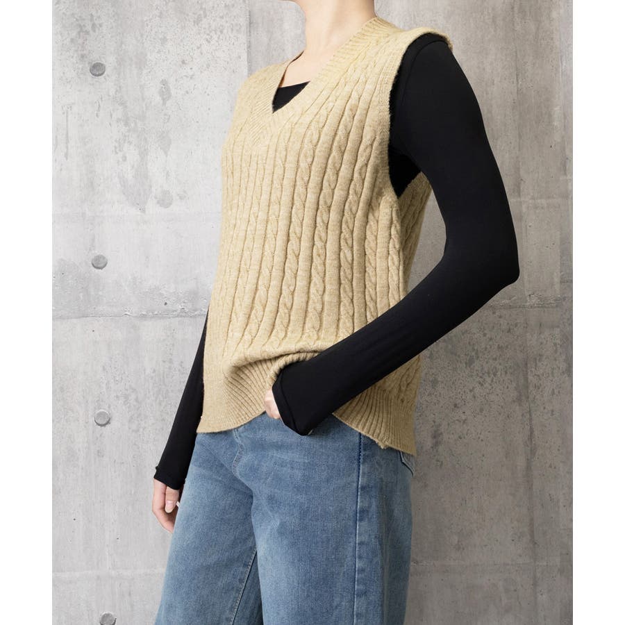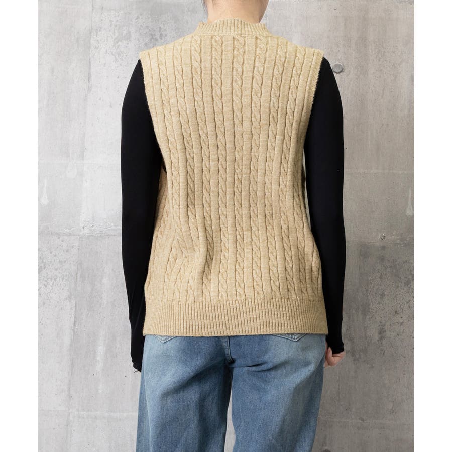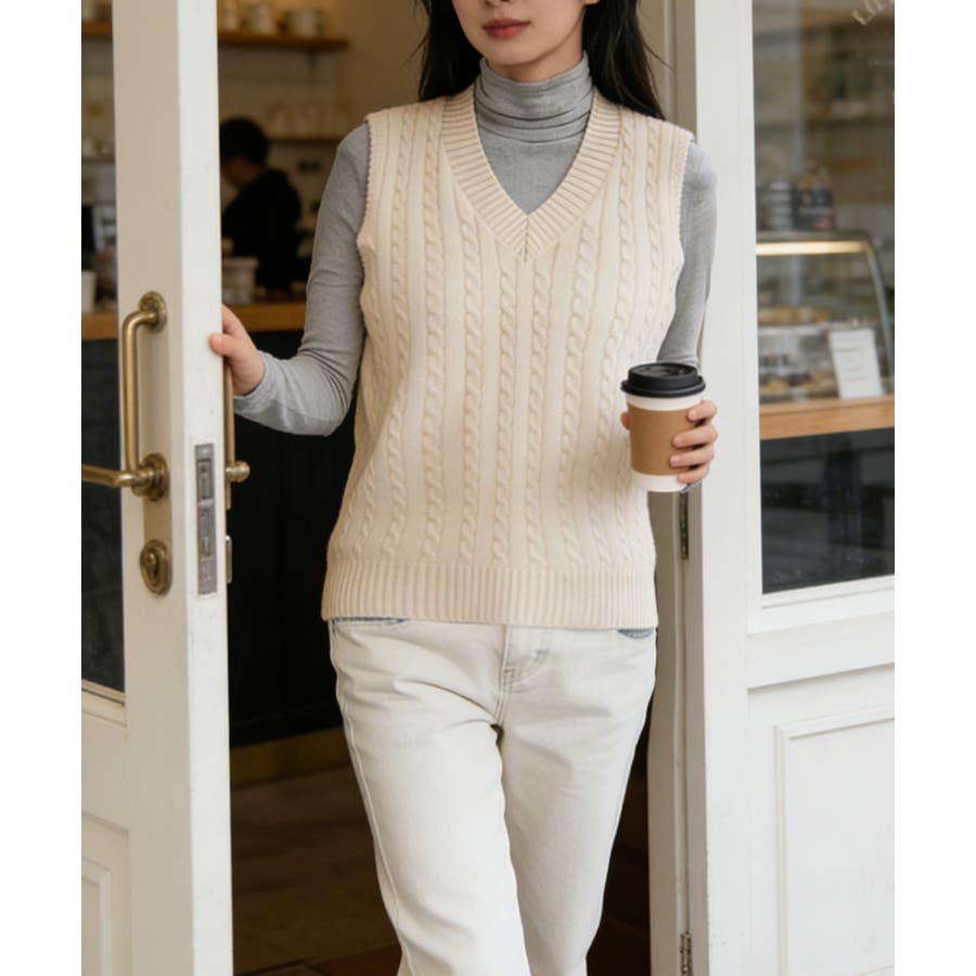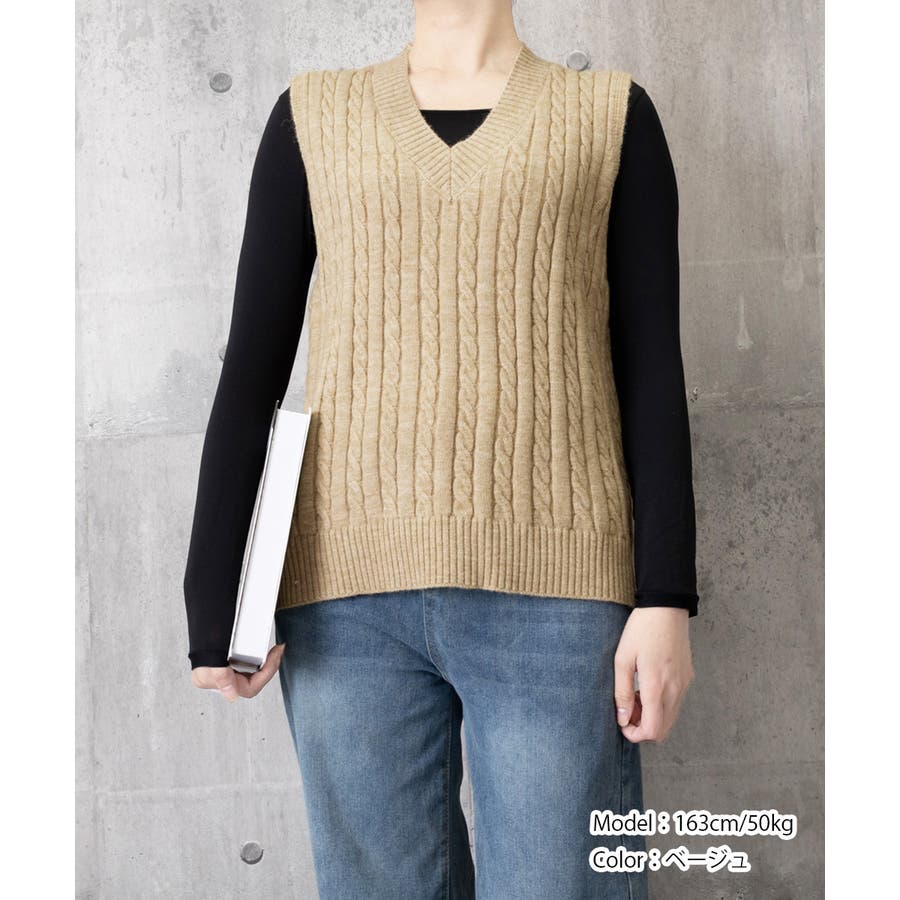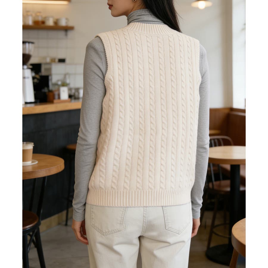 立体感のあるケーブル編みが特徴のVネックニットベスト。