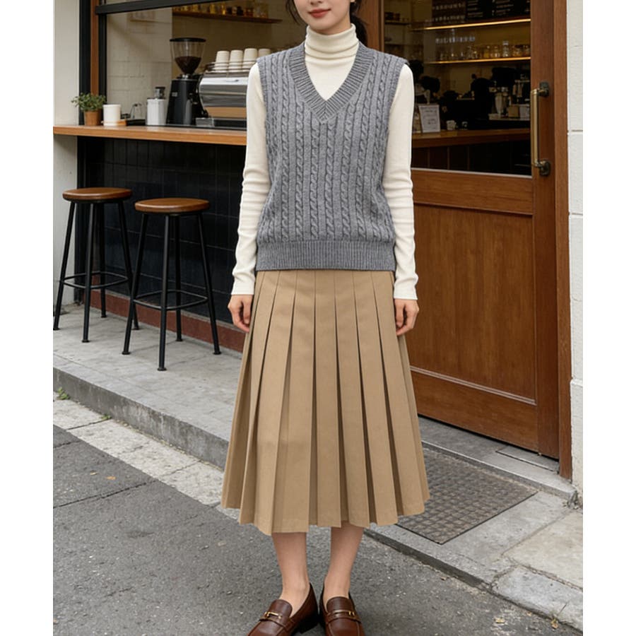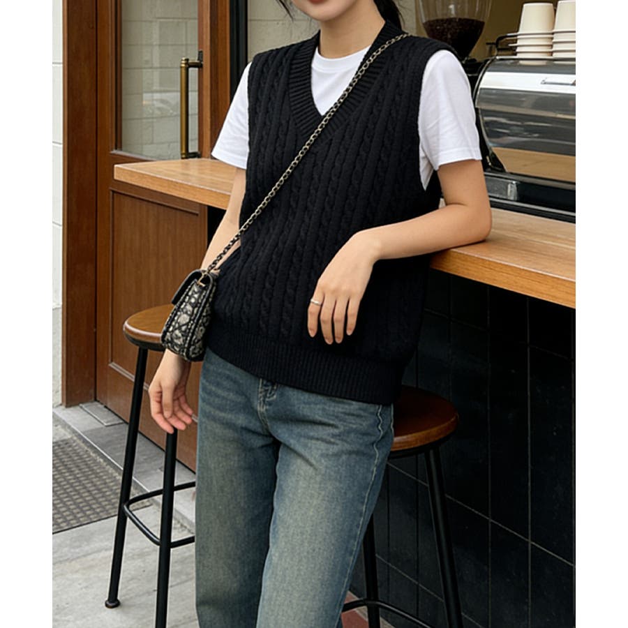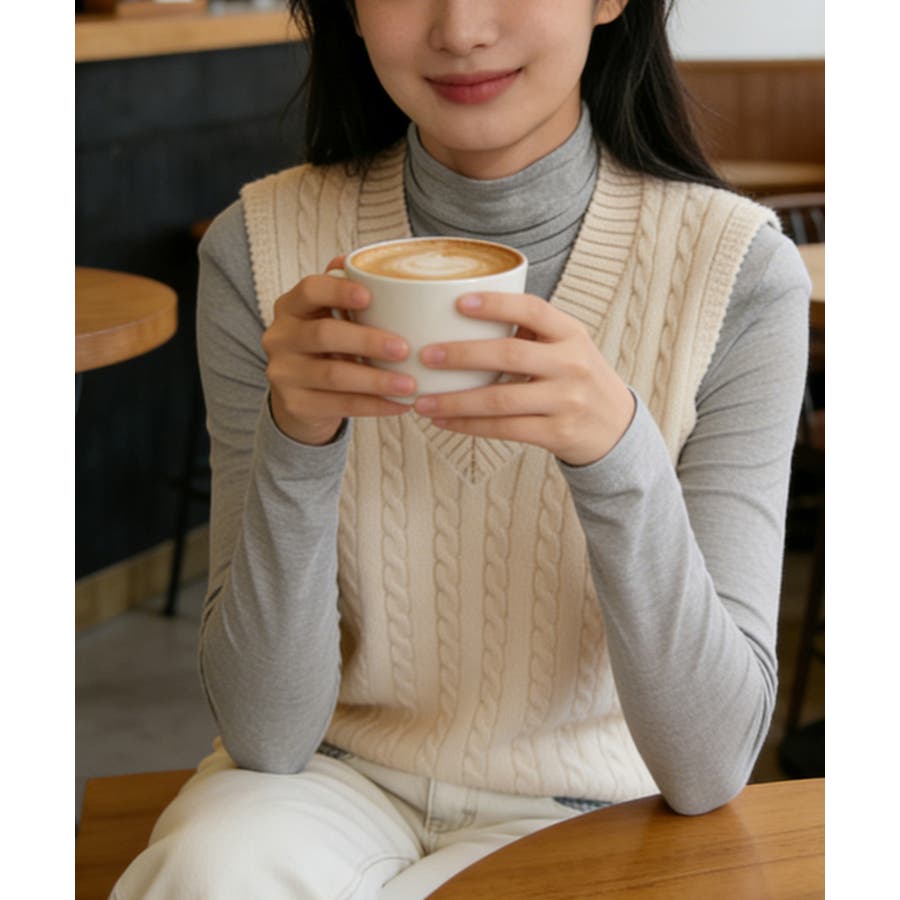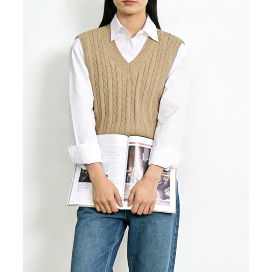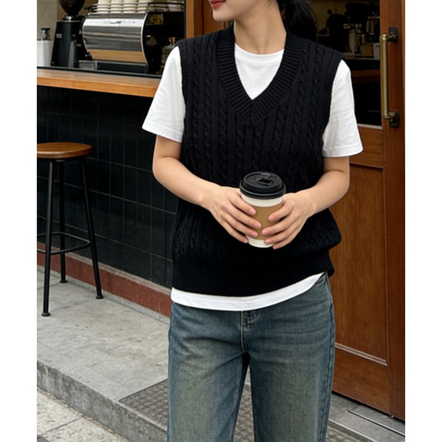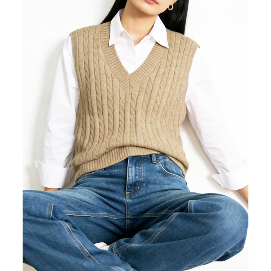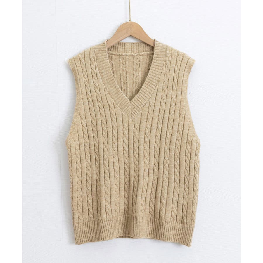 立体感のあるケーブル編みが特徴のVネックニットベスト。