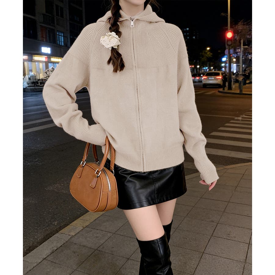 ニットジップパーカー フード付きニットカーデ 長袖ニットトップス