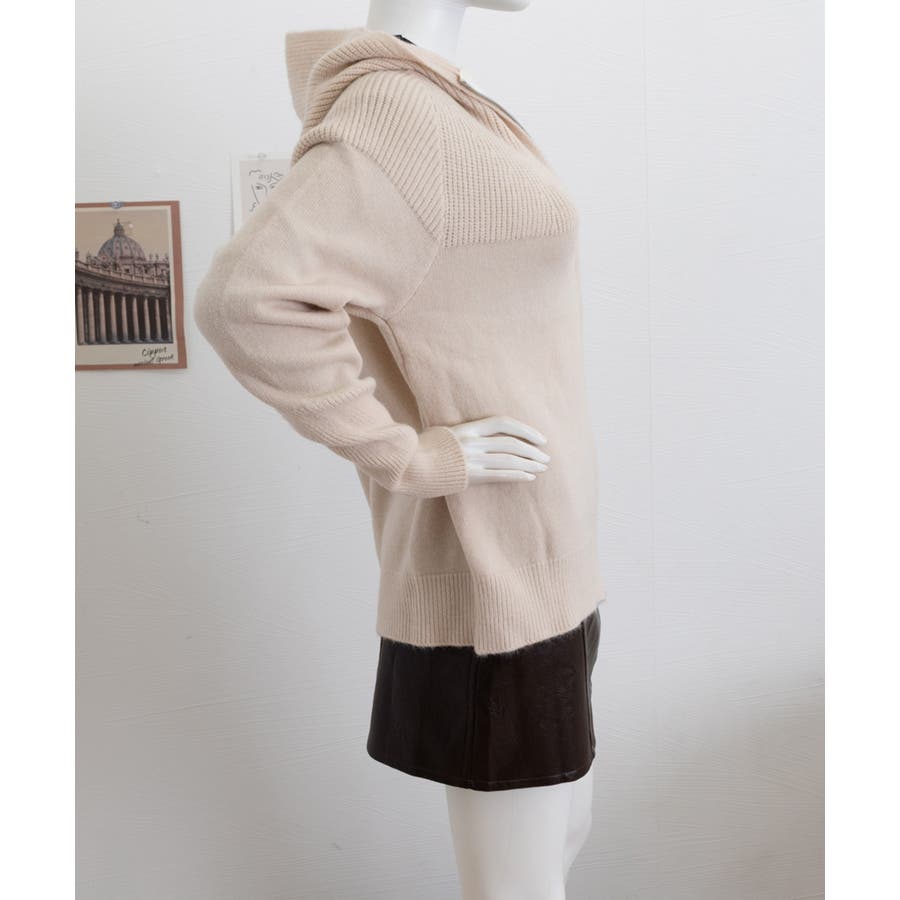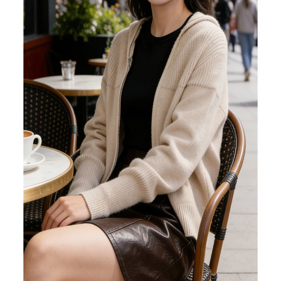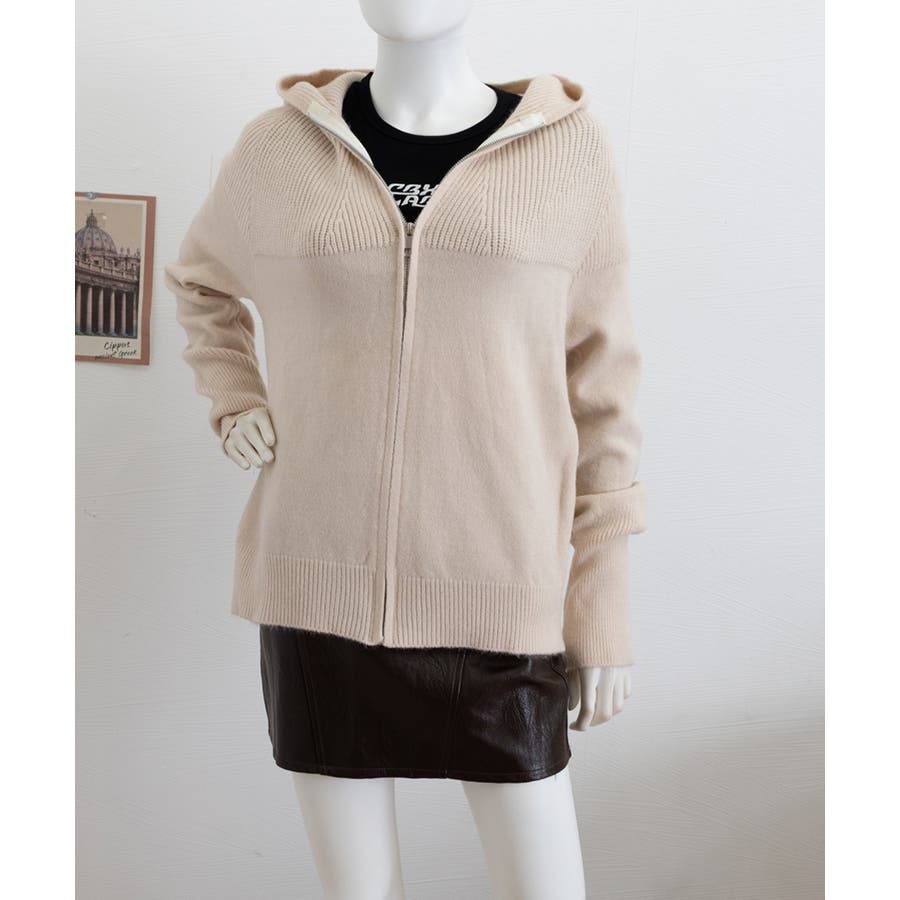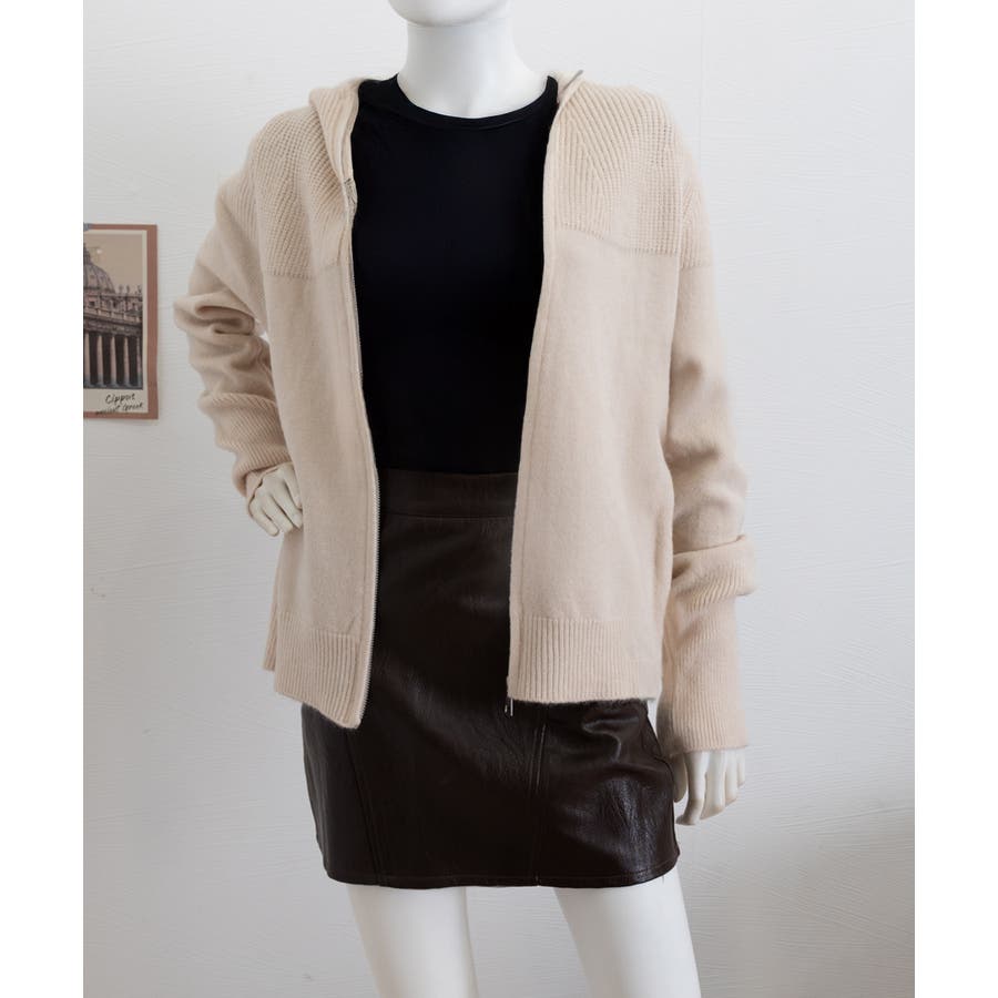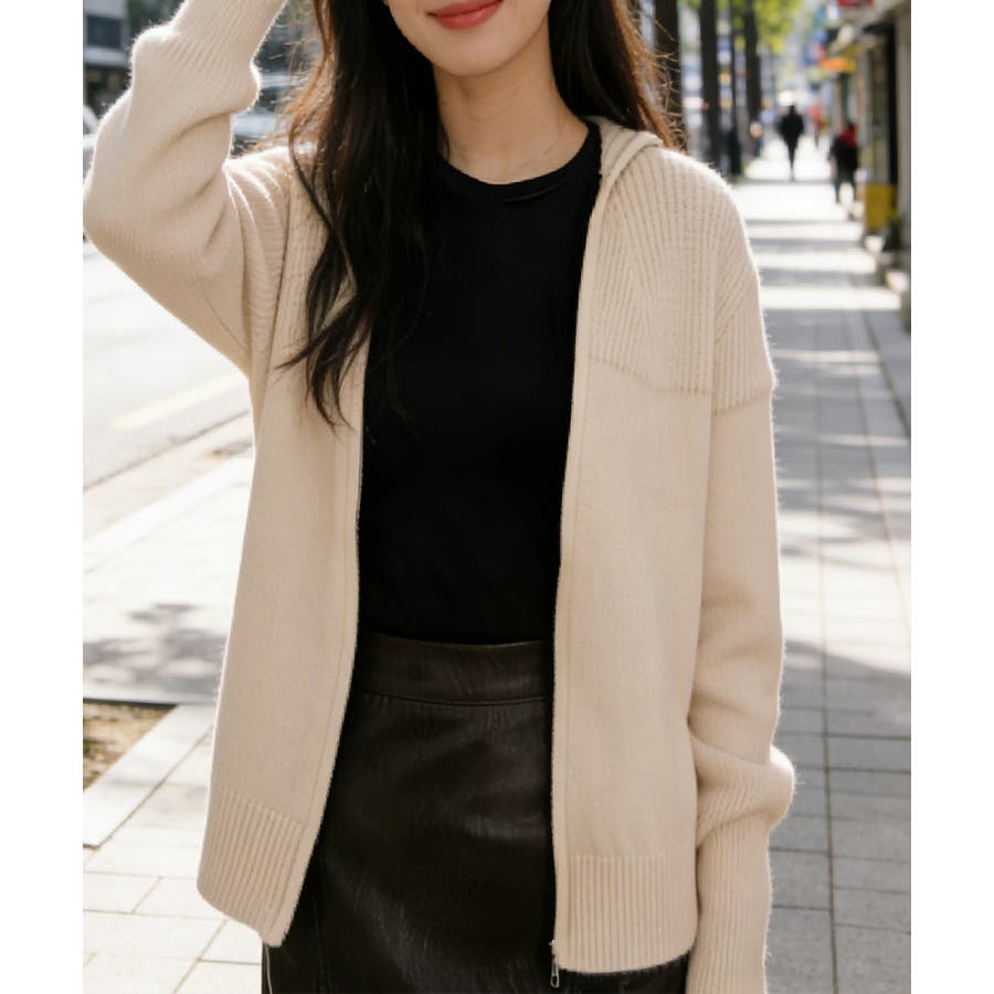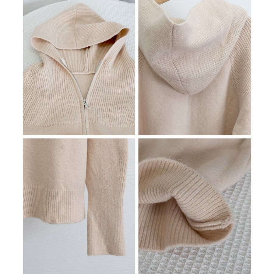 フード付きデザインがポイントのジップアップニットパーカー。
