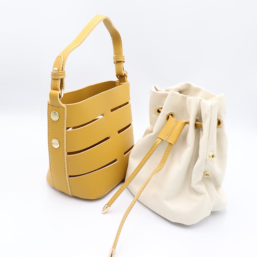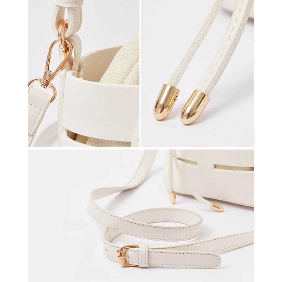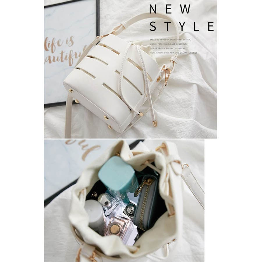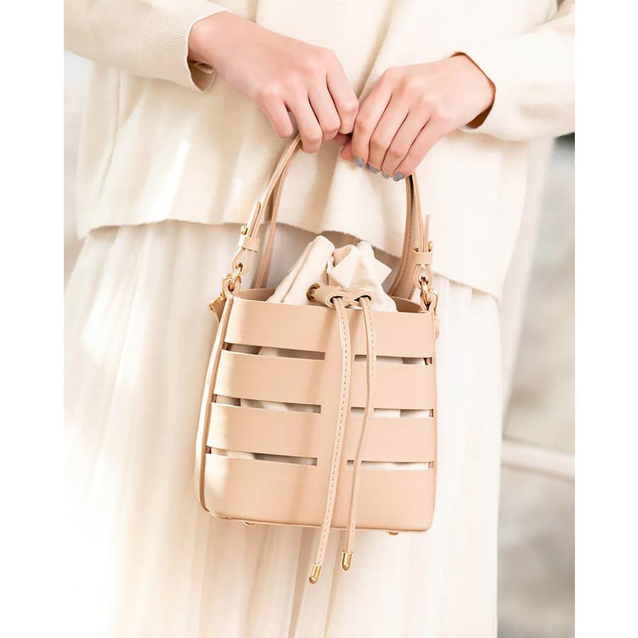 生地はしっかりとした厚みで上質なフェイクレザーで仕上げた透かしのバケツ型ショルダーバッグ。