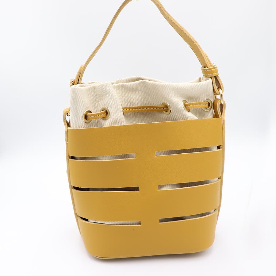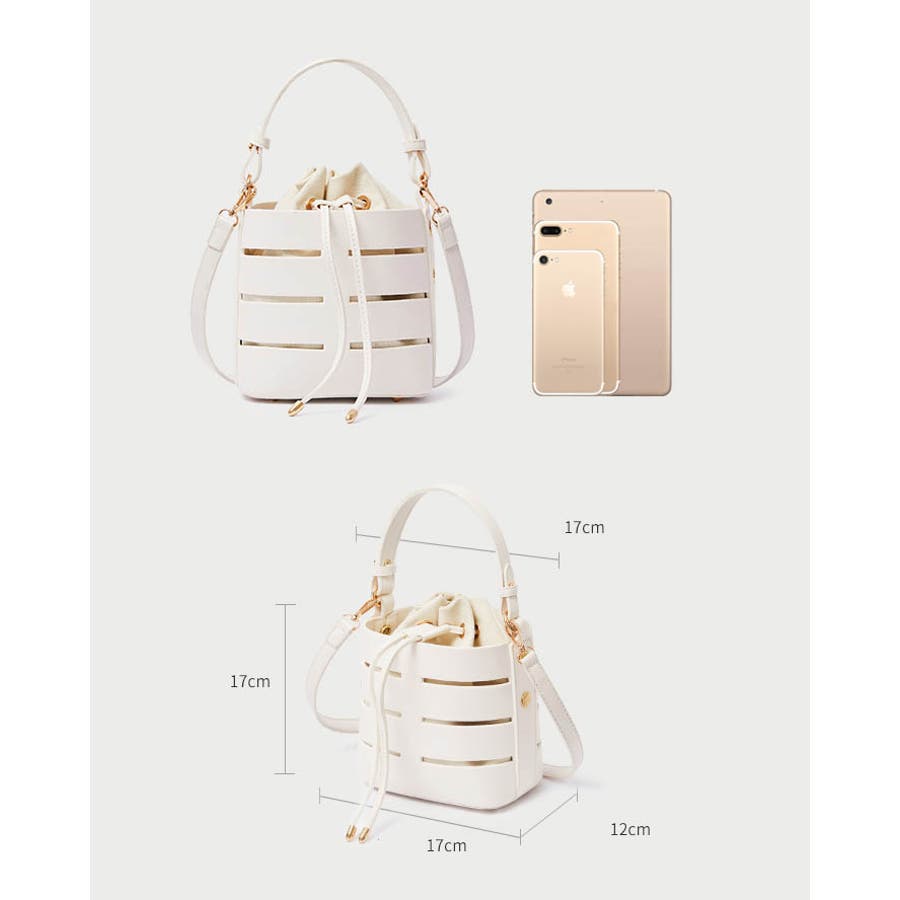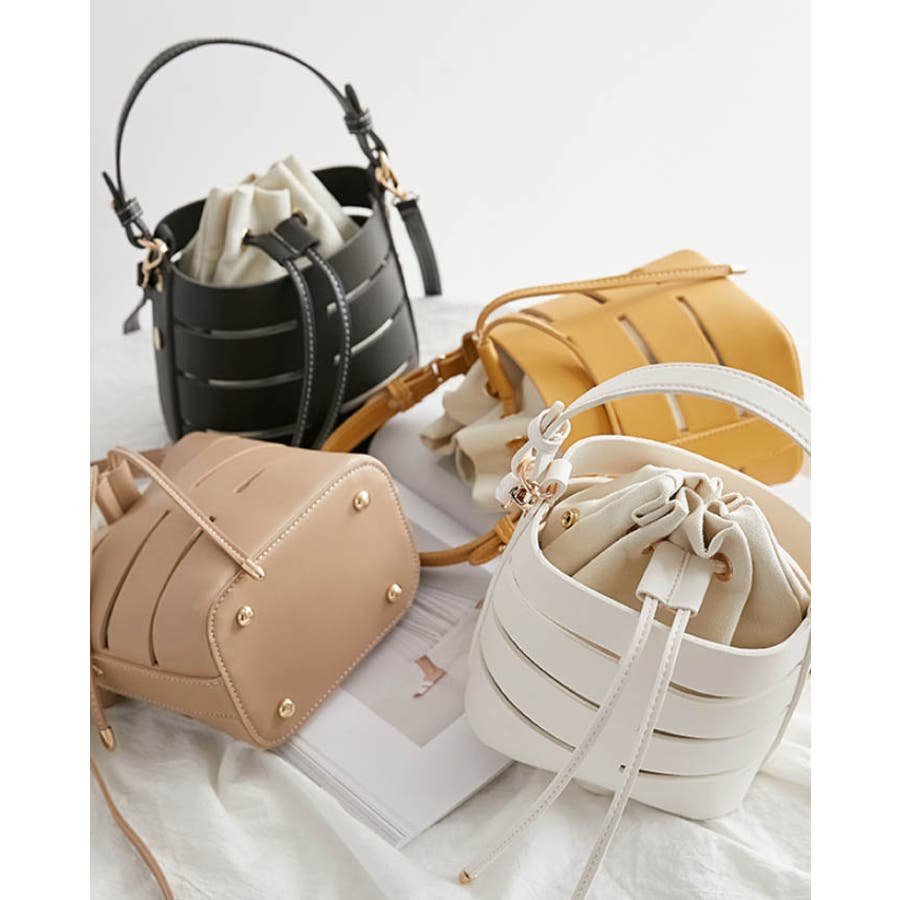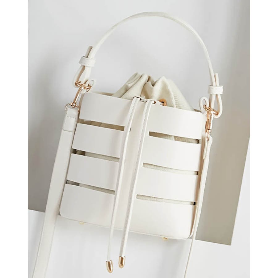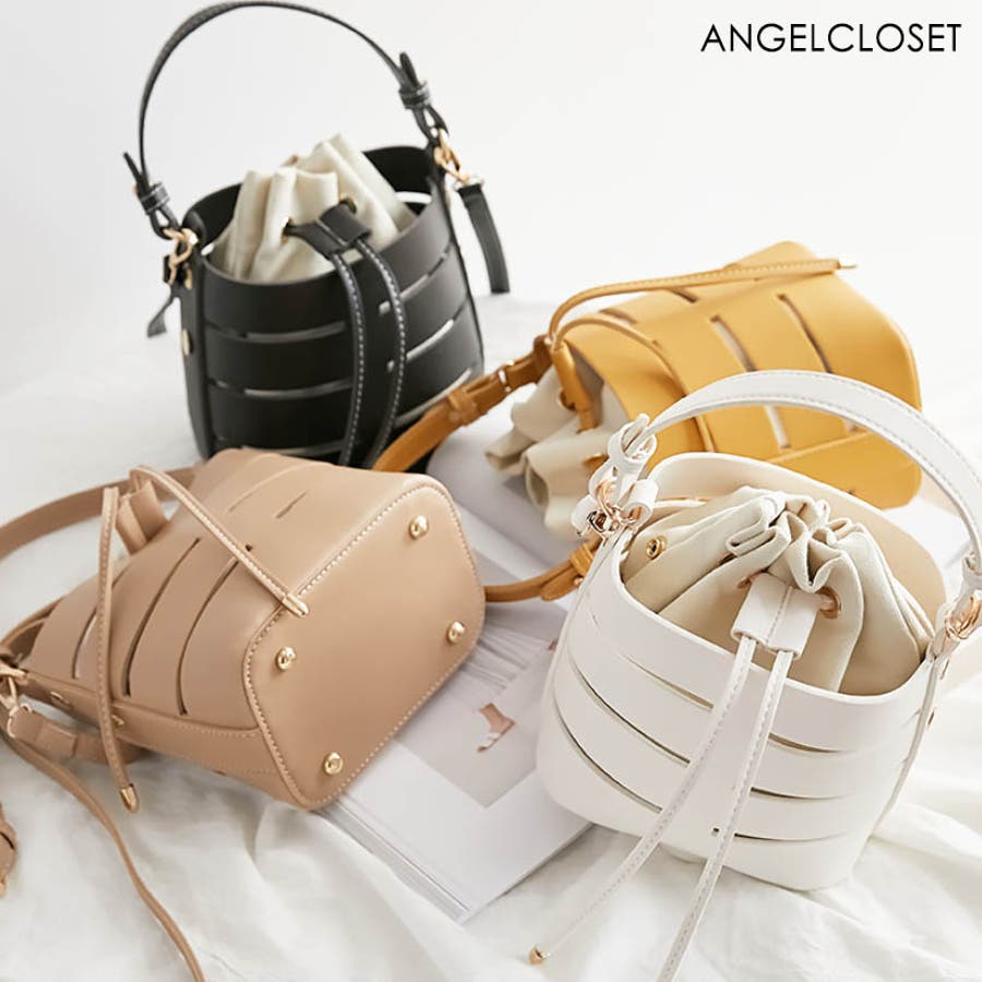 生地はしっかりとした厚みで上質なフェイクレザーで仕上げた透かしのバケツ型ショルダーバッグ。