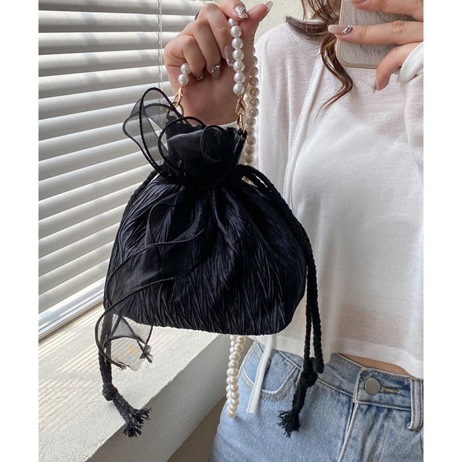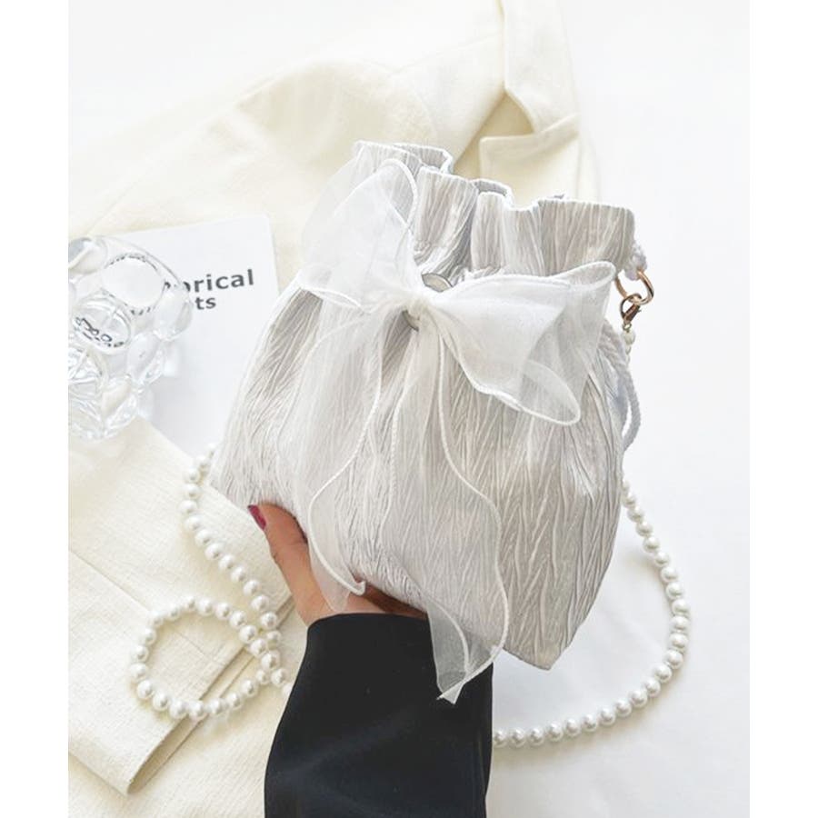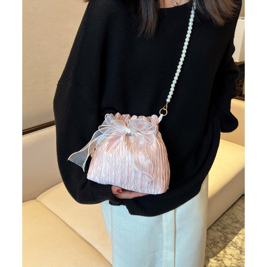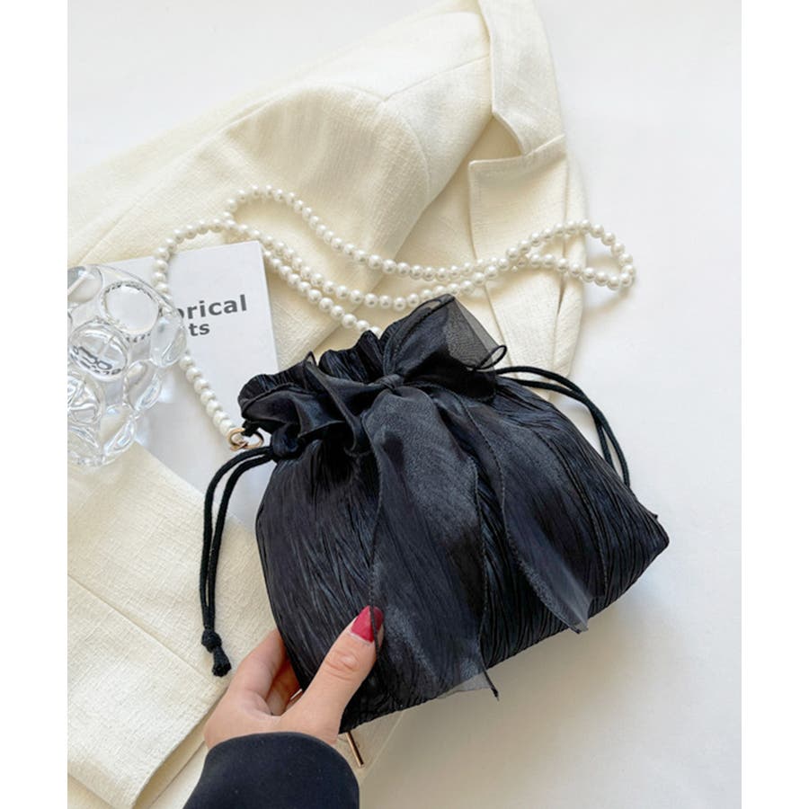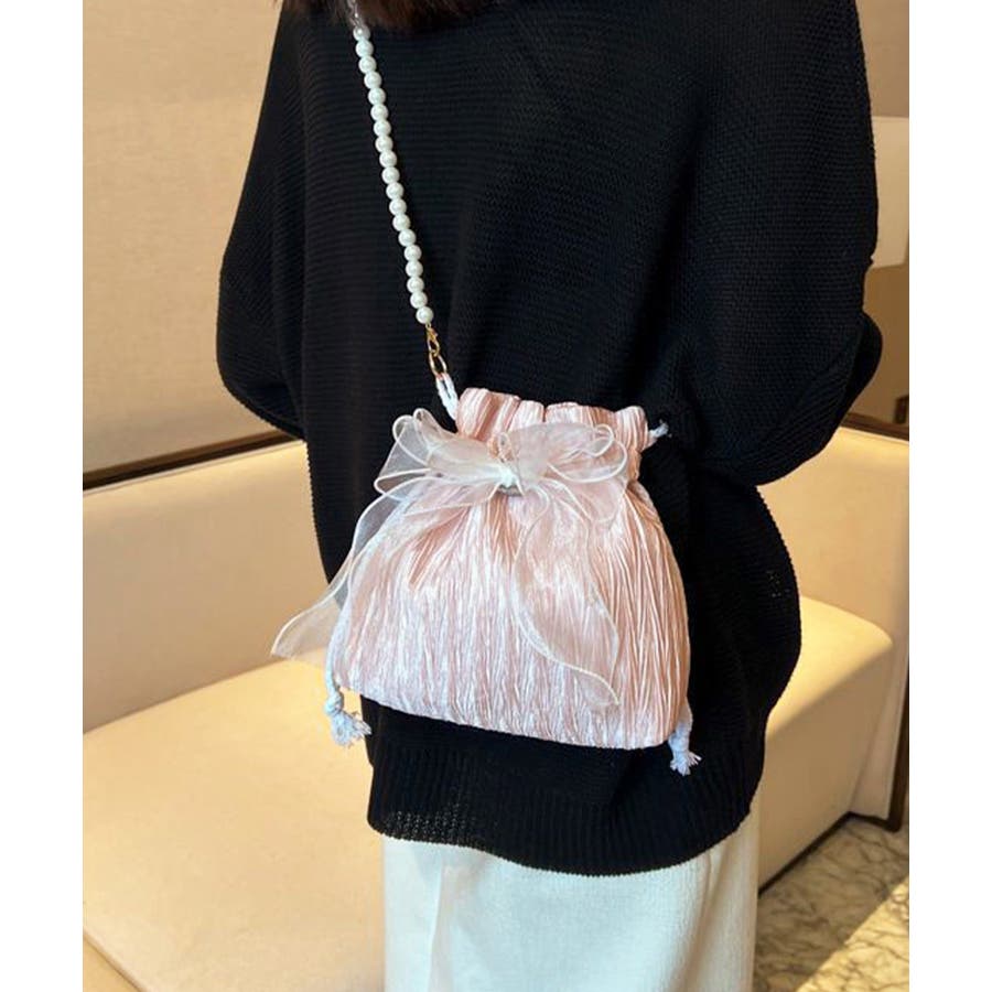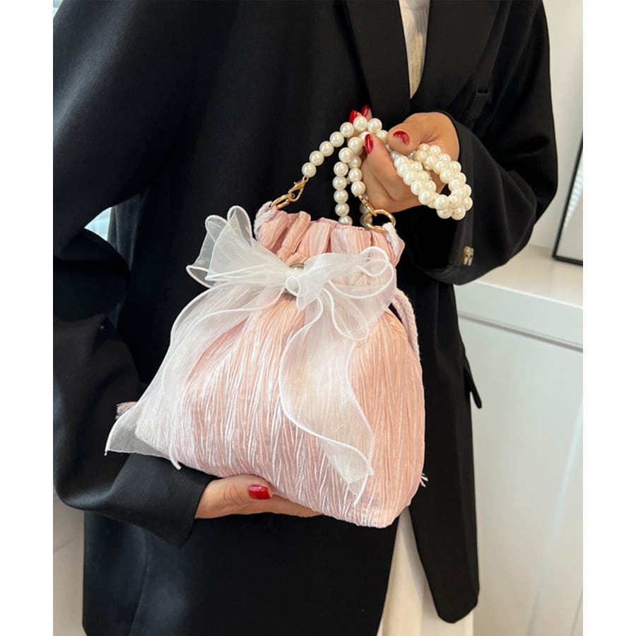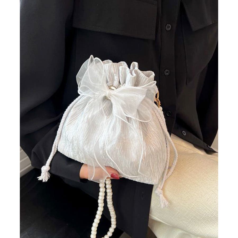今季トレンドのパールショルダー&リボンモチーフの巾着ショルダーバッグ