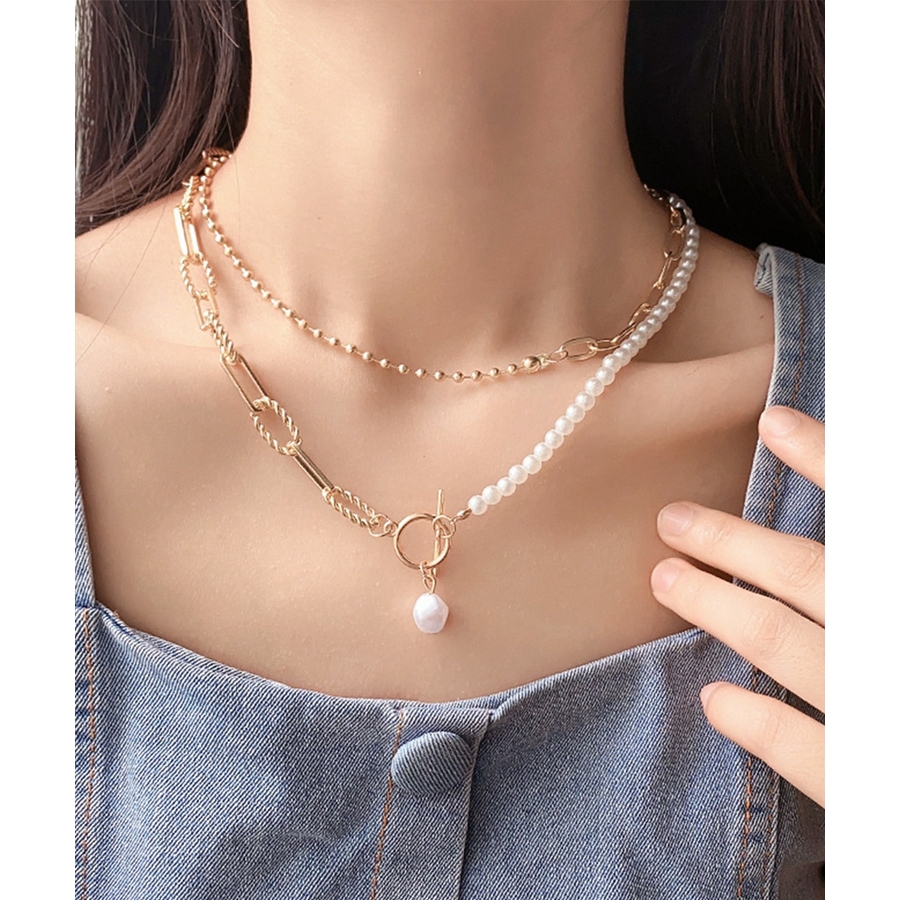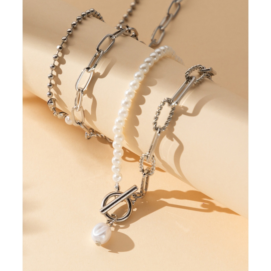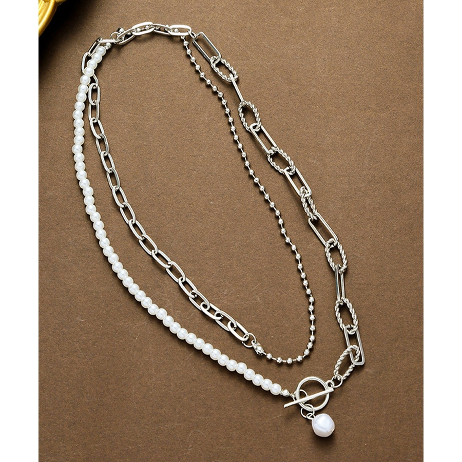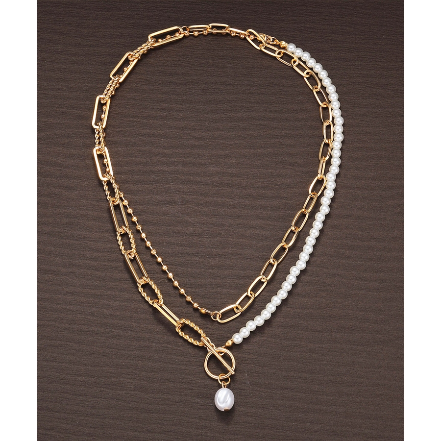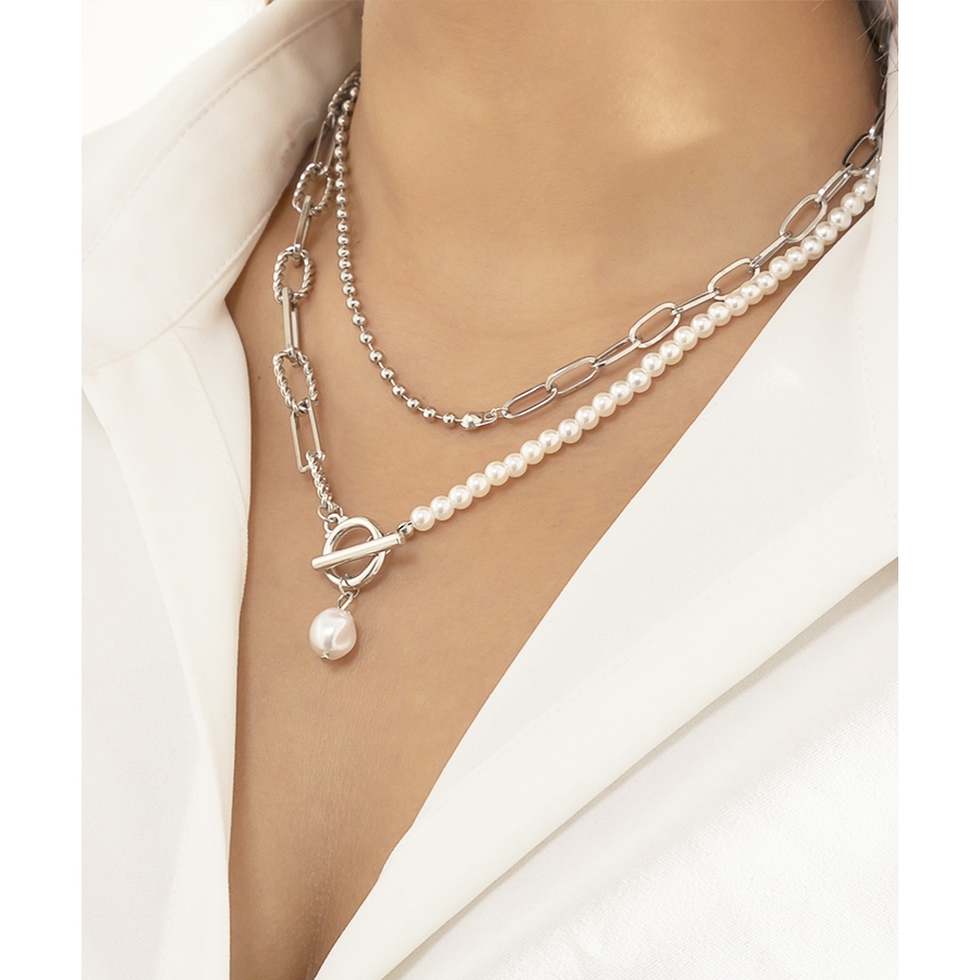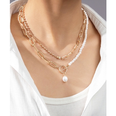 上品な小粒パールと存在感のある太めチェーンが調和し、スタイルに洗練された印象を添える。