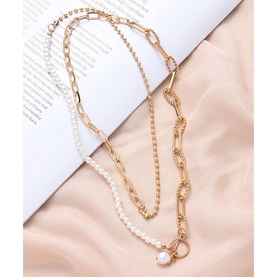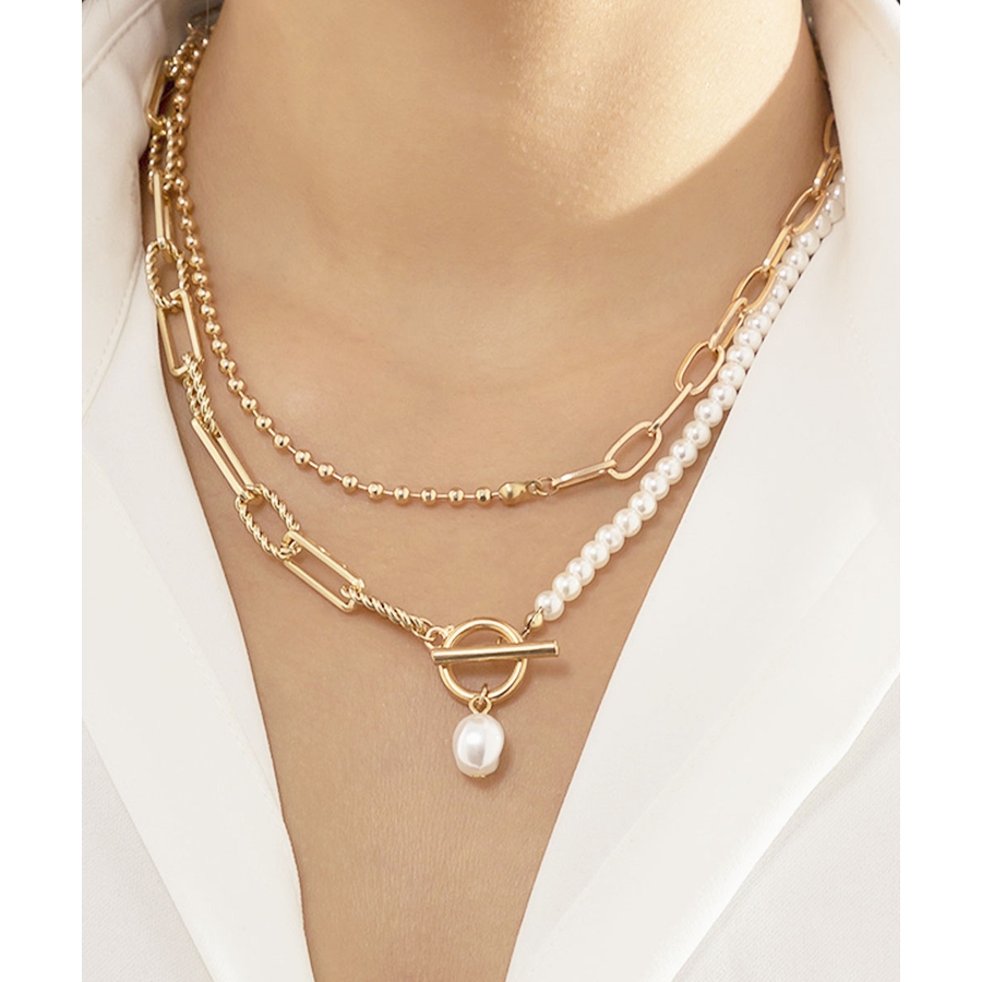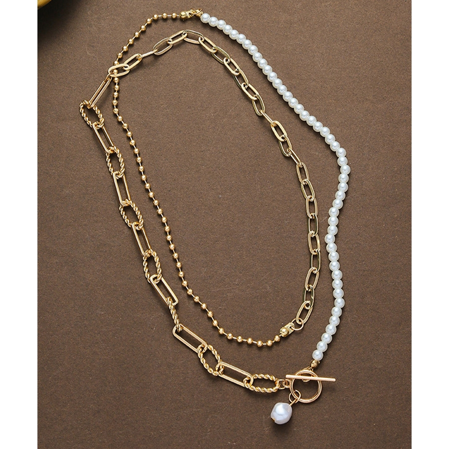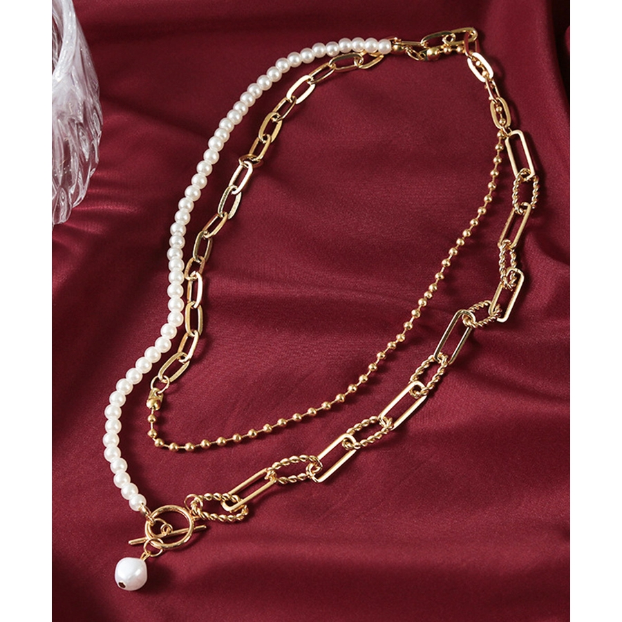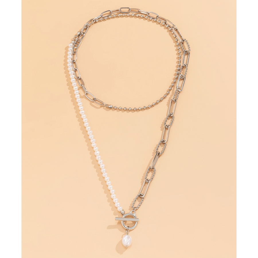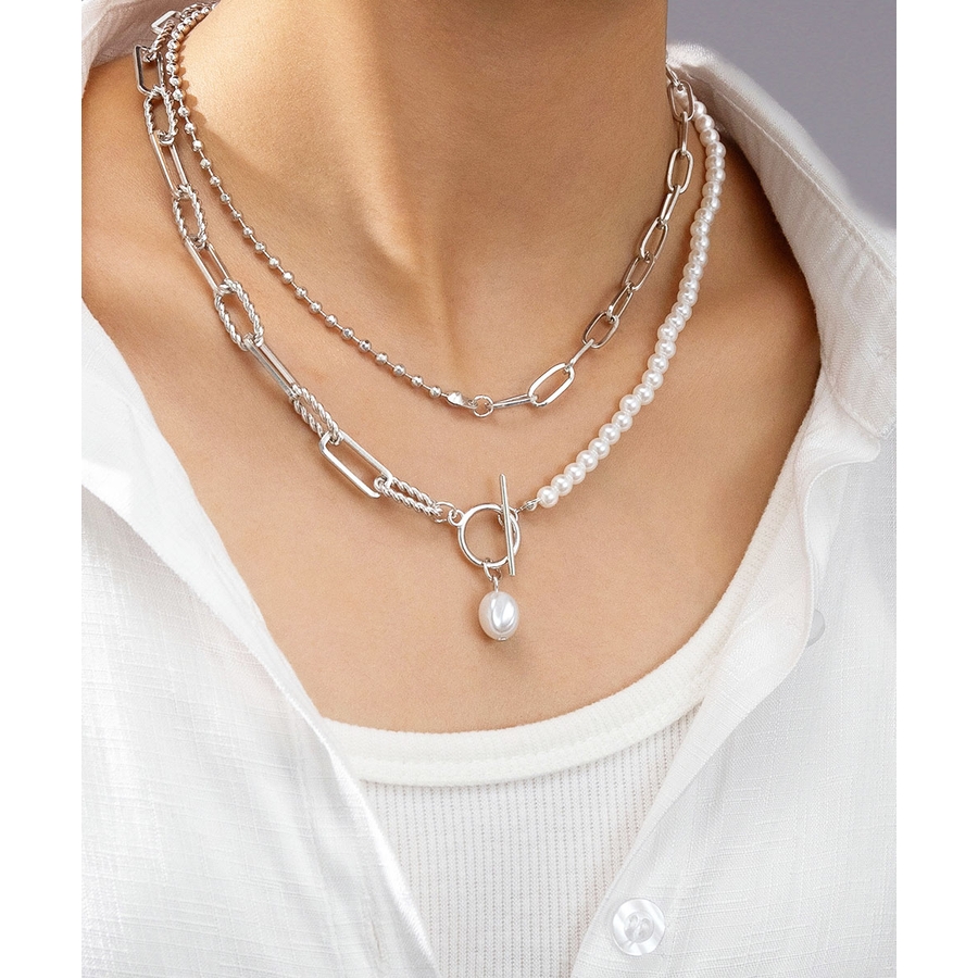 上品な小粒パールと存在感のある太めチェーンが調和し、スタイルに洗練された印象を添える。
