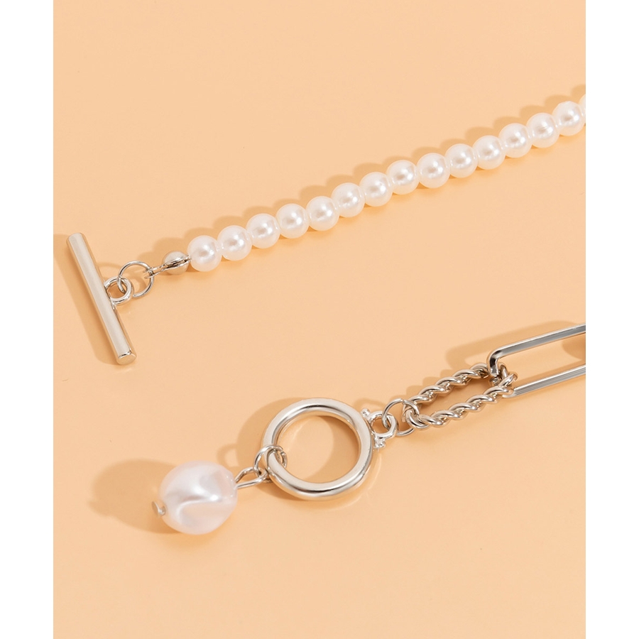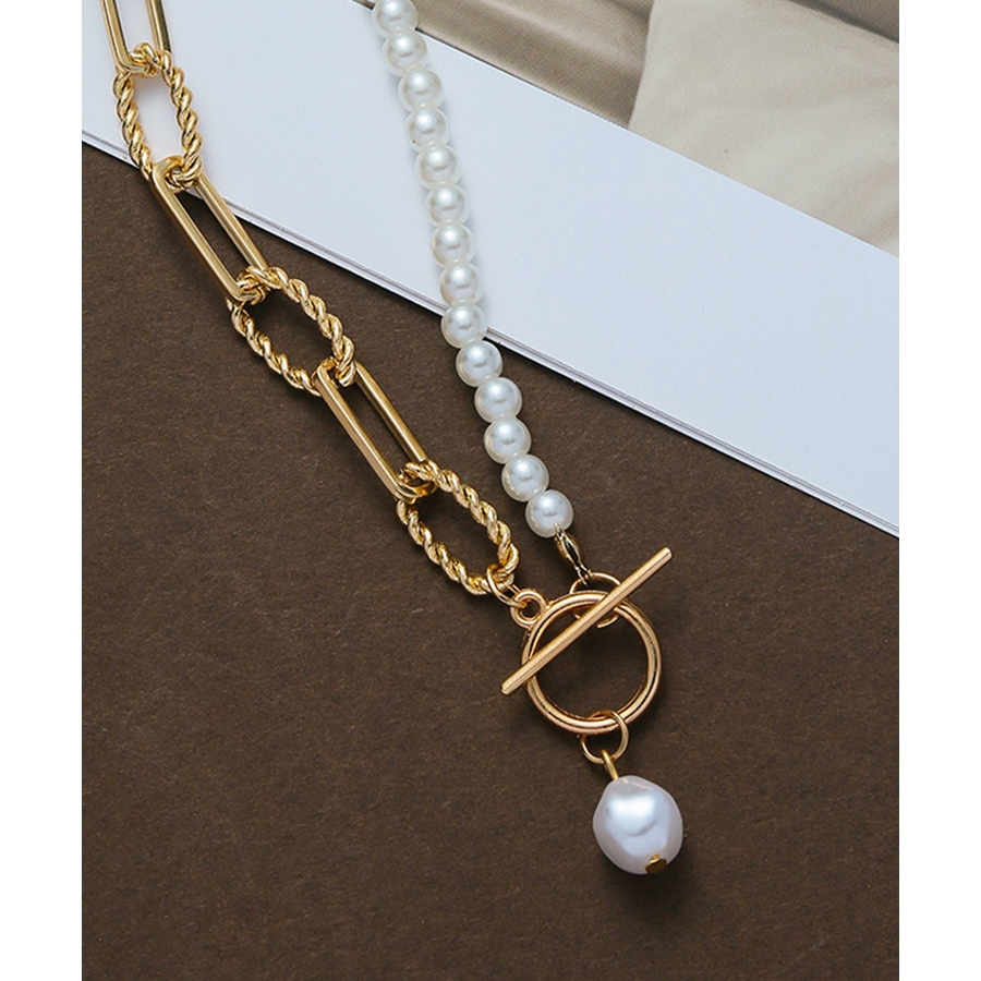 異素材を組み合わせたアシンメトリーデザインのパール×チェーンネックレス。