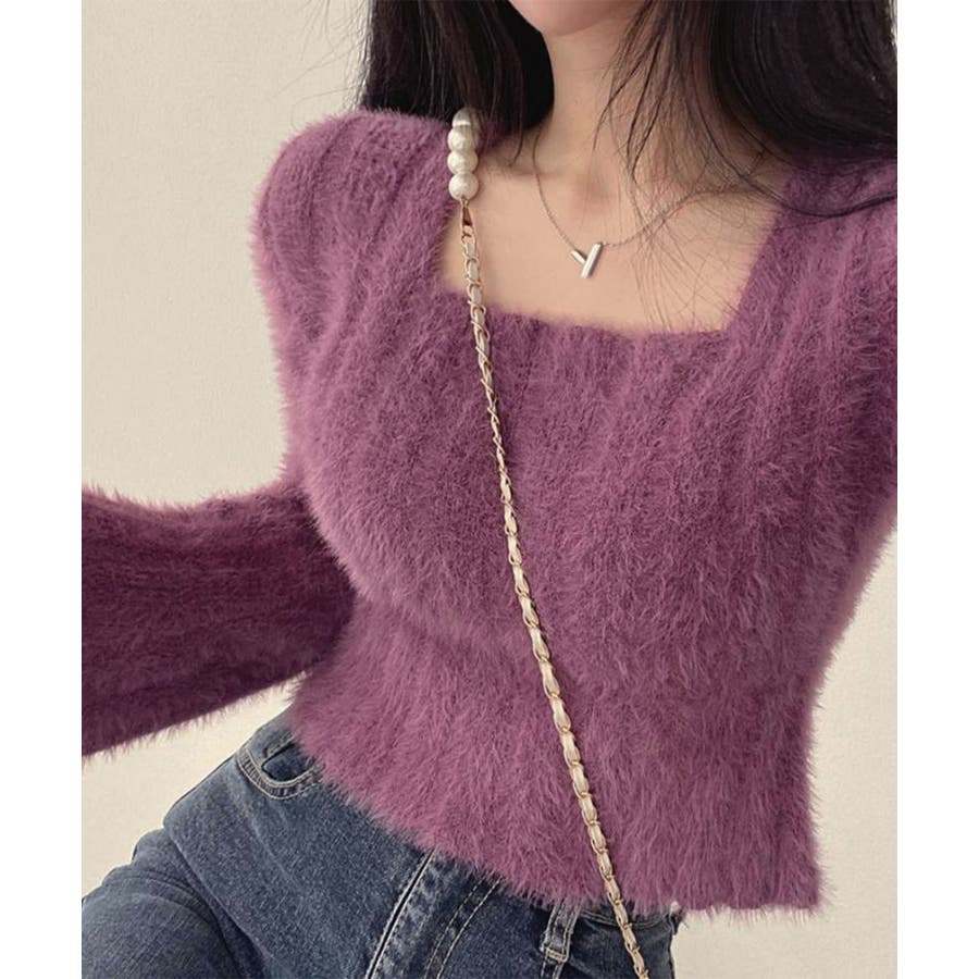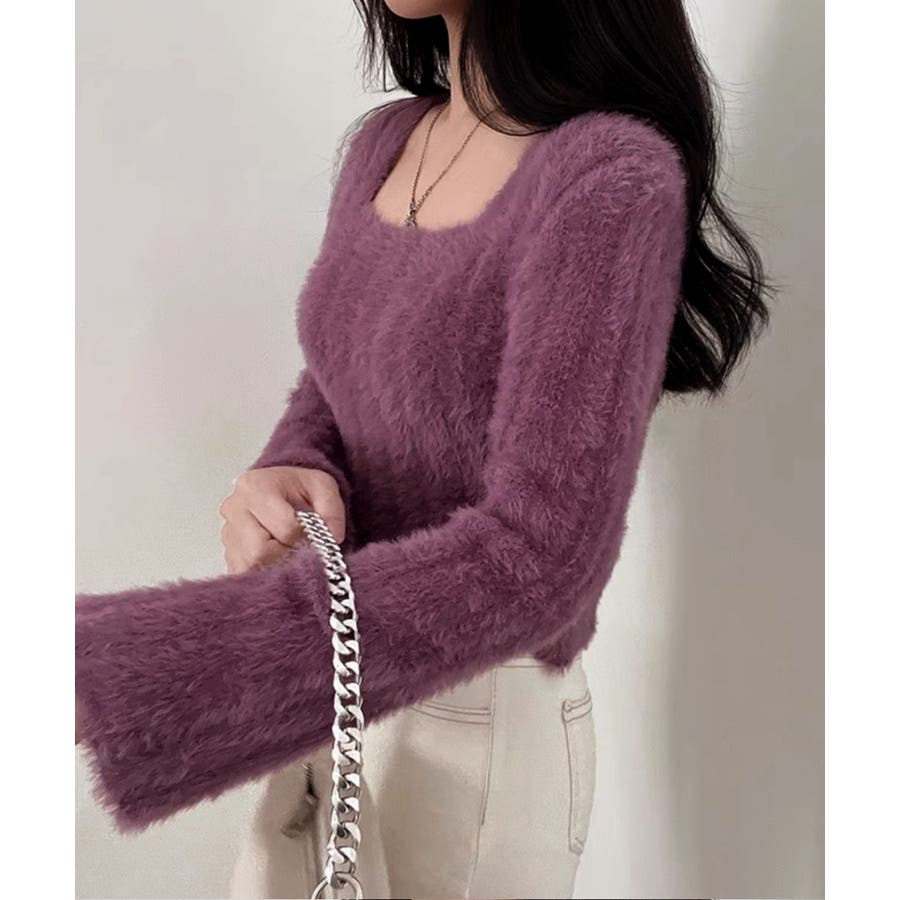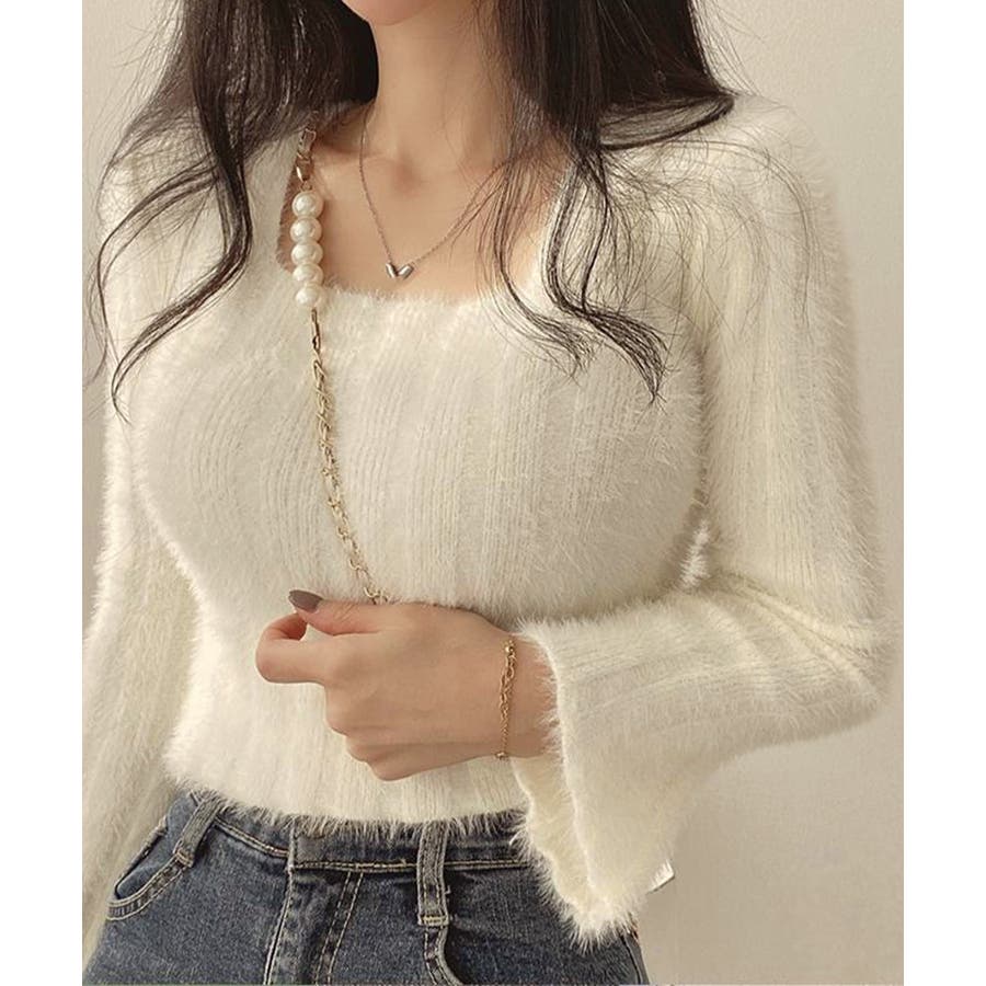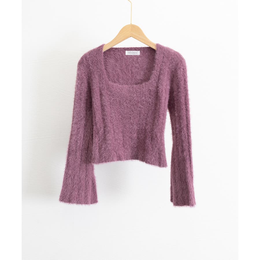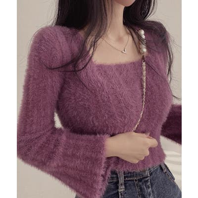 レディース ふわふわニットプルオーバー フレア袖 ニットセーター スクエアネック 大人可愛い 無地 柔らかいニット 秋冬